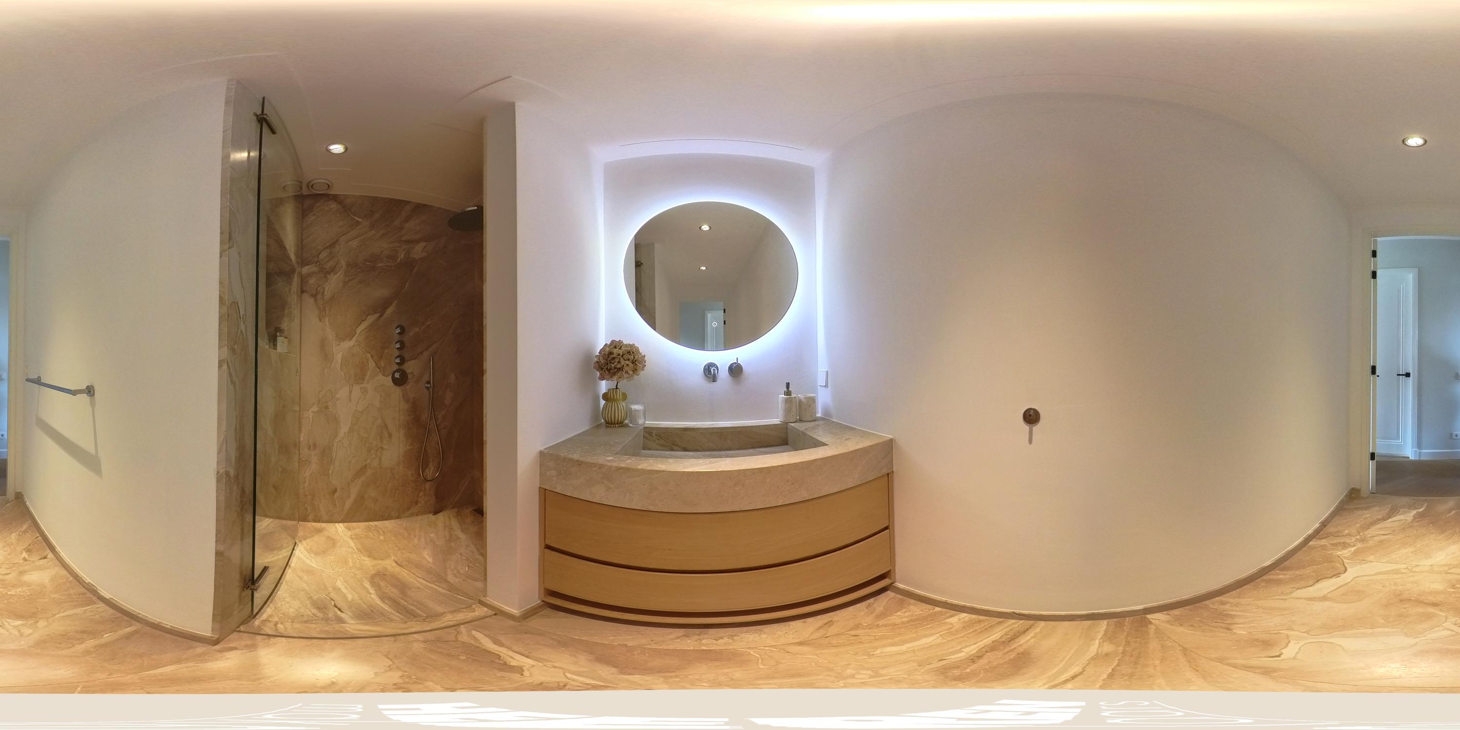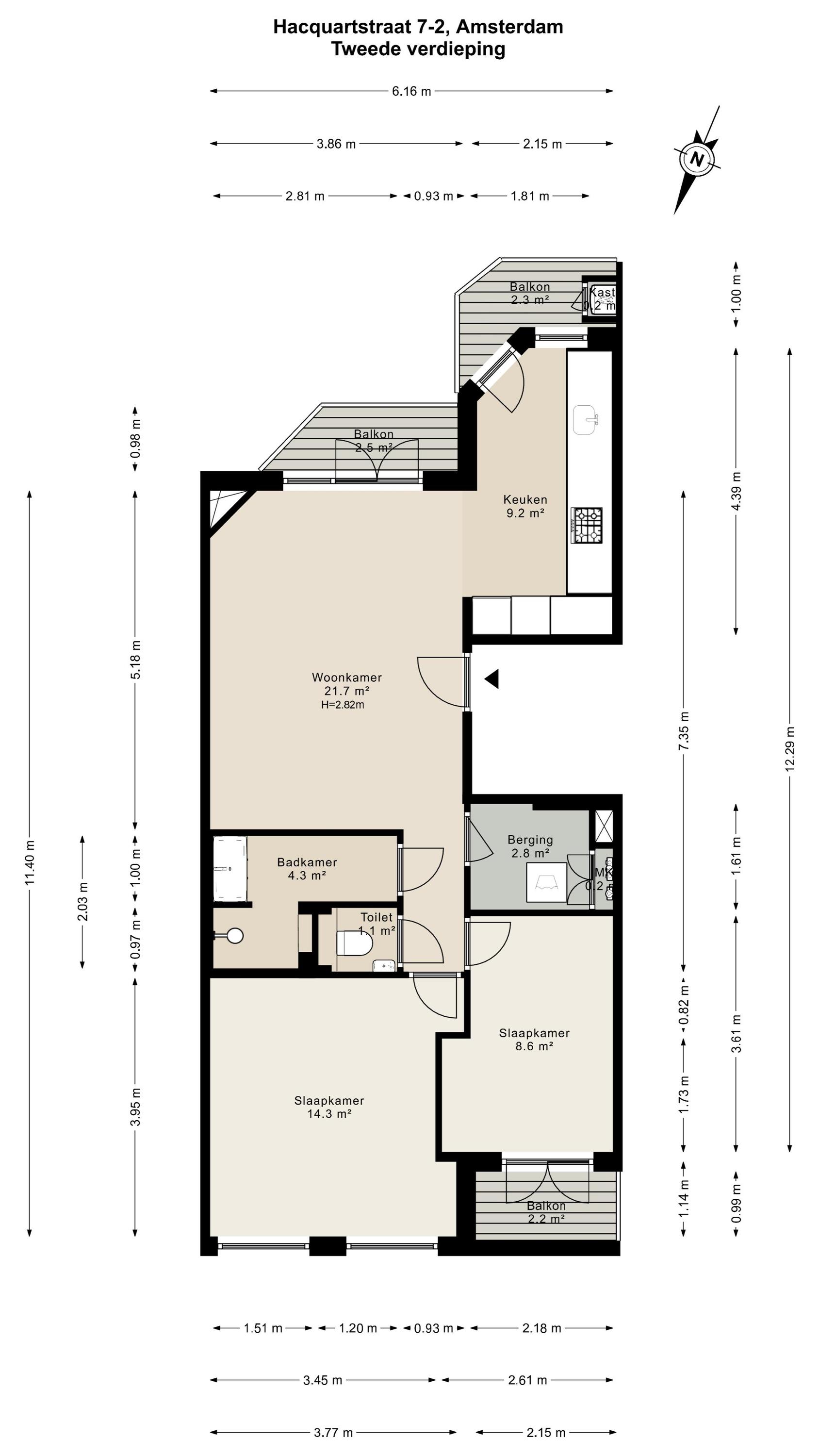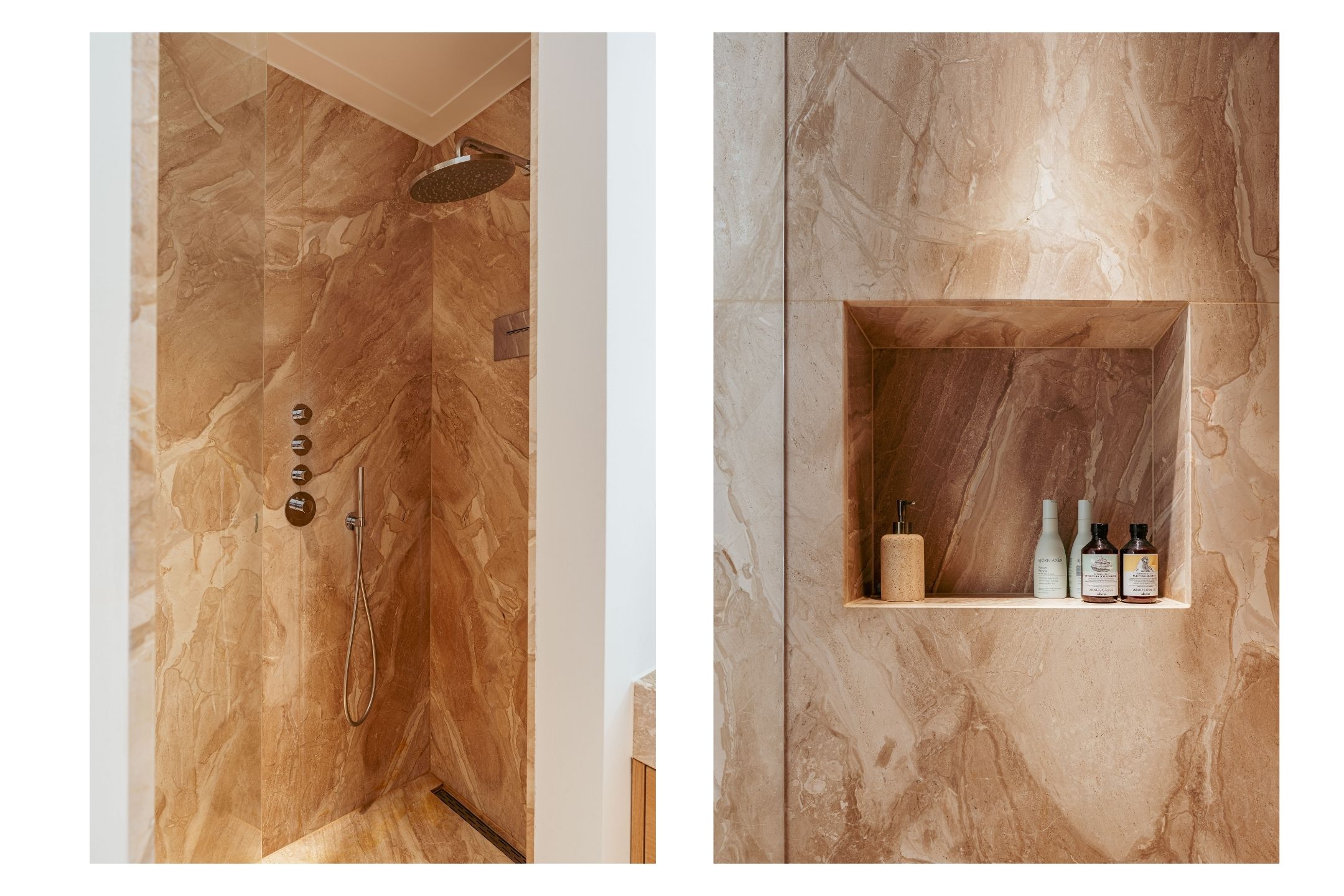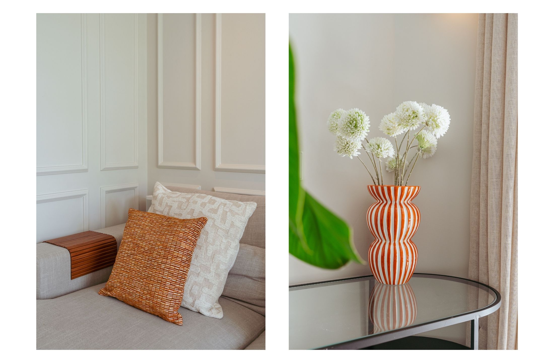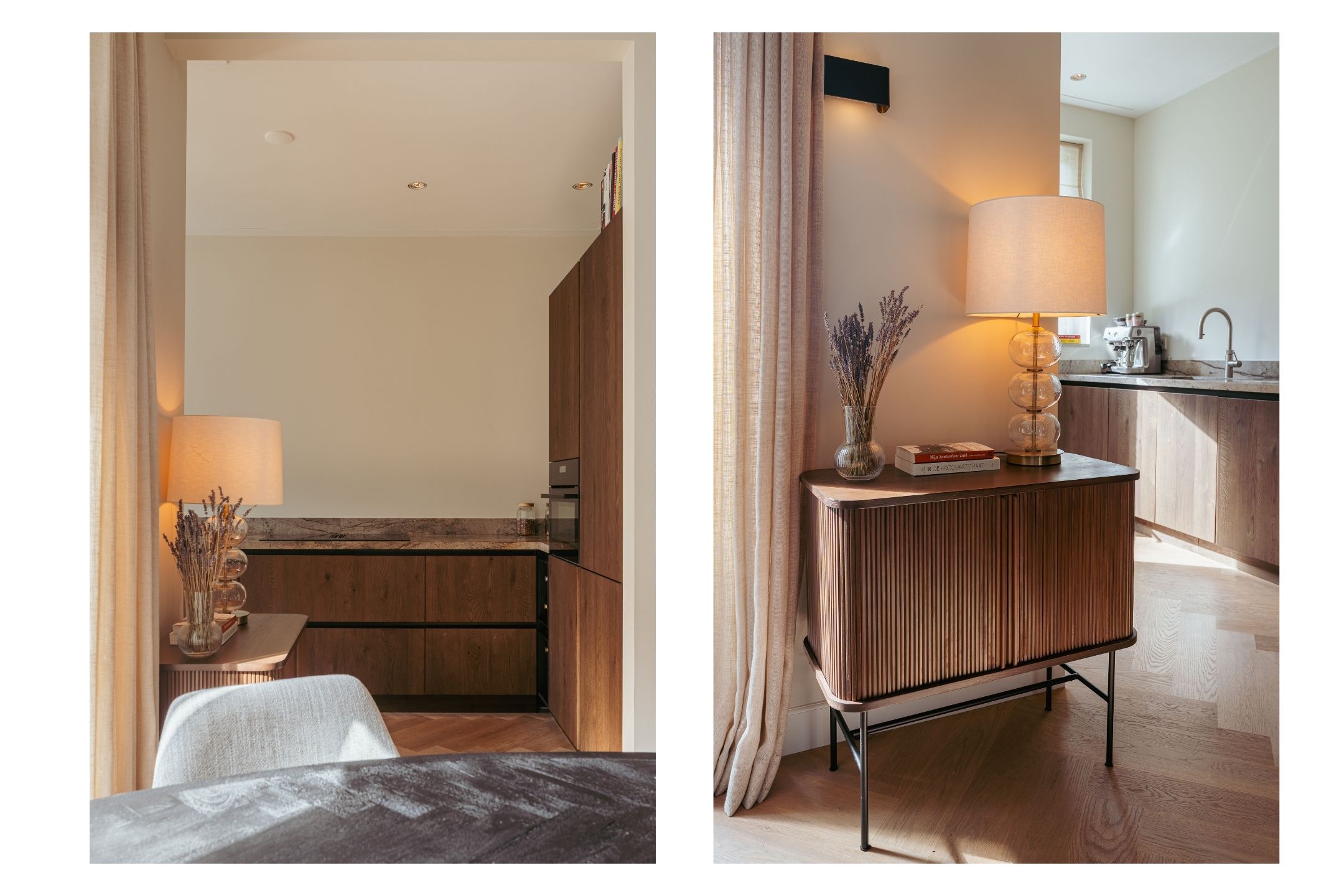 تم تصميم المساحة الداخلية البالغة 66 م² لتحقيق الهدوء والانسيابية. يفضي المدخل، الذي يتم الوصول إليه عبر درج مشترك وحديقة أمامية خضراء، إلى غرفة معيشة مشرقة تتميز بزخارف أنيقة على السقف وإضاءة جدارية مصممة خصيصًا. تتصل الشرفة الثلاثة بين الداخل والخارج، اثنتان منها تواجه الجنوب في الخلف وواحدة تواجه الشمال الغربي للاستمتاع بضوء المساء، بمساحة إجمالية خارجية تبلغ 7 م². المطبخ شبه المفتوح يجسد دقة المواد، مرتكزًا على سطح عمل من الرخام وأجهزة مدمجة تشمل موقد تحريض، وQuooker، وشفاط مدمج بالسطح.