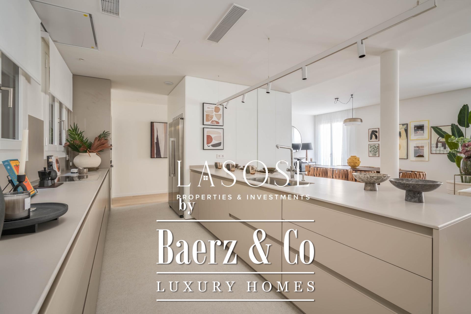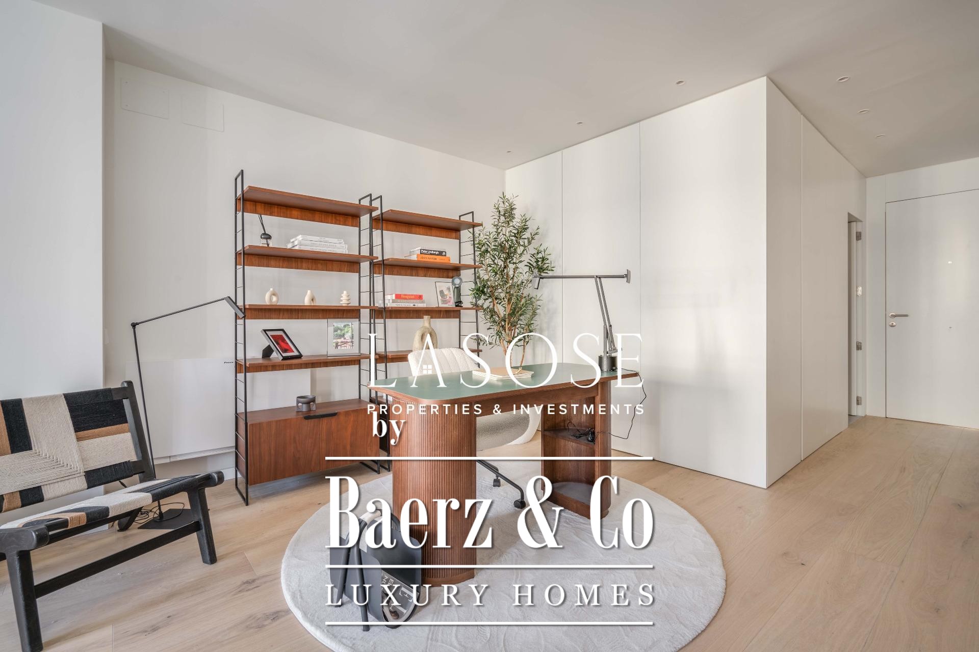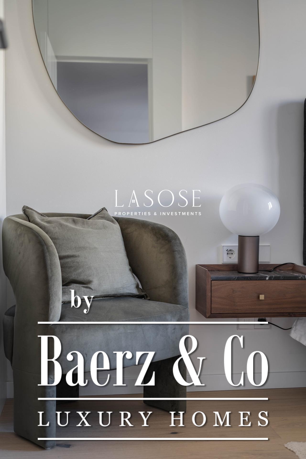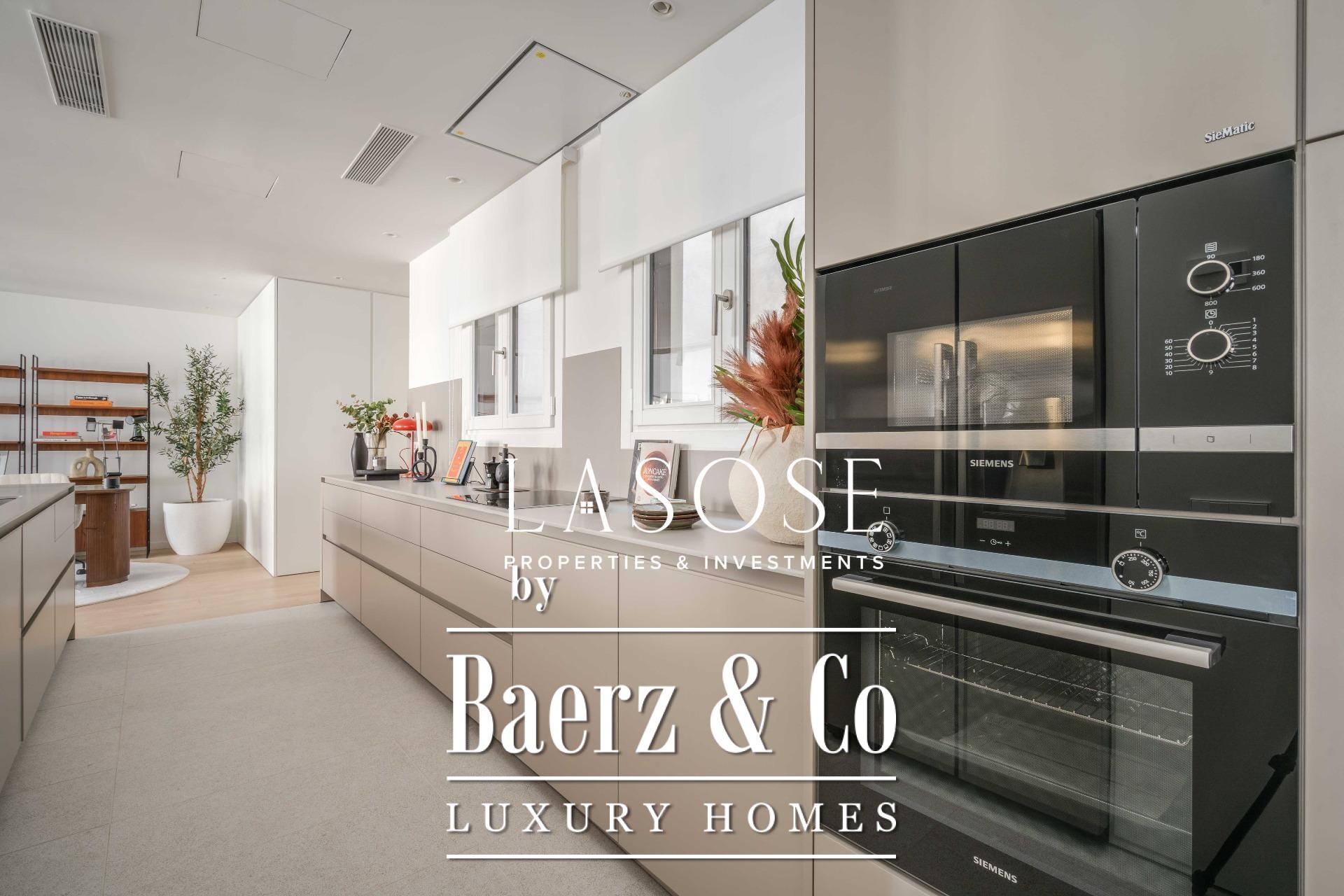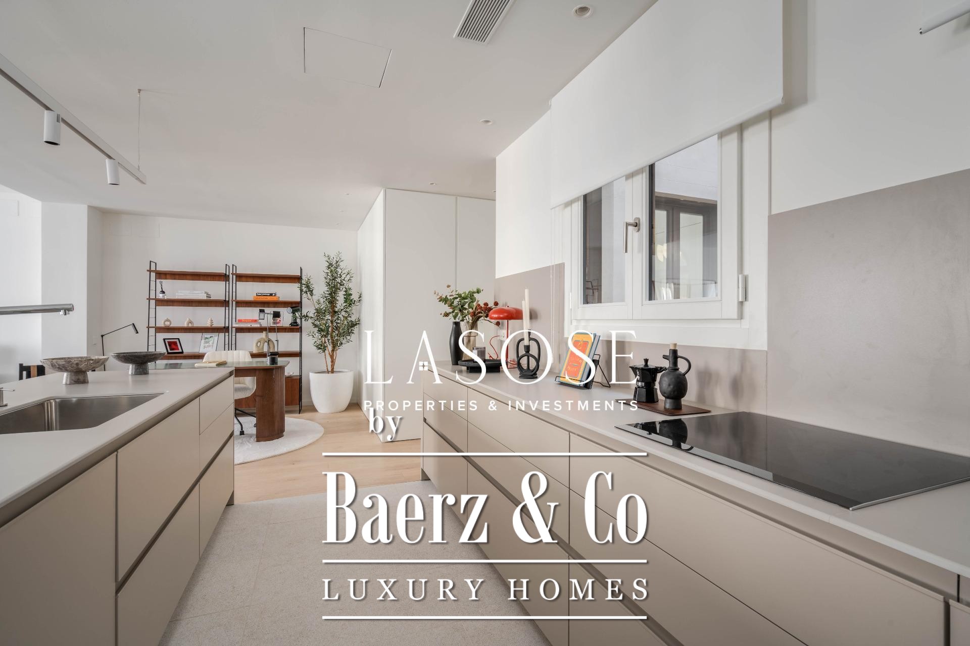 تشطيبات من تصميم Estudio Vilablanch تمنح المكان طابعاً أنيقاً مفعماً بالرقي، حيث تندمج الأجهزة الحديثة والتقنيات المتطورة مع التفاصيل التصميمية الفريدة. تتسم المساحات الداخلية بتوزيع عملي ومدروس، وتشمل خزائن مدمجة وأجهزة كهربائية وغرفة غسيل خاصة، بالإضافة إلى ميزات مثل التدفئة، ونظام الاتصال بالفيديو، ومصعد للوصول السهل.