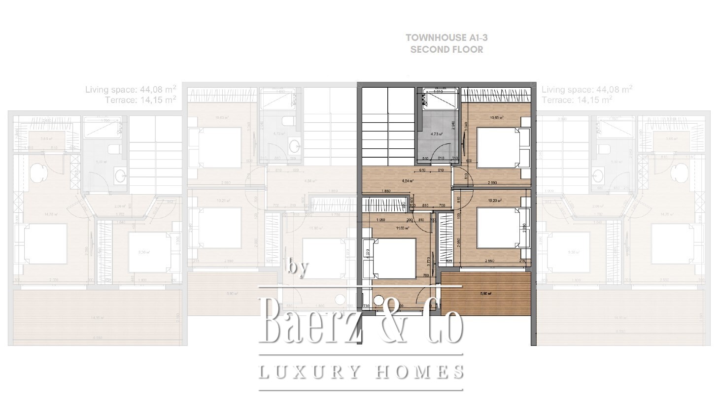 يوفر السكن مساحة معيشة تبلغ 110 م² على أرض خاصة مساحتها 200 م²، مع مرونة في التصميم بين غرفتي نوم أو ثلاث، وحمامين. تفتح غرفة المعيشة والمطبخ ذات التصميم المفتوح بسلاسة على شرفتين، تقدمان كل منهما إطلالات بحرية، بينما يمنح الموقف ومسار المشاة الخاص إحساساً بالوصول الفاخر. يتكون كل مبنى تاون هاوس من أربع وحدات سكنية، شُيدت بخرسانة مسلحة حديثة ونوافذ بانورامية مقاومة للصدمات، مع التركيز على السلامة البيئية.