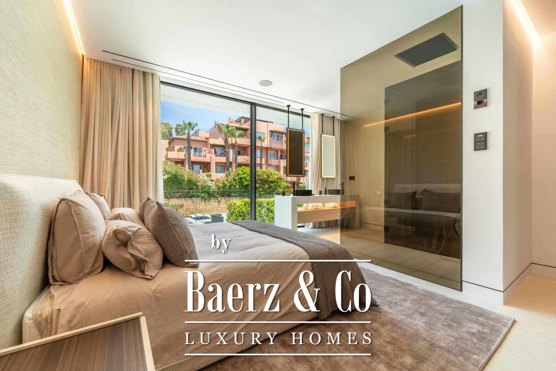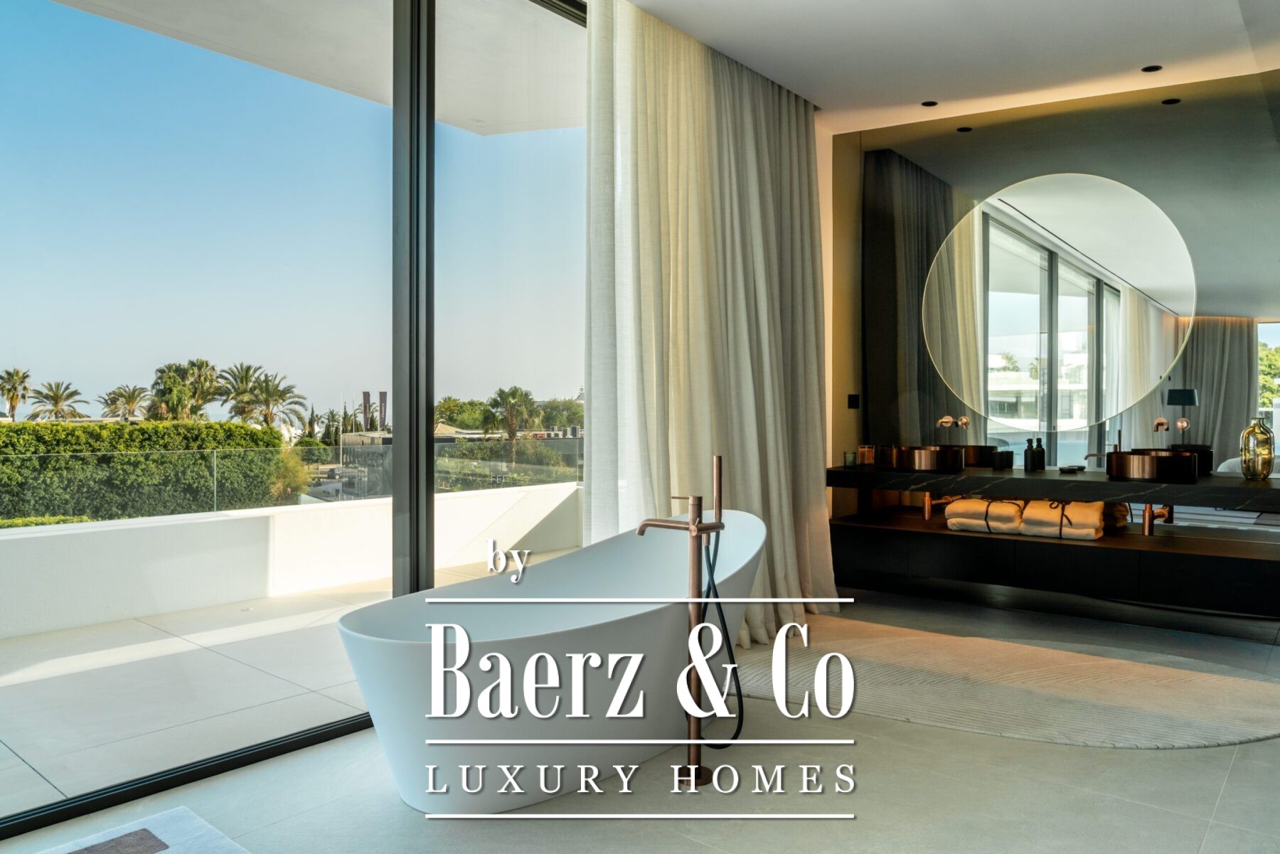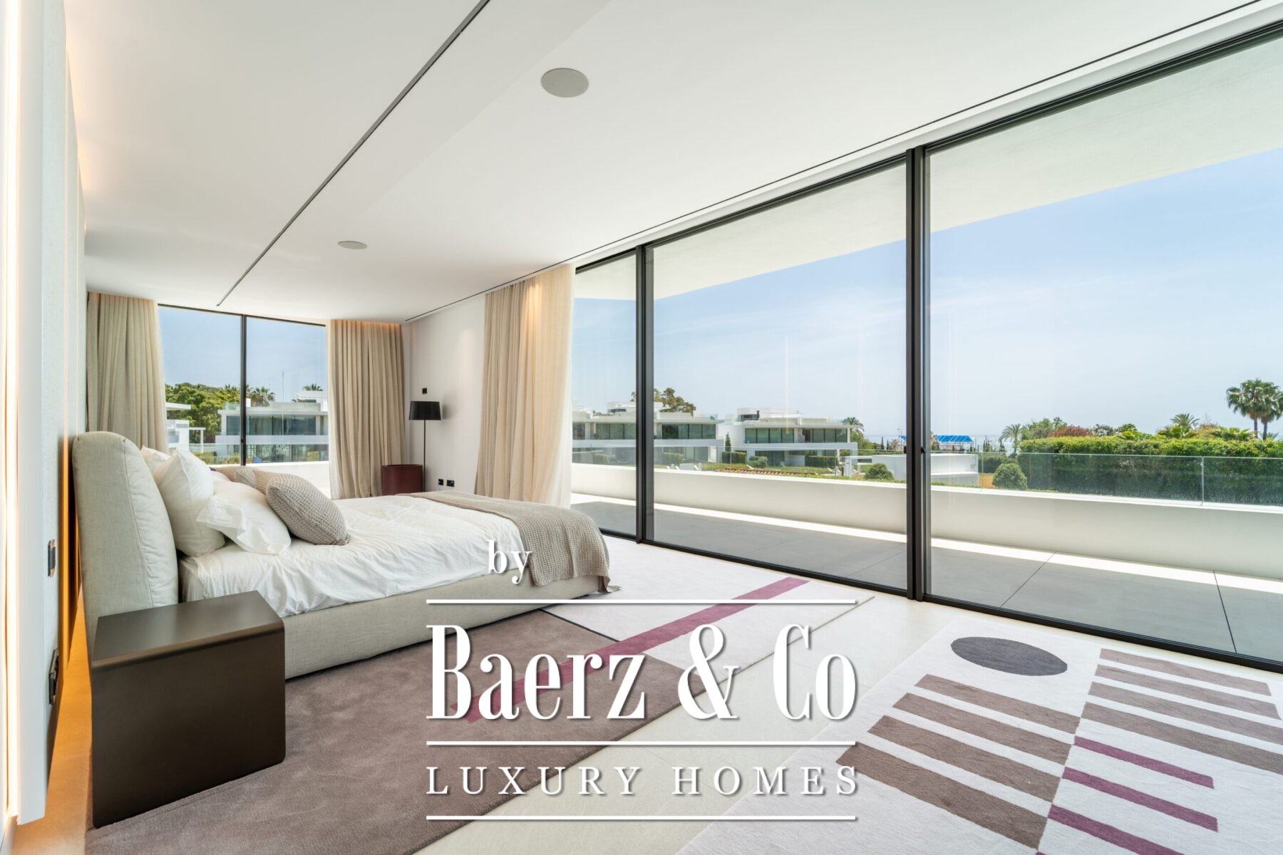 بتنفيذ راقٍ، تضم الفيلا خمس غرف نوم بحمامات داخلية وخمسة حمامات، صُممت كل مساحة فيها لتتناغم مع الضوء الأندلسي الواضح وإطلالة البحر الأبيض المتوسط. الطابق الأرضي يتميز بمساحات معيشة واسعة، منطقة معيشة وطعام كبيرة مع وصول مباشر إلى التراس، ومطبخ مجهز بالكامل متصل بالحدائق وحوضي سباحة خاصين. الطابق العلوي يقدم تراسات خاصة لكل غرفة نوم، مع تميز الجناح الرئيسي بغرفة ملابس فسيحة وإطلالات بحرية ممتدة على طول جولدن مايل.