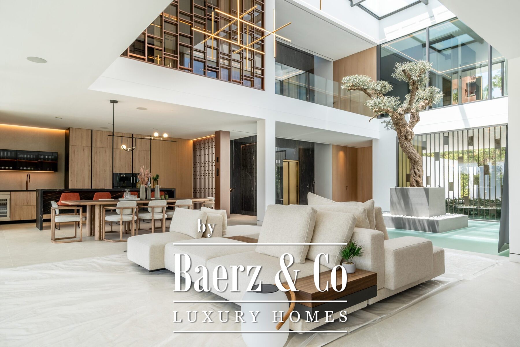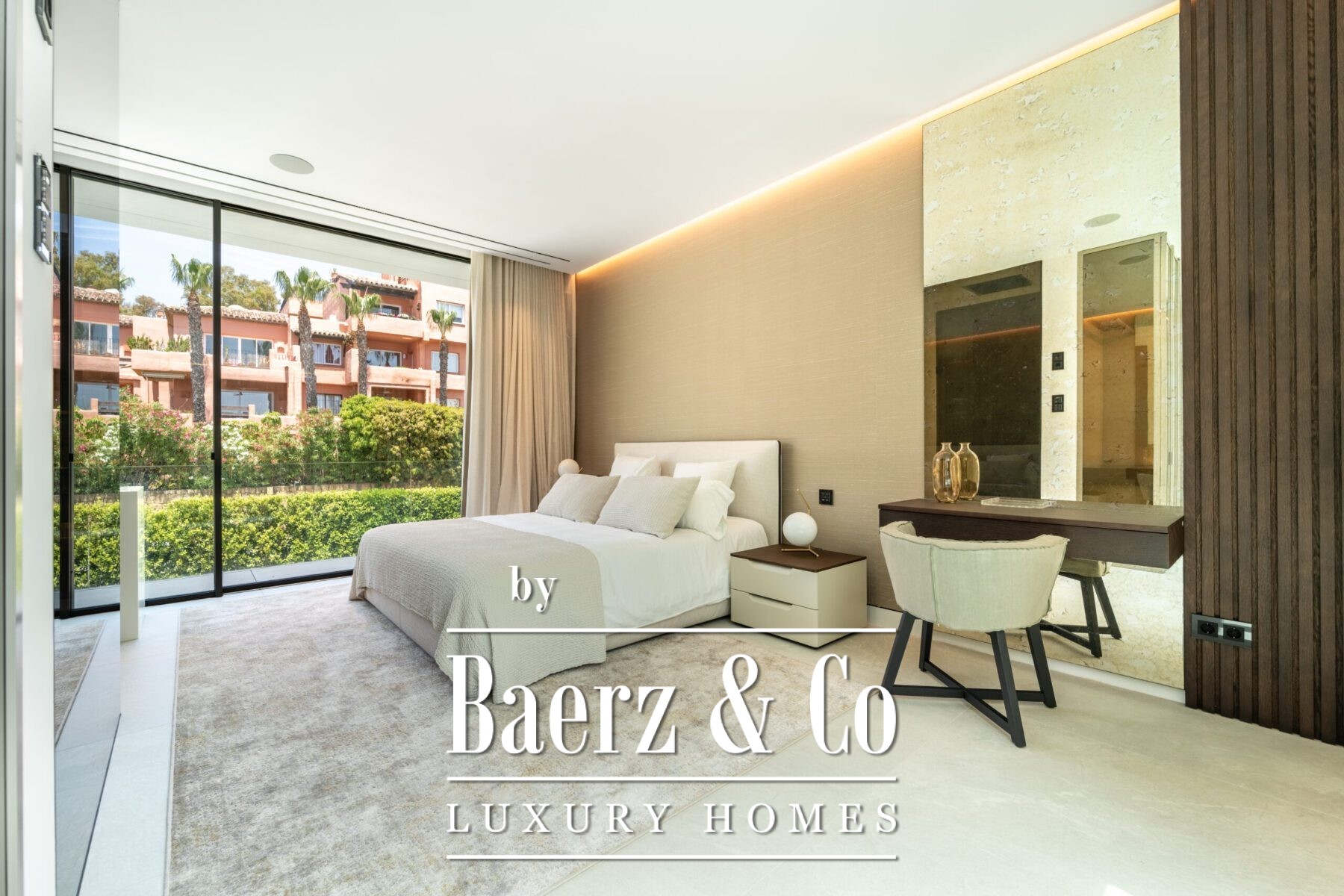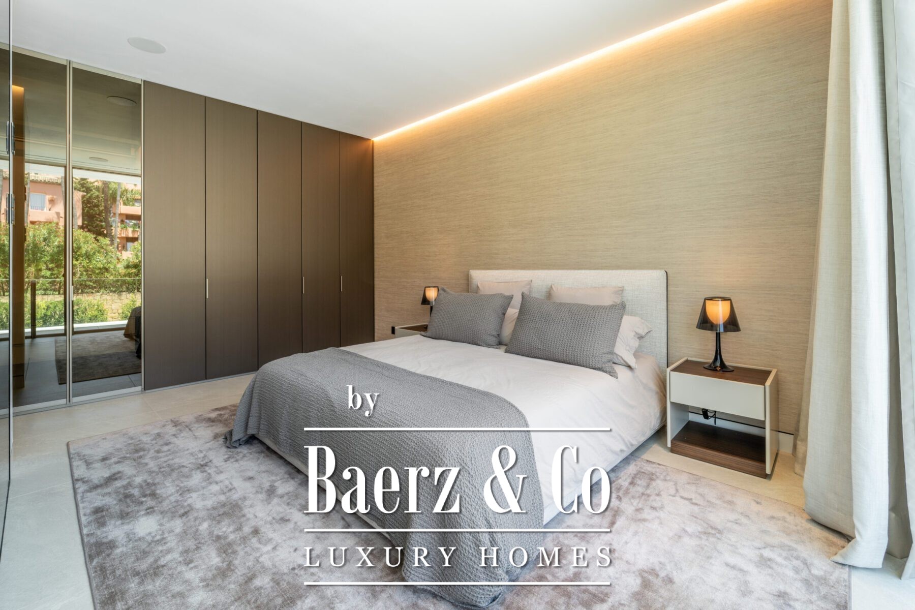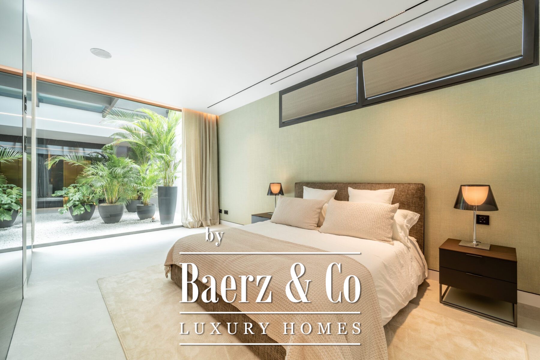 بتنفيذ راقٍ، تضم الفيلا خمس غرف نوم بحمامات داخلية وخمسة حمامات، صُممت كل مساحة فيها لتتناغم مع الضوء الأندلسي الواضح وإطلالة البحر الأبيض المتوسط. الطابق الأرضي يتميز بمساحات معيشة واسعة، منطقة معيشة وطعام كبيرة مع وصول مباشر إلى التراس، ومطبخ مجهز بالكامل متصل بالحدائق وحوضي سباحة خاصين. الطابق العلوي يقدم تراسات خاصة لكل غرفة نوم، مع تميز الجناح الرئيسي بغرفة ملابس فسيحة وإطلالات بحرية ممتدة على طول جولدن مايل.