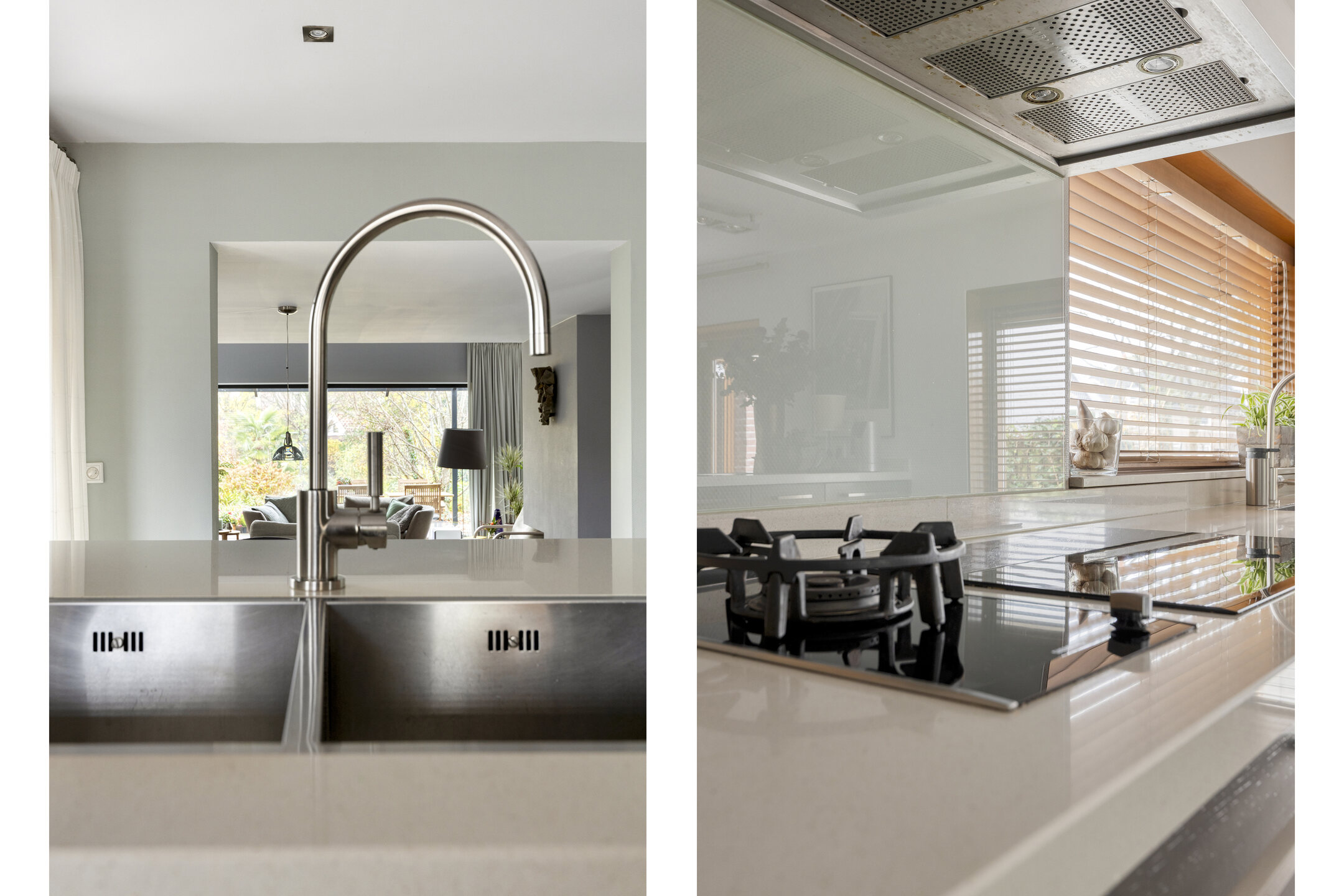 من المدخل الجانبي المؤطر بالزجاج، يسود الإحساس بالوضوح والانفتاح في المطبخ العصري المجهز بالكامل بموقد كهربائي ووحدة غازية للطهي الآسيوي وأجهزة عالية المواصفات. تمتد الخطة المفتوحة إلى غرفة المعيشة، حيث تضفي الأبواب الزجاجية المنزلقة العالية والسقف المرتفع والمدفأة المركزية إضاءة وهدوءاً معاً. تمتد الشرفة الزجاجية الخلفية مواسم السنة وتخلق جسر اتصال بصري مع الحديقة التي يزيد عمقها عن 30 متراً وتوجهها غرب-شمال غرب، وتزدهر بالنباتات المحلية والحياة البرية.