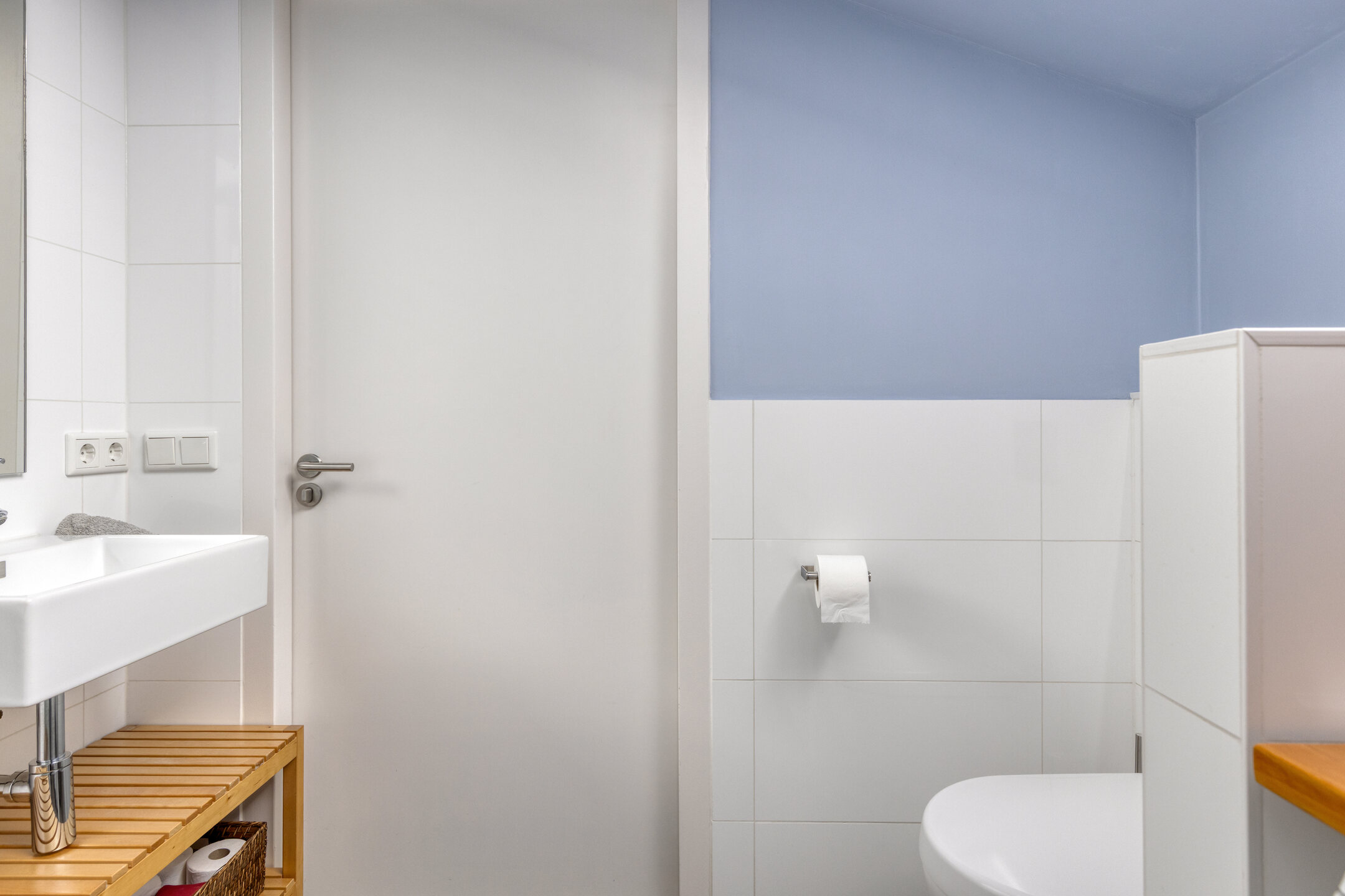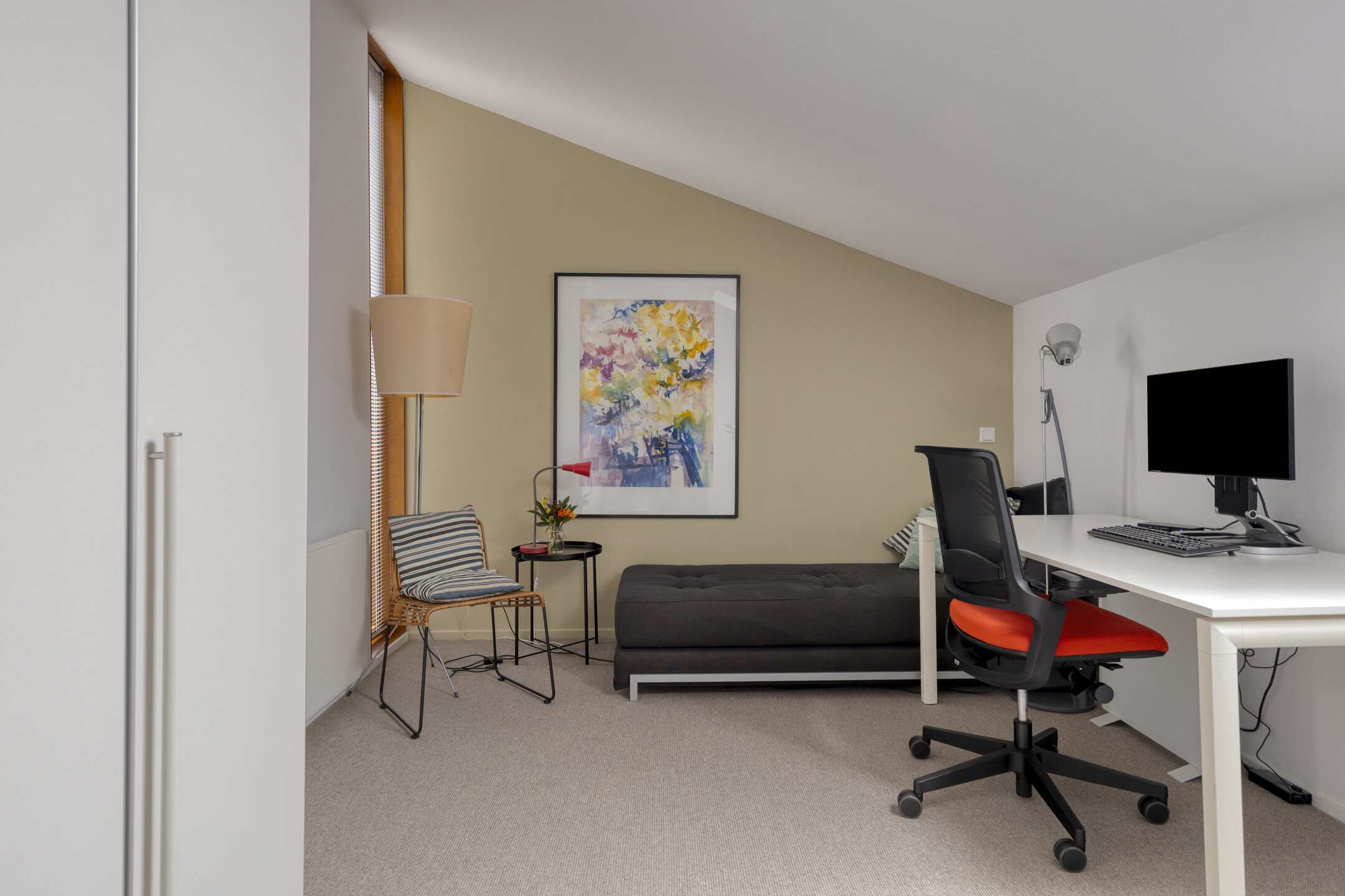 في الطابق العلوي، تضم الجناح الرئيسي حماماً خاصاً مع حوض استحمام ودش منفصل، بينما تحافظ غرف النوم الأخرى على شعور المساحة والضوء. وتشمل المرافق التقنية تهوية ميكانيكية، تدفئة تحت الأرضية، واتصال بالألياف الضوئية، مما يعكس الحداثة التامة والحالة الممتازة للصيانة.