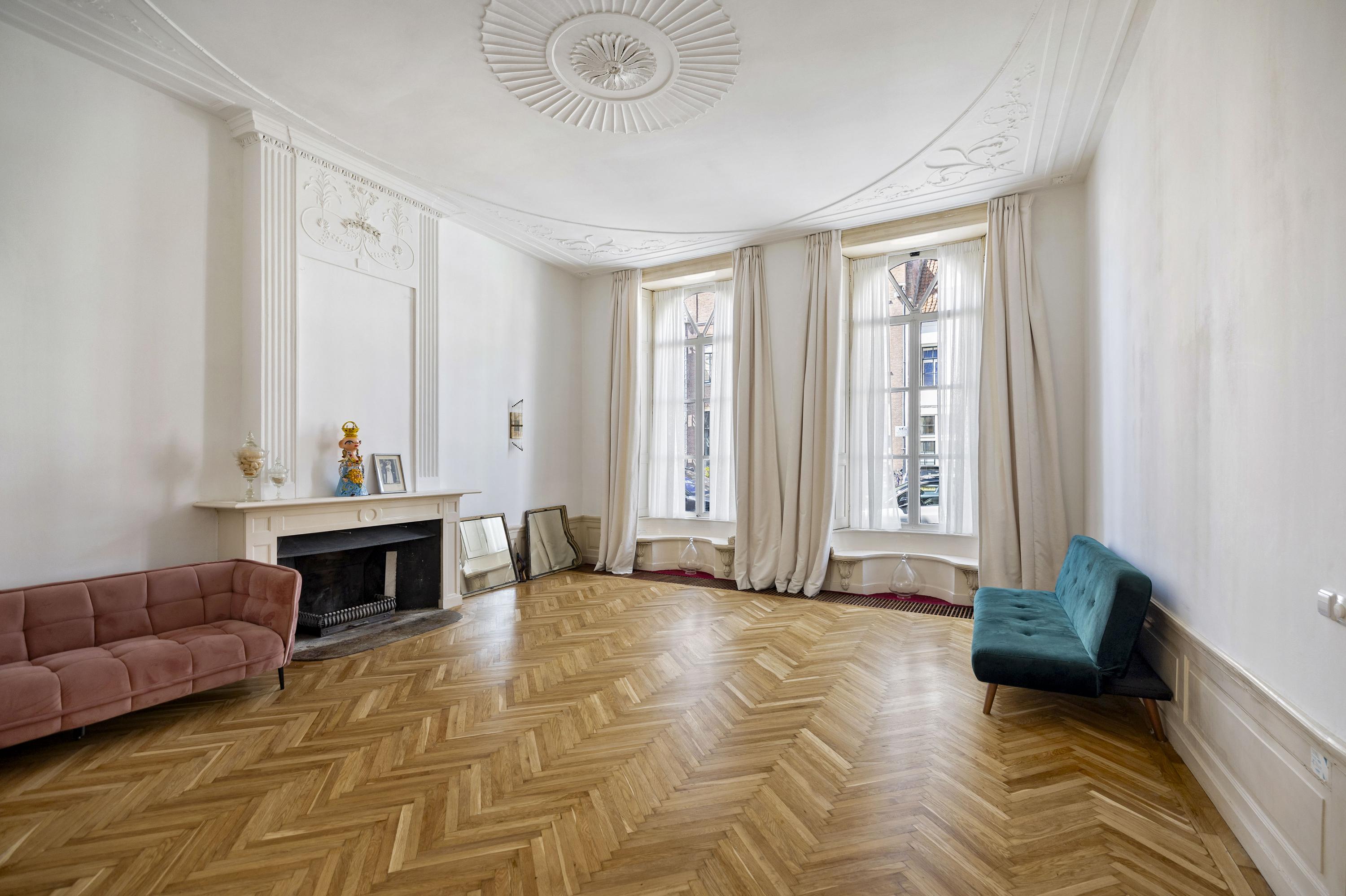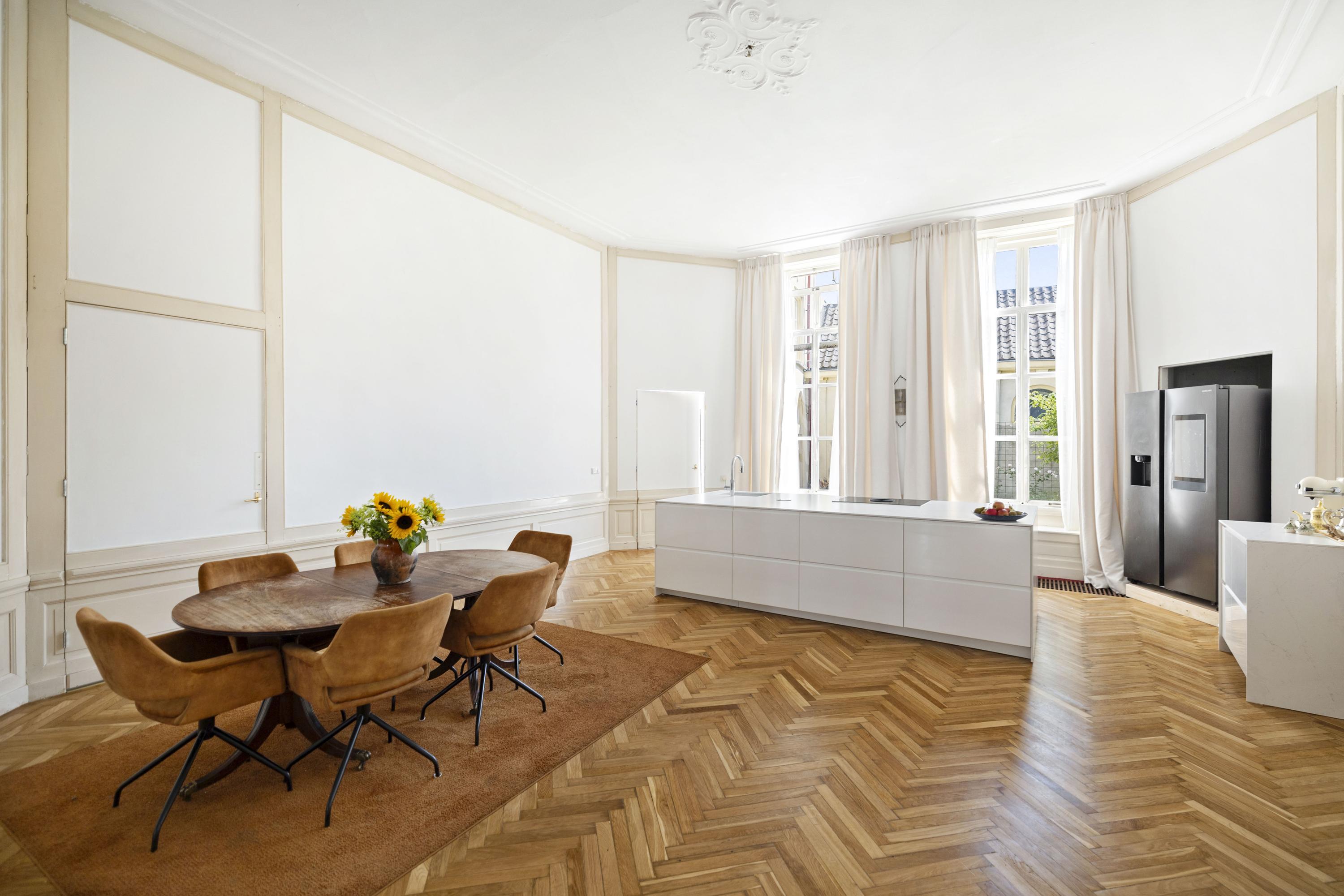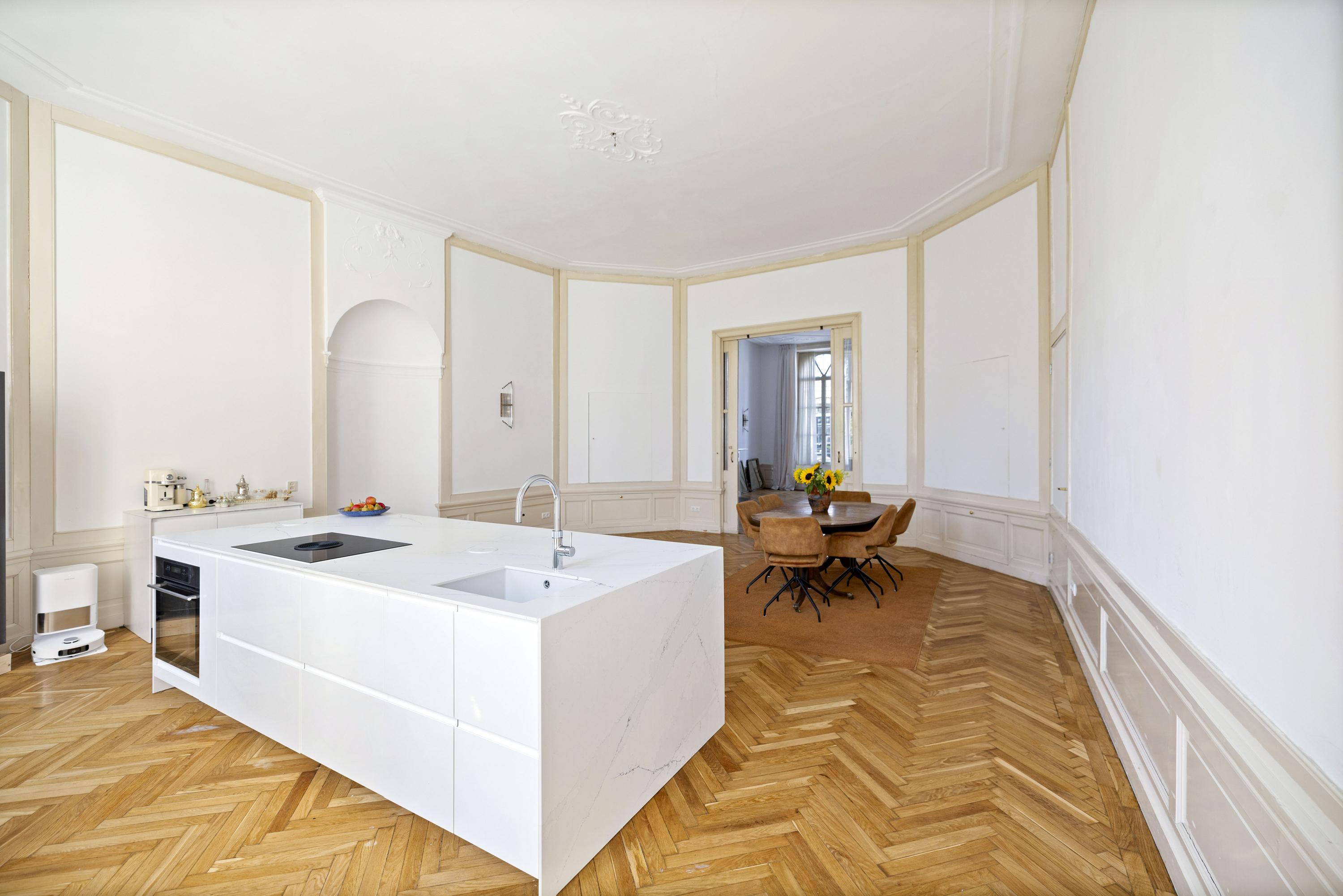 بعد المرور عبر المدخلين الكلاسيكيين، يستقبلك دهليز بأرضية من الرخام وإضاءة طبيعية وافرة. وتتوسط الطابق الرئيسي غرفة معيشة ومطبخ بمساحة تقارب 100 م². غرفة المعيشة التي تبلغ مساحتها 43 م² تتميز بمقاعد النوافذ الأصلية ومدفأة تاريخية، بينما تضفي أرضية الباركيه شيفرون من خشب البلوط دفئاً وإيقاعاً أنيقاً. المطبخ مجهز بخزائن بيضاء بلا مقابض وأجهزة عالية المواصفات تشمل موقد حثي مع شفاط متكامل وثلاجة وفريزر كبيرين.