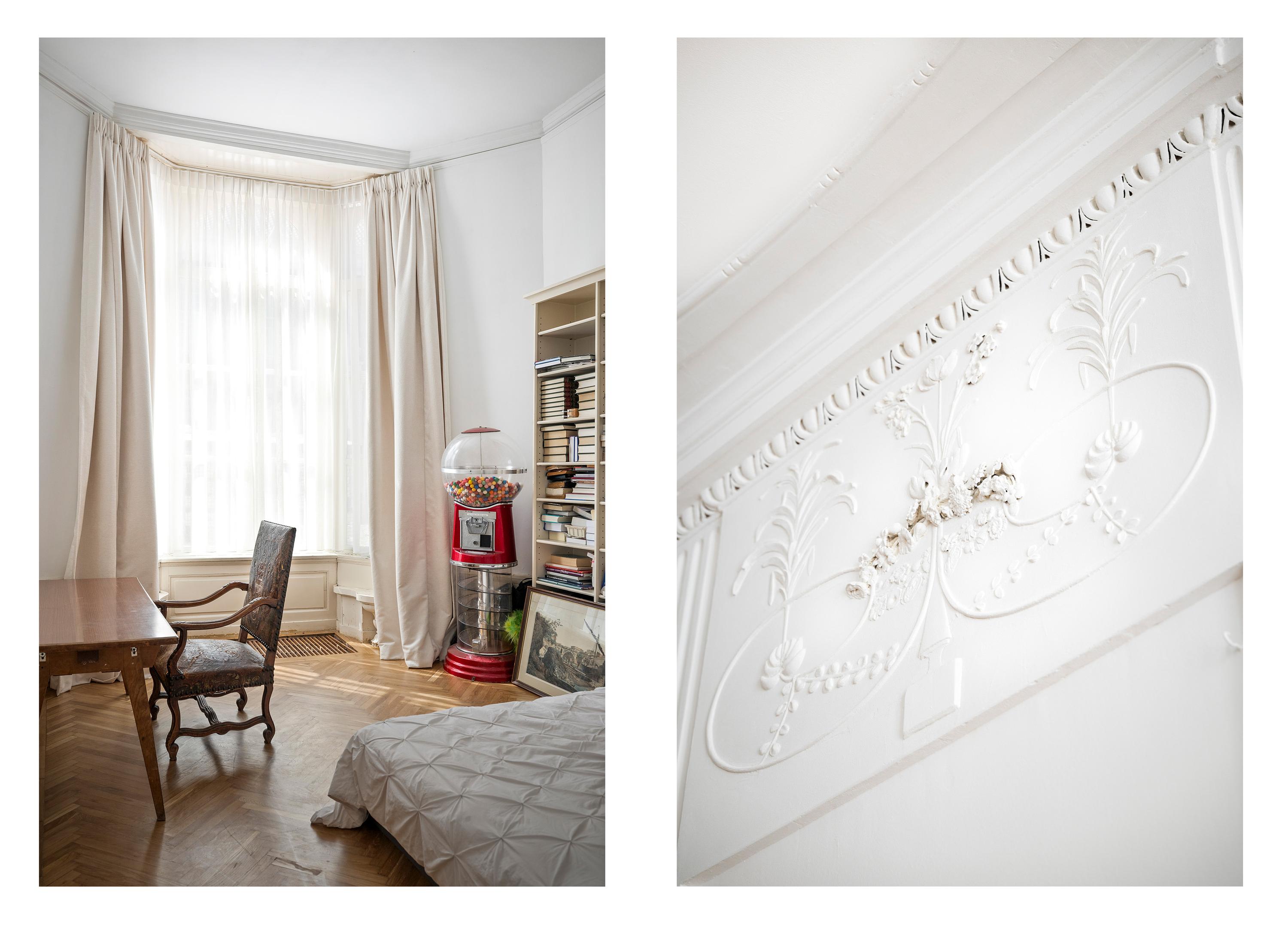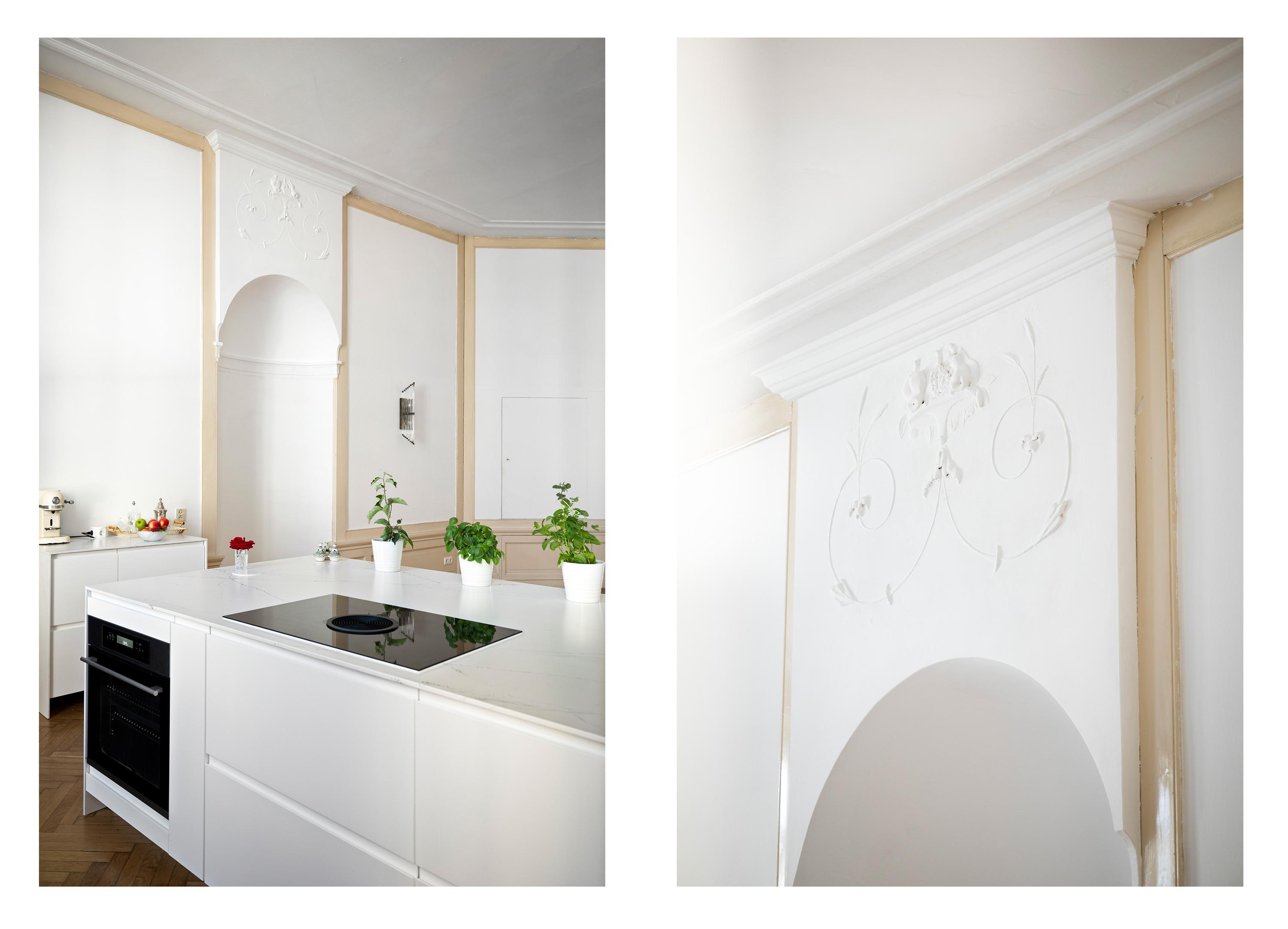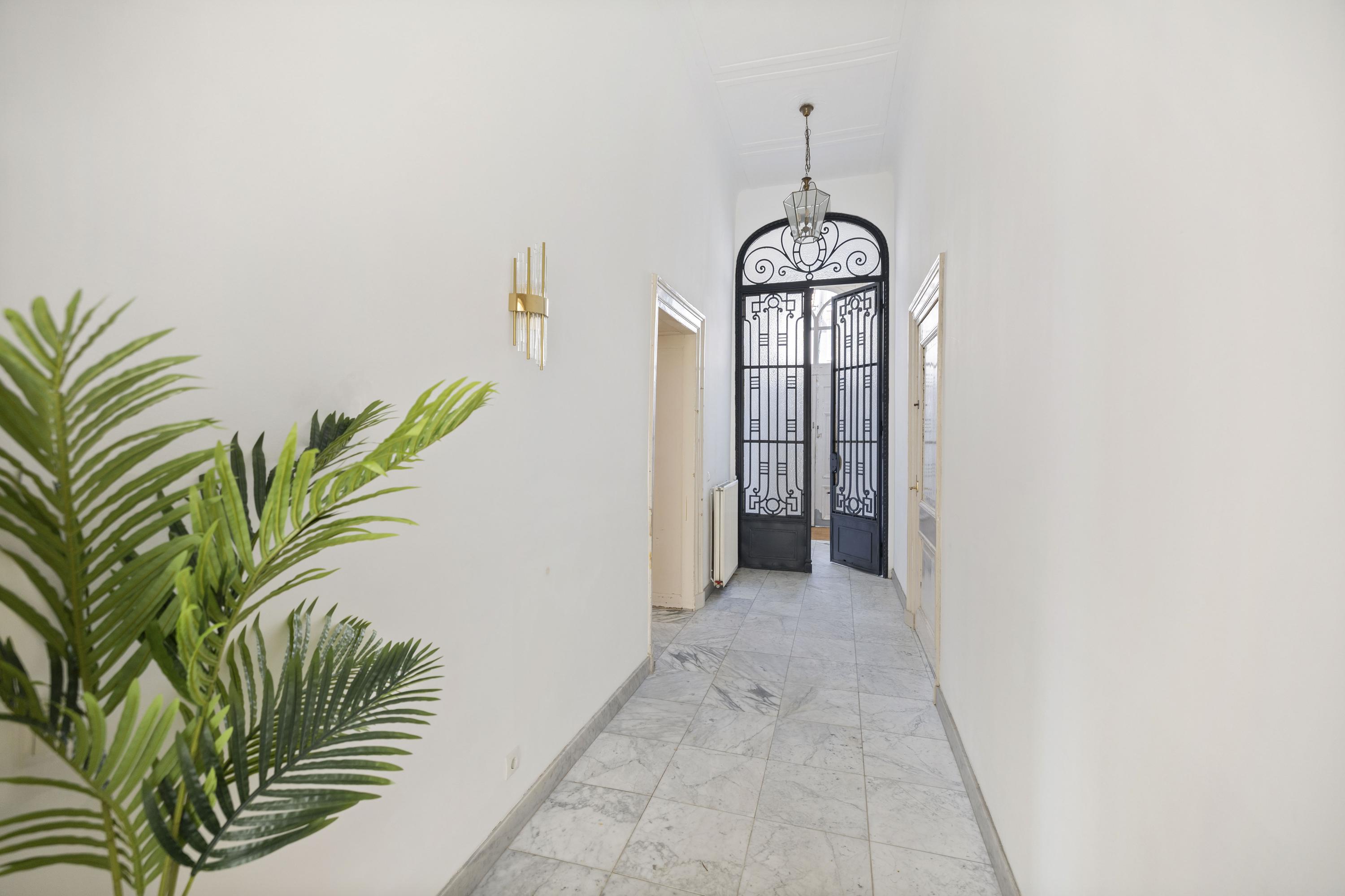 بعد المرور عبر المدخلين الكلاسيكيين، يستقبلك دهليز بأرضية من الرخام وإضاءة طبيعية وافرة. وتتوسط الطابق الرئيسي غرفة معيشة ومطبخ بمساحة تقارب 100 م². غرفة المعيشة التي تبلغ مساحتها 43 م² تتميز بمقاعد النوافذ الأصلية ومدفأة تاريخية، بينما تضفي أرضية الباركيه شيفرون من خشب البلوط دفئاً وإيقاعاً أنيقاً. المطبخ مجهز بخزائن بيضاء بلا مقابض وأجهزة عالية المواصفات تشمل موقد حثي مع شفاط متكامل وثلاجة وفريزر كبيرين.