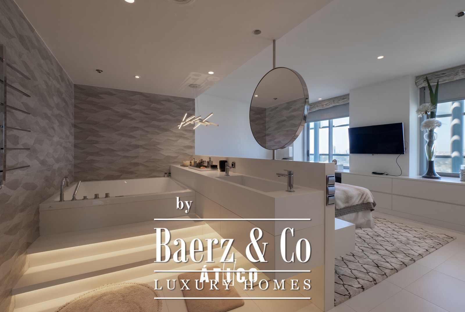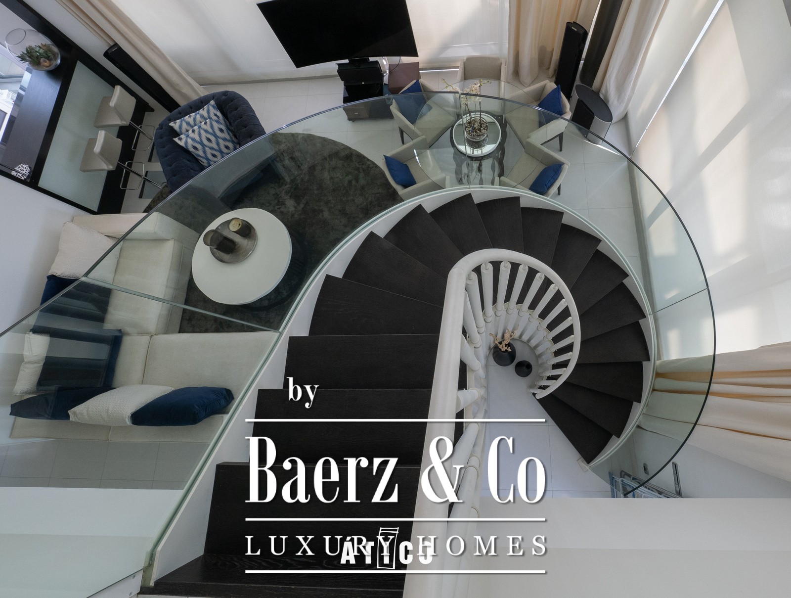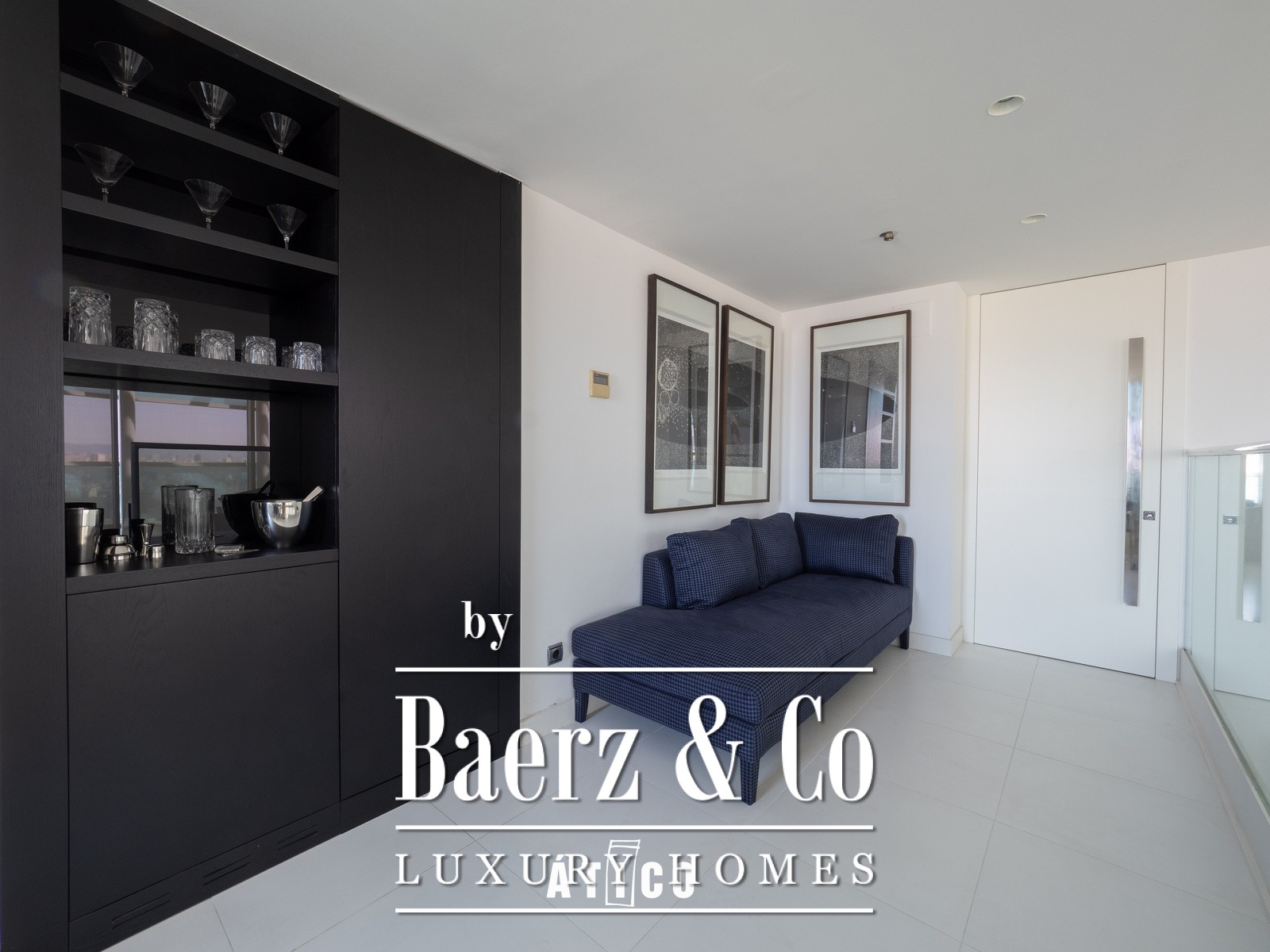Im unteren Bereich bietet ein ruhiges Schlafzimmer höchsten Komfort, ausgestattet mit einem privaten Bad, das höchsten Ansprüchen genügt. Im Obergeschoss befinden sich ein flexibler Arbeitsbereich und die Mastersuite mit Whirlpoolbad und Ausblick.