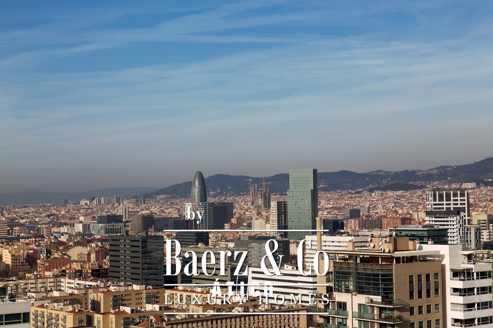 Das Wohnzimmer ist lichtdurchflutet, große Fenster öffnen sich nahtlos zur umlaufenden Terrasse. Dort lädt ein privater Pool zu entspannten Momenten über den Dächern der Stadt ein, begleitet vom Plätschern umgebender Wasserfälle und Panoramablicken auf Barcelona, die eine ruhige Lebendigkeit vermitteln. Die integrierte Küche mit Edelstahl und Quarz verbindet zeitgemäßes Design und Funktionalität, ideal für ungezwungene Abende oder ruhige Dinner zuhause.