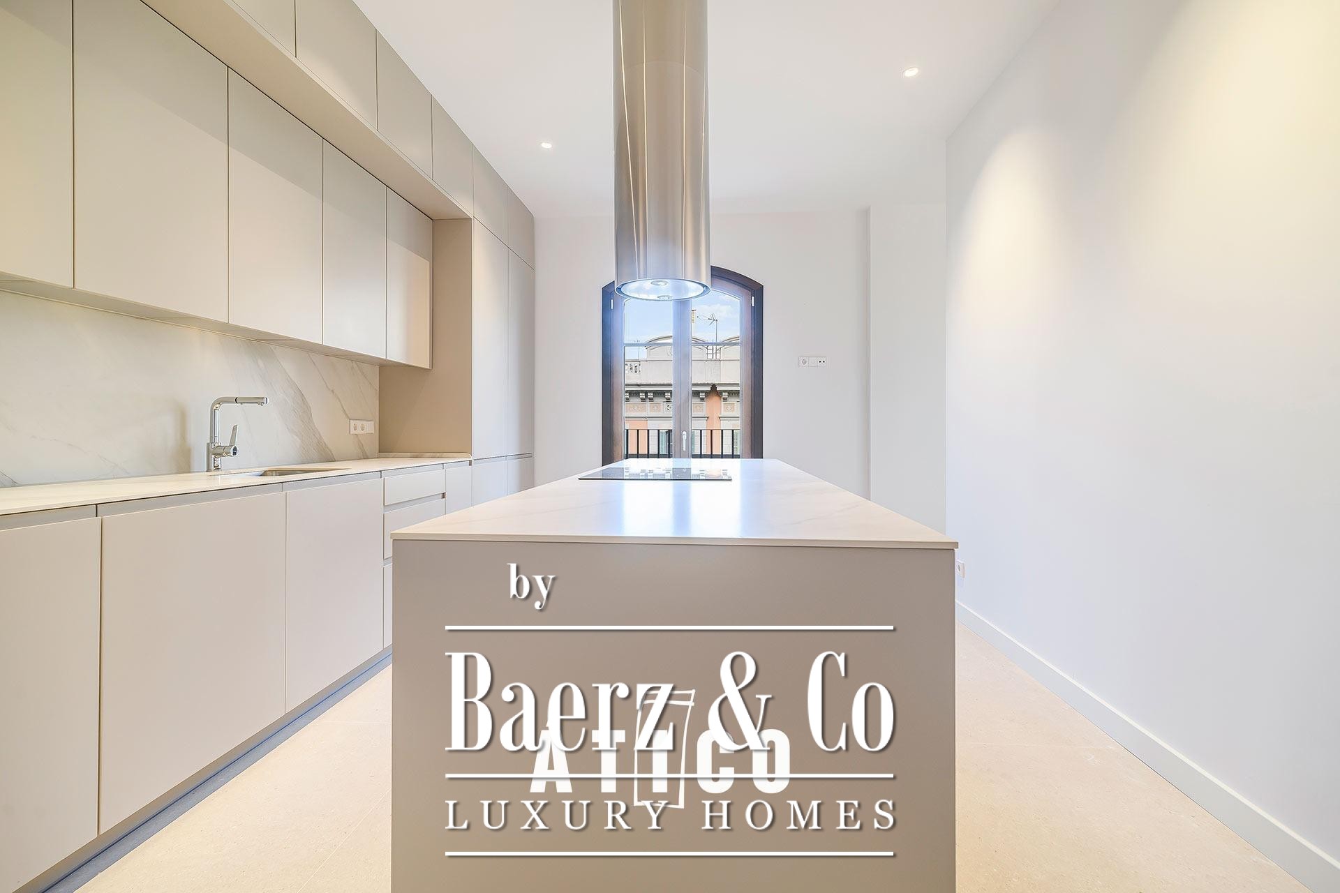 Im oberen Stockwerk finden sich ein Schlafzimmer, ein vielseitig nutzbarer Raum für Arbeit oder Freizeit sowie ein voll ausgestattetes Bad. Eine 38,85 m² große Terrasse erweitert den Wohnraum nach draußen und bietet den perfekten Rahmen für offene Zusammenkünfte oder stille Momente unter dem Himmel der Stadt. Drei Schlafzimmer und drei Bäder sorgen für eine ausgewogene Balance aus Komfort und Rückzug, während ausgesuchte Materialien und tadellose Verarbeitung den durchgehenden Anspruch an höchste Handwerkskunst unterstreichen. Die Küche ist ebenso durchdacht gestaltet, sie bietet großzügigen Stauraum und eine durchdachte Lösung für den Alltag.