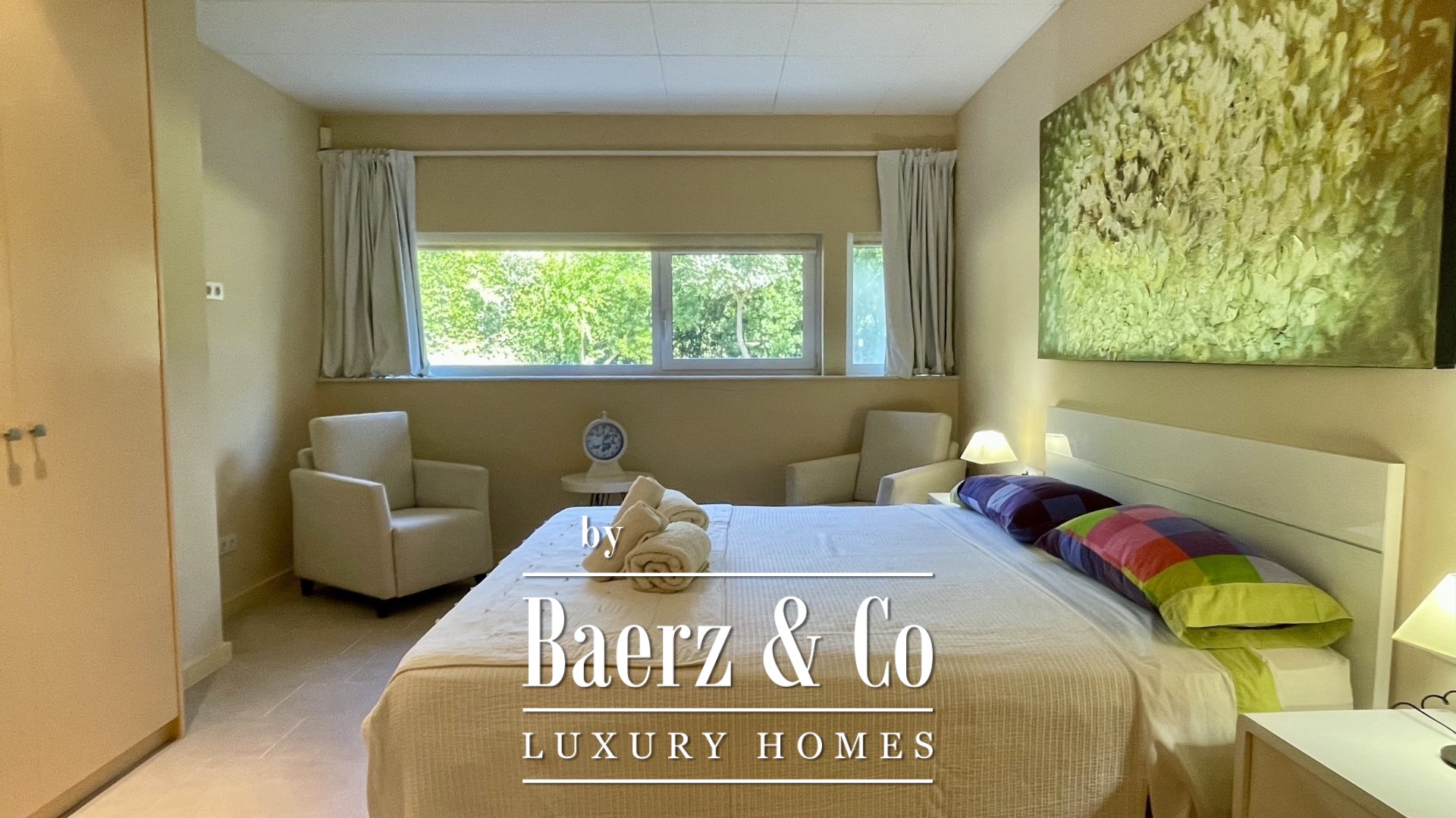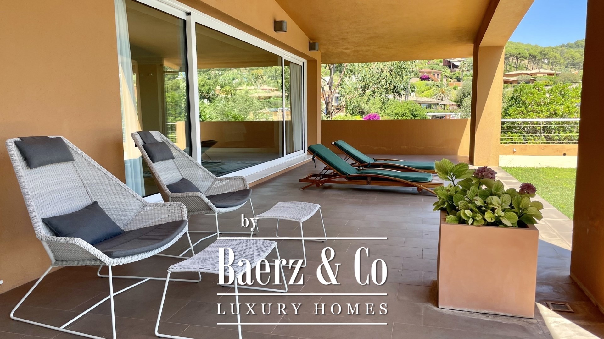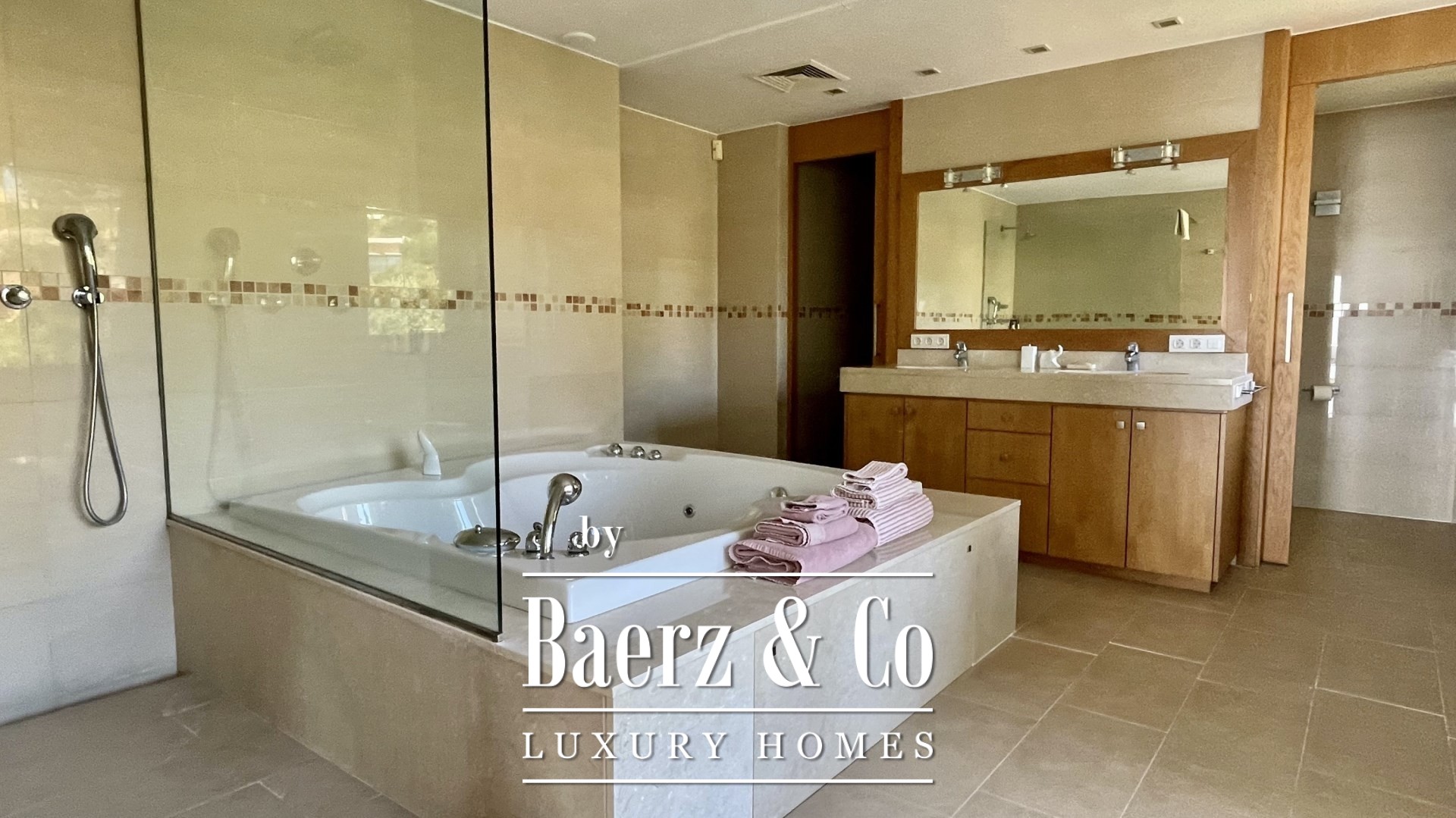 Die Hauptsuite misst fast 70 m² und beeindruckt mit Meerblick, direktem Terrassenzugang, einem ausgestatteten Ankleidezimmer sowie einem Bad mit Jacuzzi, begehbarer Dusche und zwei WC. Zwei weitere Schlafzimmer mit Bad en suite bieten Zugang zu den üppigen Gärten, während ein privates Arbeitszimmer mit Massivholzregalen und beruhigendem Brunnenklang ein Gefühl von Ruhe erzeugt. Jeder Raum steht in selbstverständlicher Verbindung zur Natur und wahrt die enge Beziehung der Villa zum mediterranen Umfeld.