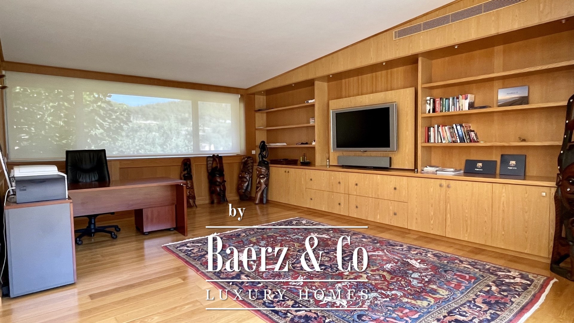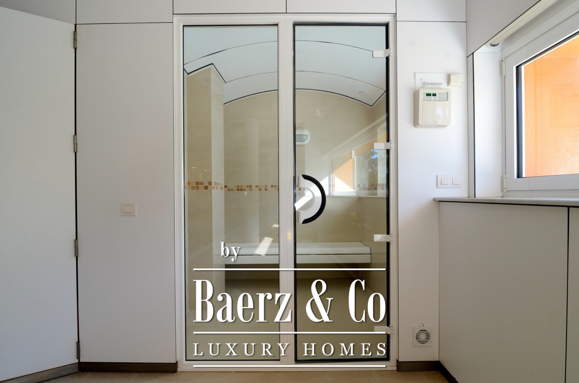 Auf der unteren Gäste- und Wellness-Ebene eröffnen sich weitere Möglichkeiten mit einem beheizten Innenpool, Fitnessraum, Spa und drei Doppelzimmern mit eigenem Bad – ideal für Gäste oder Personal. Im Außenbereich verankert ein 21 mal 7 Meter großer Pool die gepflegten Gärten, umgeben von Terrassen und einem Innenhof für kontemplative Momente.