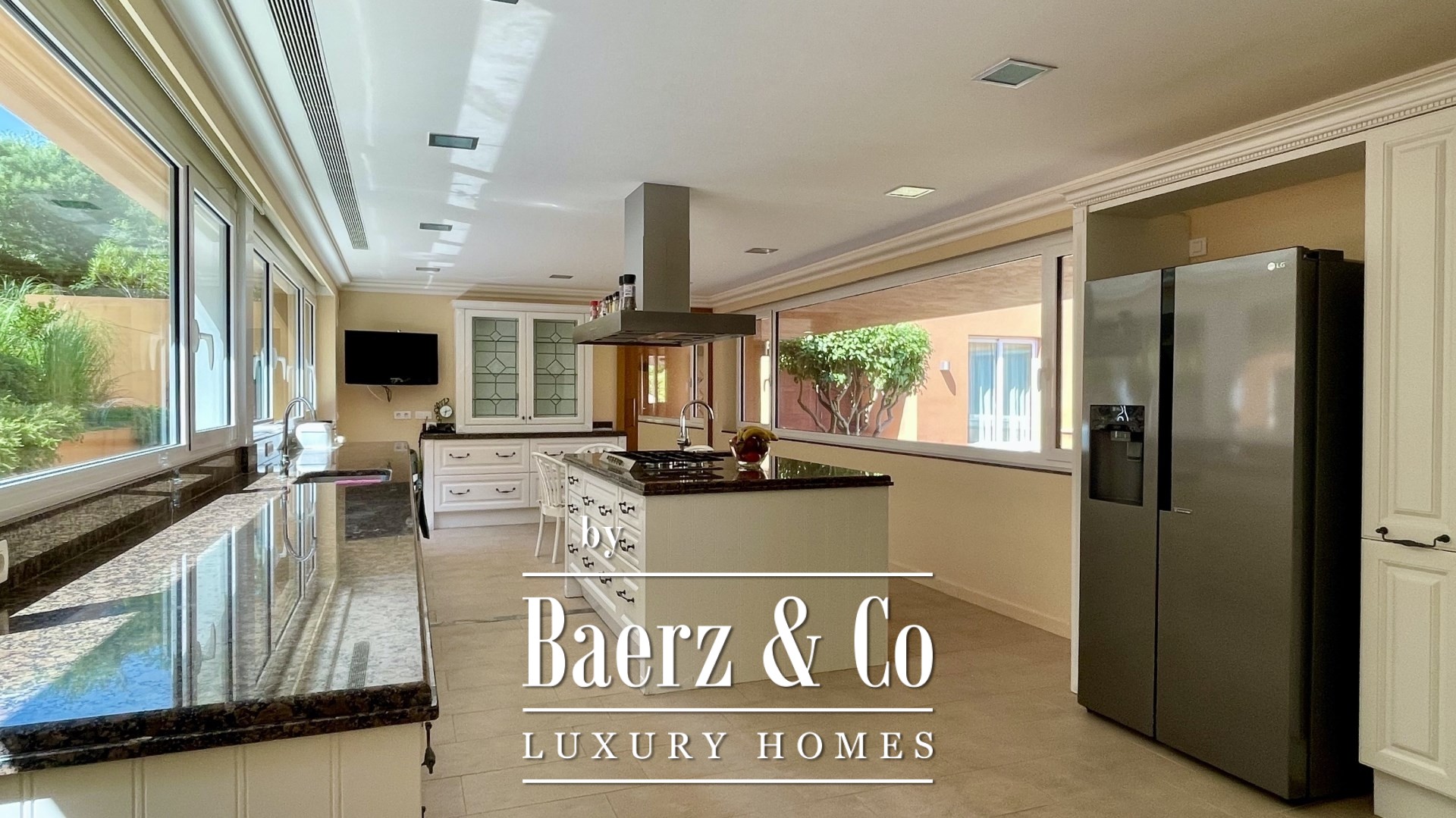 Der Weg beginnt über eine kunstvoll gestaltete Allee, die zu einem markanten Eingang führt und in ein Wohnzimmer mit doppelter Deckenhöhe und außergewöhnlichem Lichteinfall übergeht. Die Räume verschmelzen nahtlos; gemütliche Ecken mit Kamin, Leselounge und offene Gesellschaftsbereiche – alle mit weitem Blick auf Meer und Garten. Ein formeller Essbereich verbindet sich harmonisch mit einer großzügigen Küche samt Kochinsel und öffnet sich zu einer überdachten Terrasse mit Lounge und Gasgrill für genussvolle Abende im Freien.