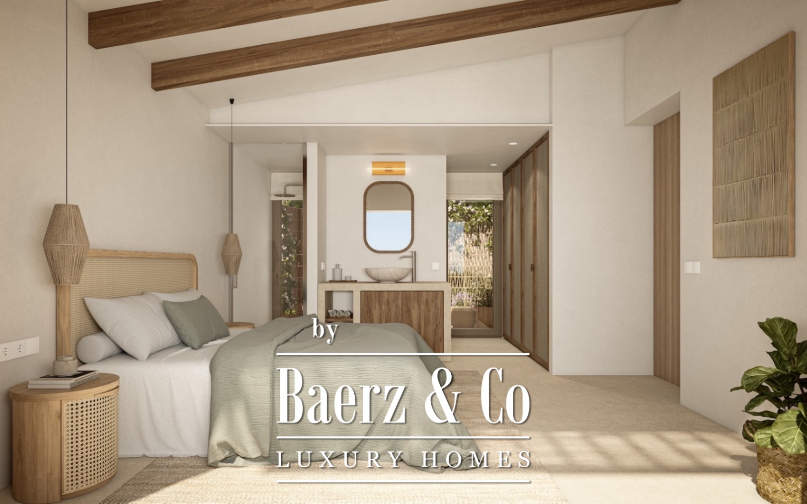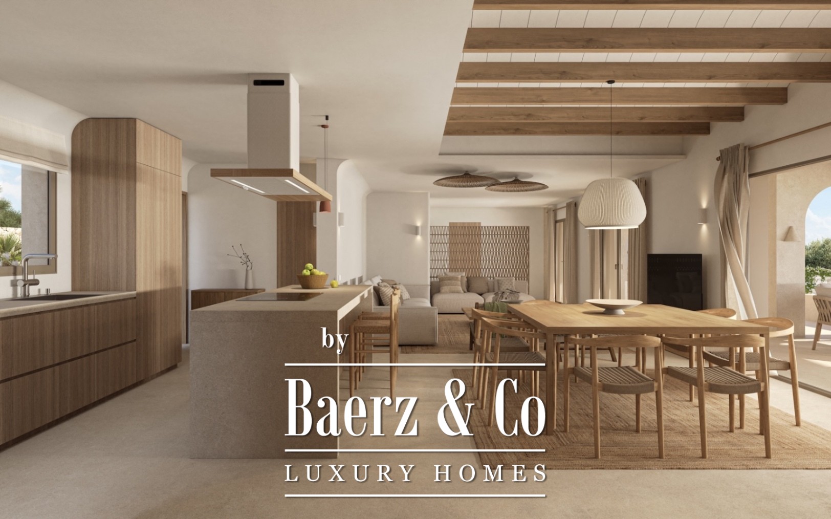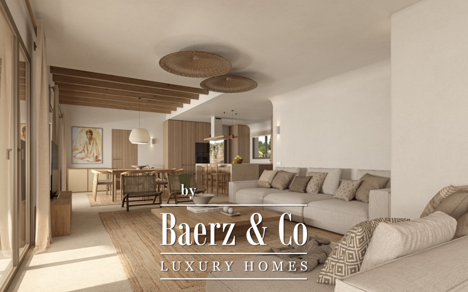 Ein überdachter Parkplatz begrüßt Sie, gesäumt von Bougainvillea und stilvoller Rankstruktur. Im Inneren prägt ein offener Wohn-, Ess- und Küchenbereich mit sichtbaren Holzbalken und Kalkputz das Ambiente, harmonisch ergänzt durch sanfte Naturtöne. Die Küche bietet eine zentrale Kochinsel und Bosch-Geräte, die Alltag und Begegnungen unterstützen, während große Fenster den Blick ins Freie öffnen und nahtlos auf die überdachte Veranda und die Poolterrasse führen.