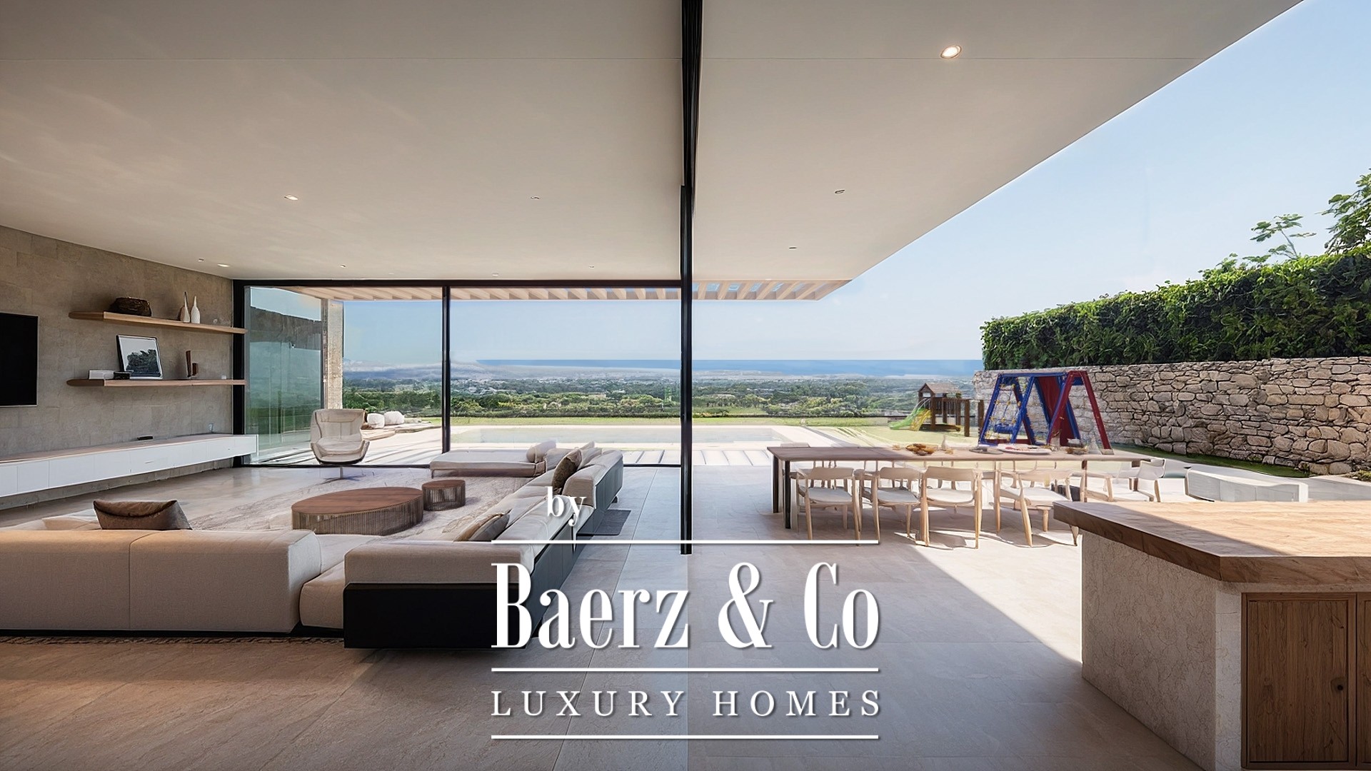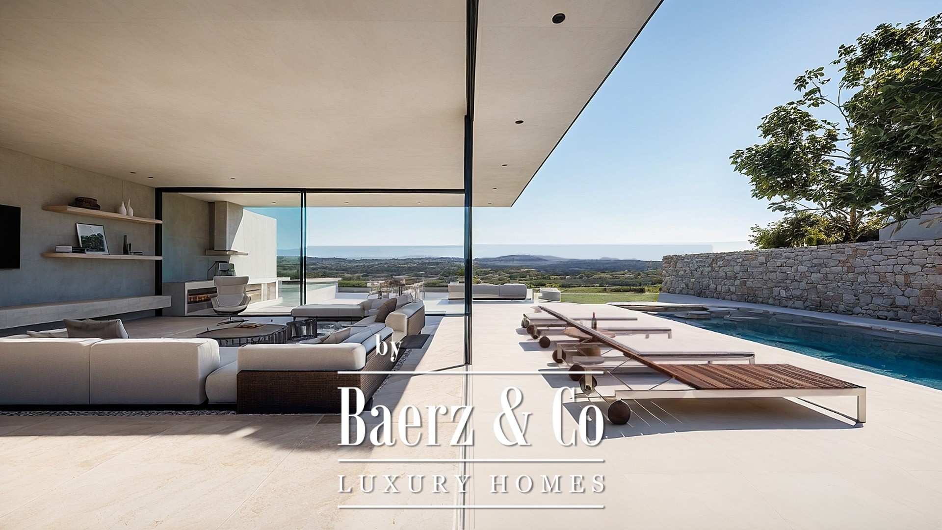 Die Immobilie erstreckt sich über vier Ebenen. Die 120 m² große Garage bietet Platz für sechs Fahrzeuge; ein Technikraum und ein Aufzug verbinden sämtliche Stockwerke. Die Hauptetage empfängt Sie mit einem lichtdurchfluteten Wohn- und Essbereich mit Blick aufs Meer, einer modernen offenen Küche und einem nahtlosen Übergang zum weitläufigen Garten und Pool, die gleichermaßen zum entspannten Verweilen wie zu geselligen Zusammenkünften einladen. Eine Suite mit Ankleidezimmer und privatem Bad sowie ein separates Gäste-WC vervollständigen diese Ebene.