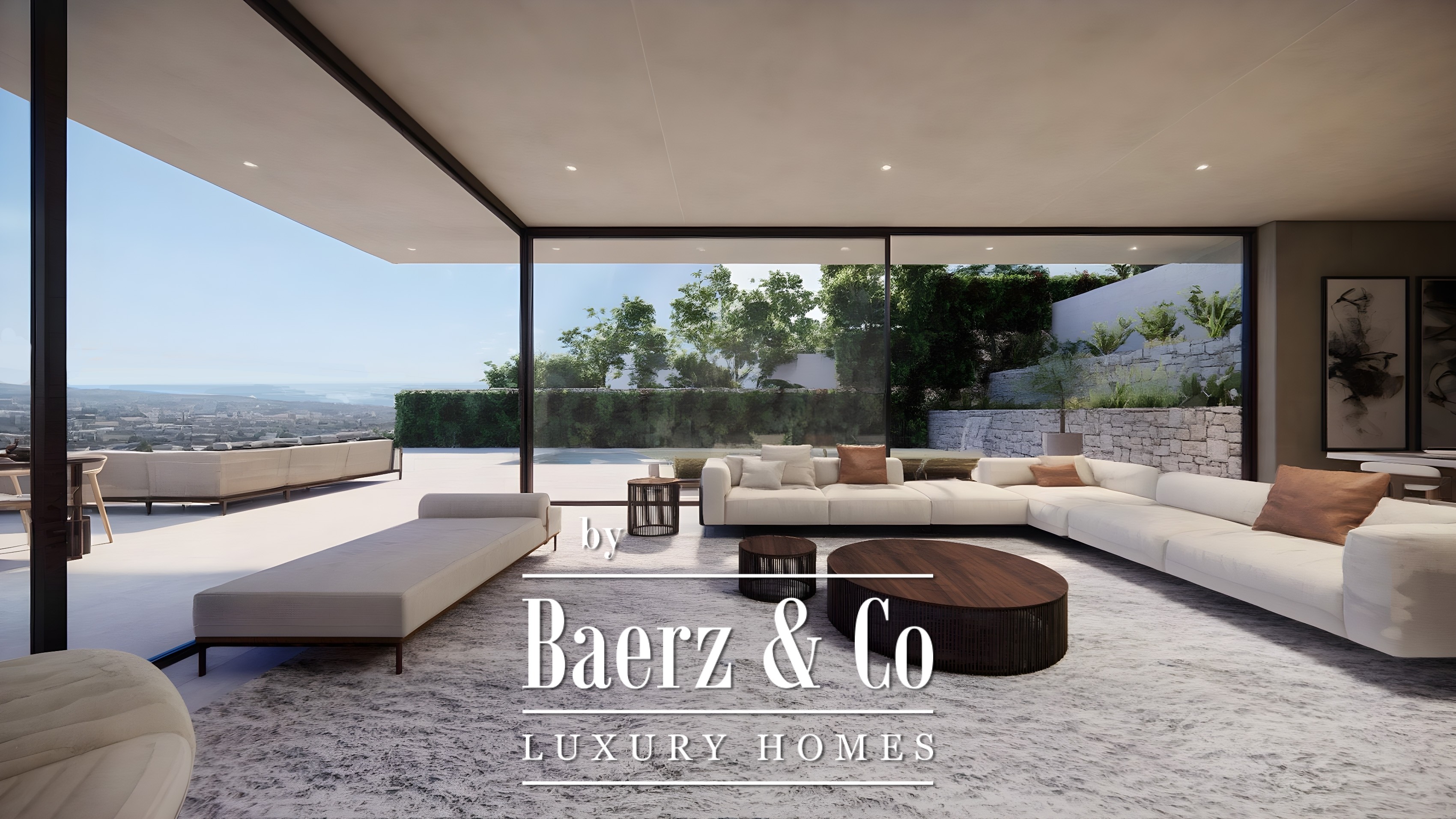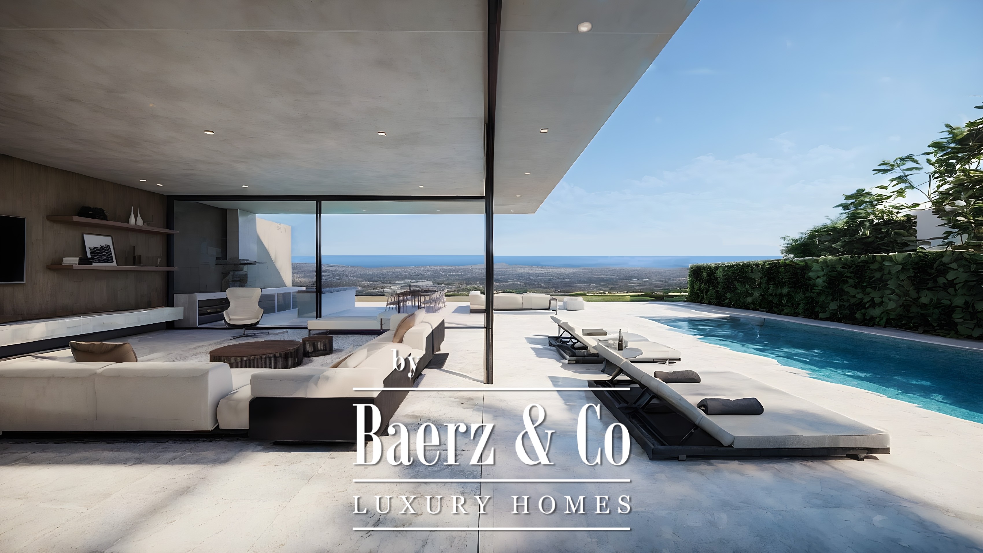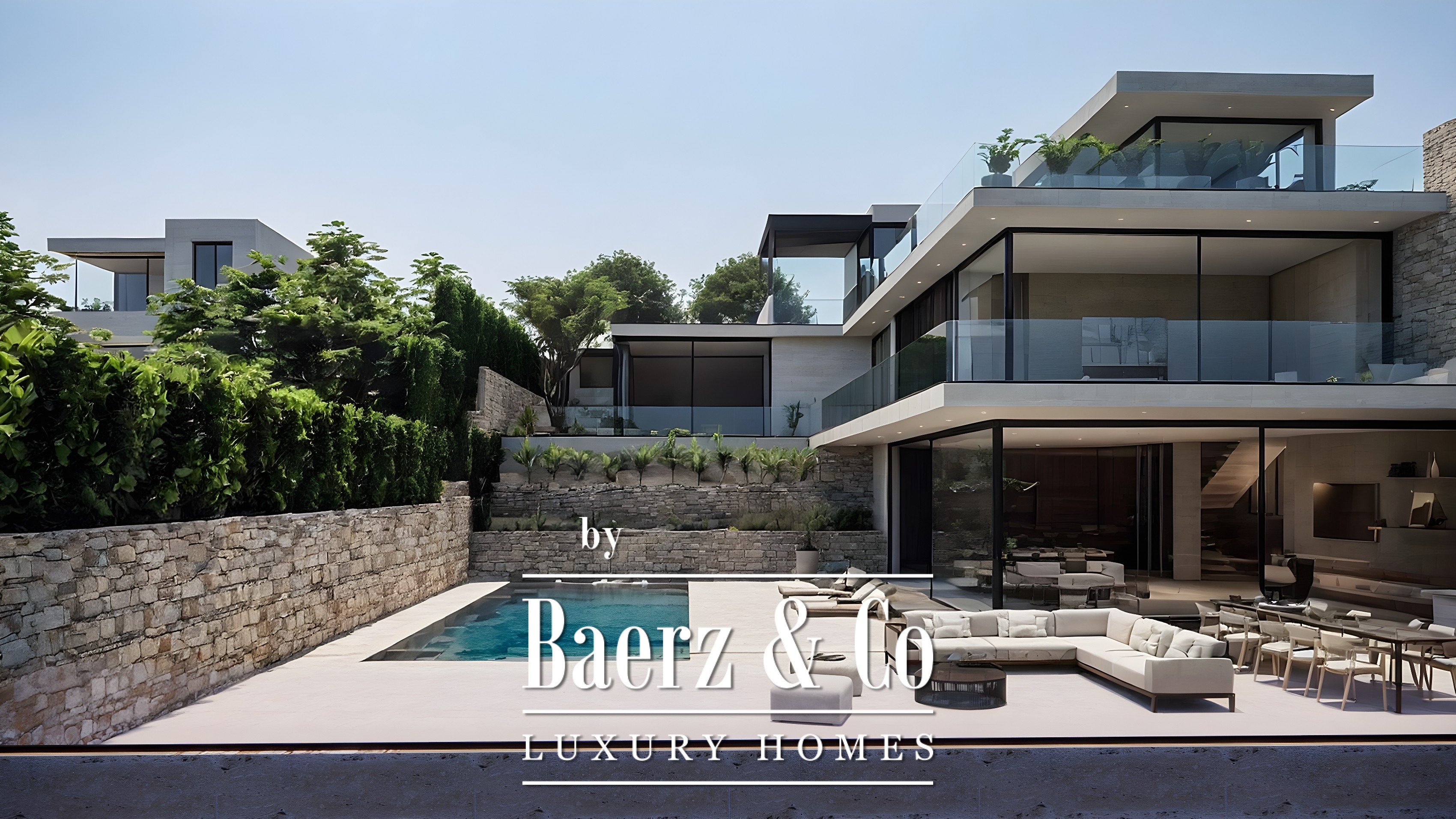 Im ersten Obergeschoss erstreckt sich die Master-Suite mit begehbarem Kleiderschrank und eigenem Bad. Zwei weitere Schlafzimmer verfügen jeweils über eigene Ankleideräume und Bäder. Ein separates Wohnzimmer sowie ein unabhängiges Arbeitszimmer bieten Rückzugsorte für Privatsphäre. Das oberste Stockwerk beherbergt ein vielseitiges Gästeapartment mit Schlafzimmer, Bad, Kitchenette, Salon sowie Zugang zu einer großzügigen Terrasse. Hier ermöglichen ein Pool mit Jacuzzi und ein Essbereich im Freien müheloses Entertaining hoch über dem Mittelmeer.