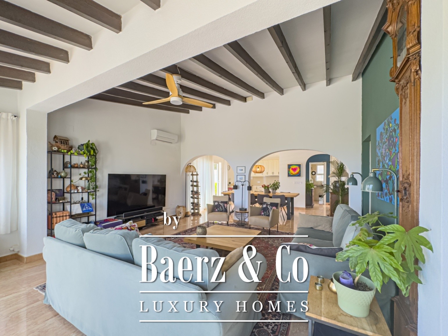 Im Außenbereich schaffen Palmen und Obstbäume eine Oase der Ruhe. Der private Pool, eigene Stellplätze sowie stilvoll angelegte Gartenbereiche unterstreichen das Refugiumsgefühl. Die Außenküche verstärkt das mediterrane Lebensgefühl und macht das Leben im Freien besonders angenehm.