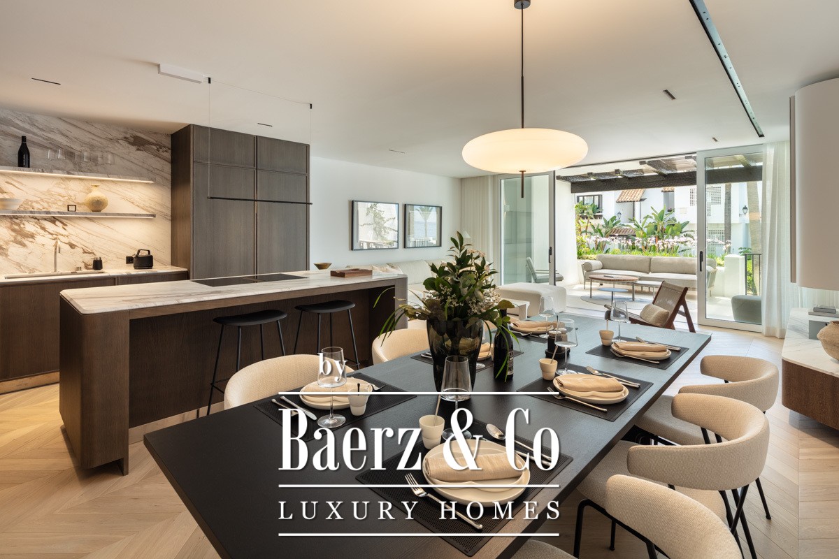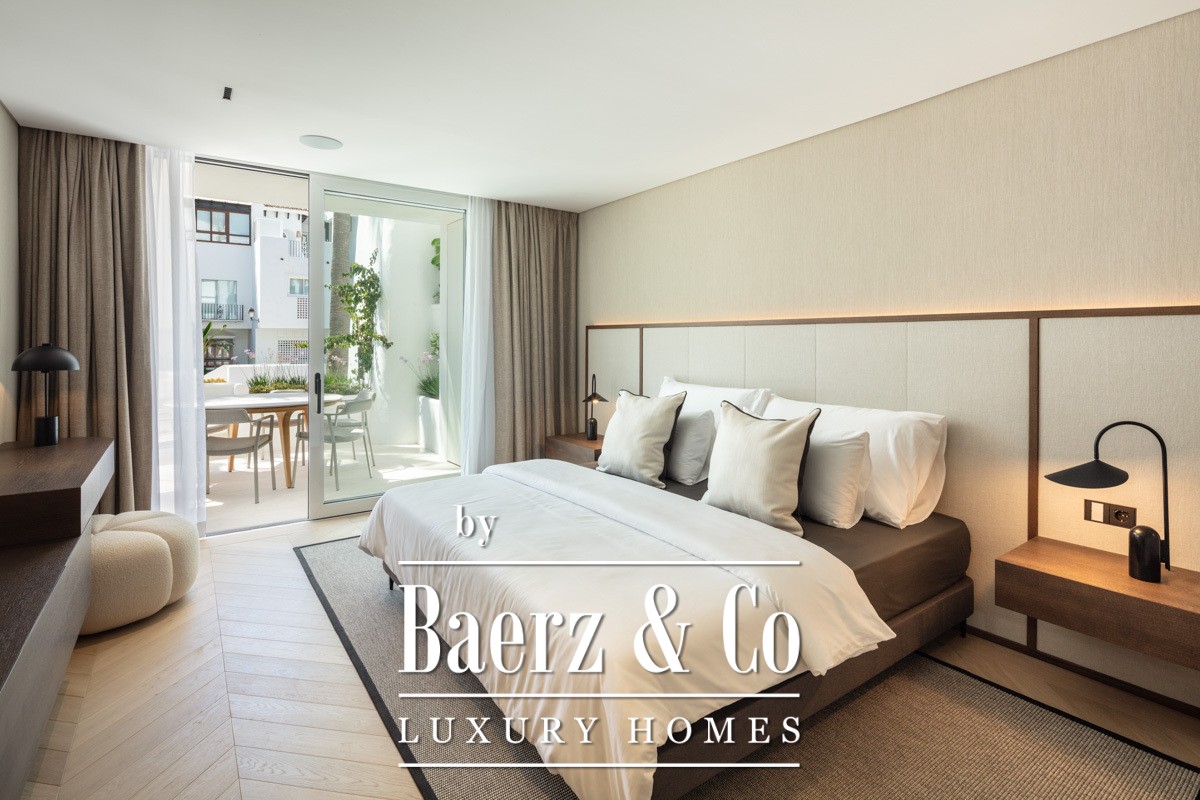 Das Apartment Marbella Golden Mile befindet sich im Puente Romano Resort, wo Licht und Meeresluft eine Atmosphäre dezenter Raffinesse schaffen. Diese 138 m² große Wohnung bietet einen lichtdurchfluteten, offenen Wohnbereich, der durch bodentiefe Glastüren geprägt ist. So fließen Terrasse, Gemeinschaftsgarten und Küstenblick nahtlos in das Innere. Die Kombination aus dezenten Farbtönen und natürlichem Holz unterstreicht die mediterrane Landschaft und schafft eine Atmosphäre der Ruhe in Wohn- wie Privaträumen.