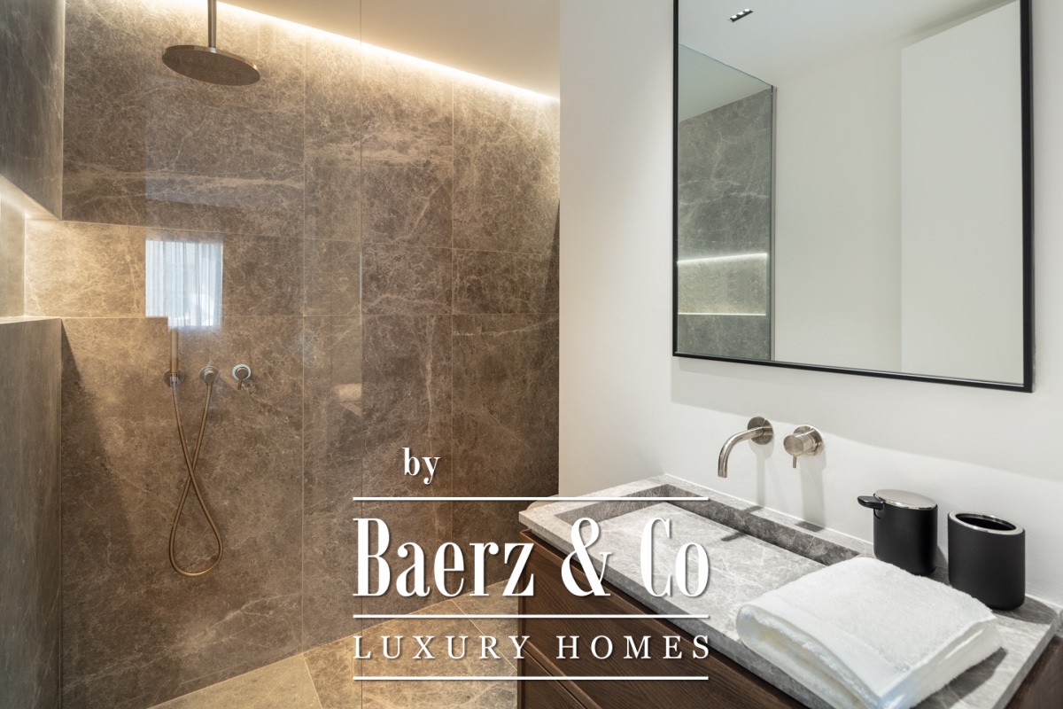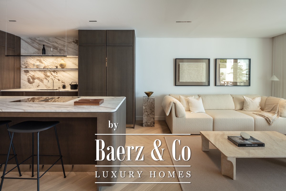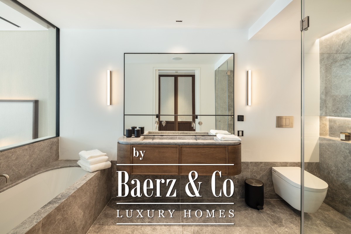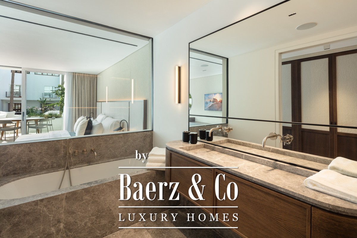 Die Küche ist mit edlem Marmor und versteckten Geräten ausgestattet und unterstützt sowohl stilvolles Entertainment als auch einen mühelosen Alltag. Die überdachte, großzügige Terrasse erweitert den Wohnraum ins Freie und lädt zu entspannten Stunden und Mahlzeiten unter freiem Himmel ein, mit direktem Zugang sowohl aus der Master Suite als auch dem Wohnbereich. Jede der drei Schlafzimmer verfügt über ein eigenes Badezimmer, ausgestattet mit erstklassigen Materialien. Die Master Suite mit einer Privacy-Glaswand und einem Doppelwaschtisch aus grauem Stein bietet einen diskreten Rückzugsort zum Entspannen.