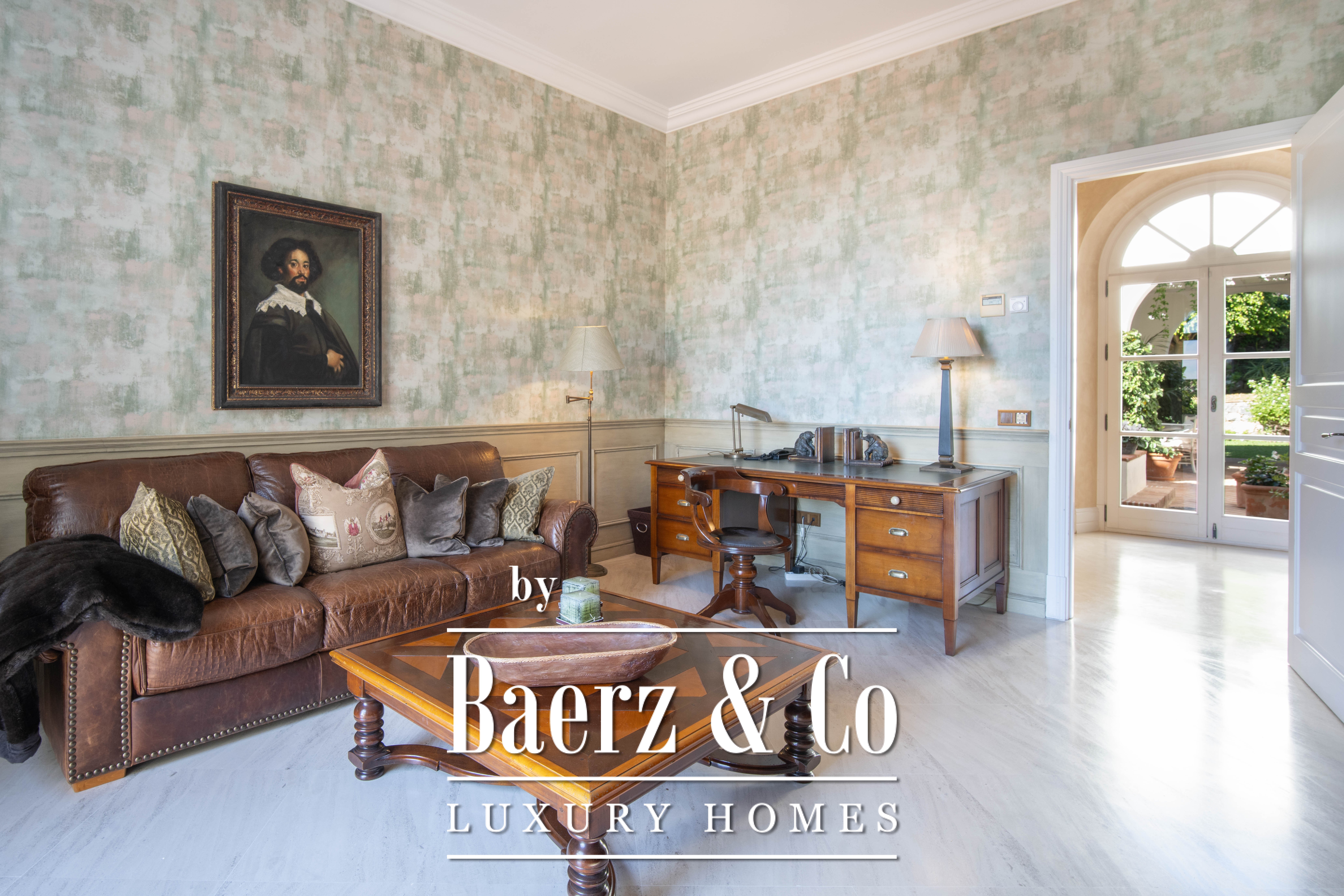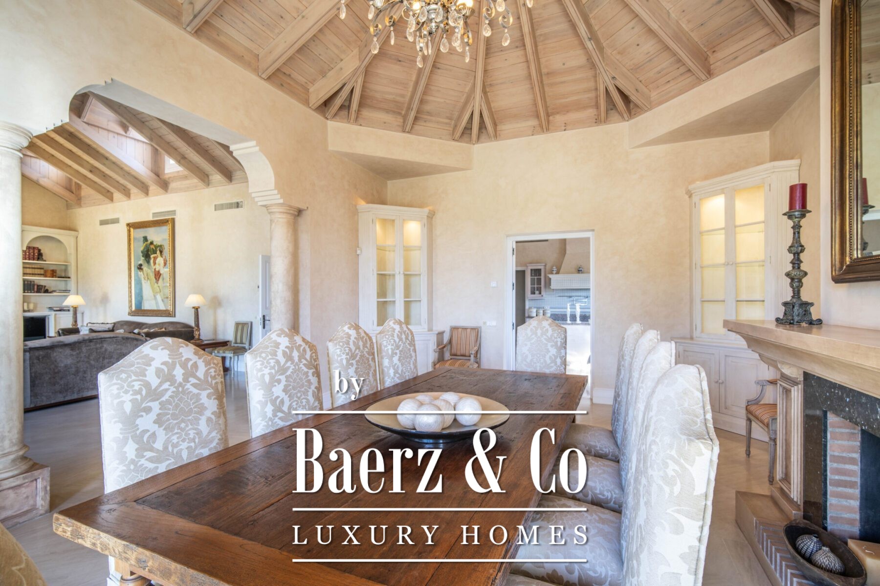 Natürliches Licht durchflutet die weitläufigen Wohnbereiche – vom Wohnzimmer mit Porzellanboden und Kamin bis hin zum eleganten Essbereich, Büro und separaten Gästeapartment. Eine voll ausgestattete Küche sowie eine hochwertige Möblierung heben das tägliche Wohnen auf ein neues Niveau. Überdachte und offene Terrassen schaffen nahtlose Übergänge ins Freie, wo ein privater beheizter Pool von gepflegten Gärten umgeben wird und Ausblicke auf das Meer, die Berge und reife Grünflächen bietet.