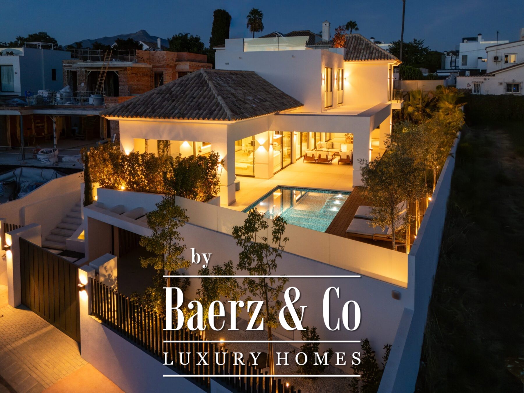 Diese moderne Villa in Marbella bietet einen diskreten Rückzugsort im begehrten Viertel San Pedro de Alcántara, wo Privatsphäre und architektonische Klarheit den Alltag prägen. Die großzügige Wohnfläche von 446 m² erstreckt sich hinter klaren weißen Wänden und gepflegtem Grün, was ein luxuriöses Refugium mit privatem Pool, Holzdeck und weitläufigen, überdachten Terrassen offenbart, die zum Speisen und Entspannen einladen. Eine Dachterrasse fängt die Essenz mediterraner Gelassenheit ein und schafft großzügigen Raum für geselliges Beisammensein oder stille Momente.