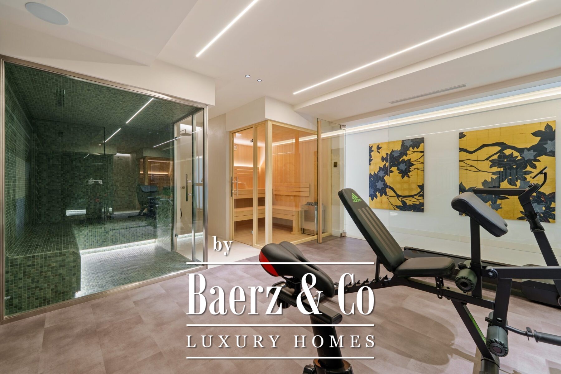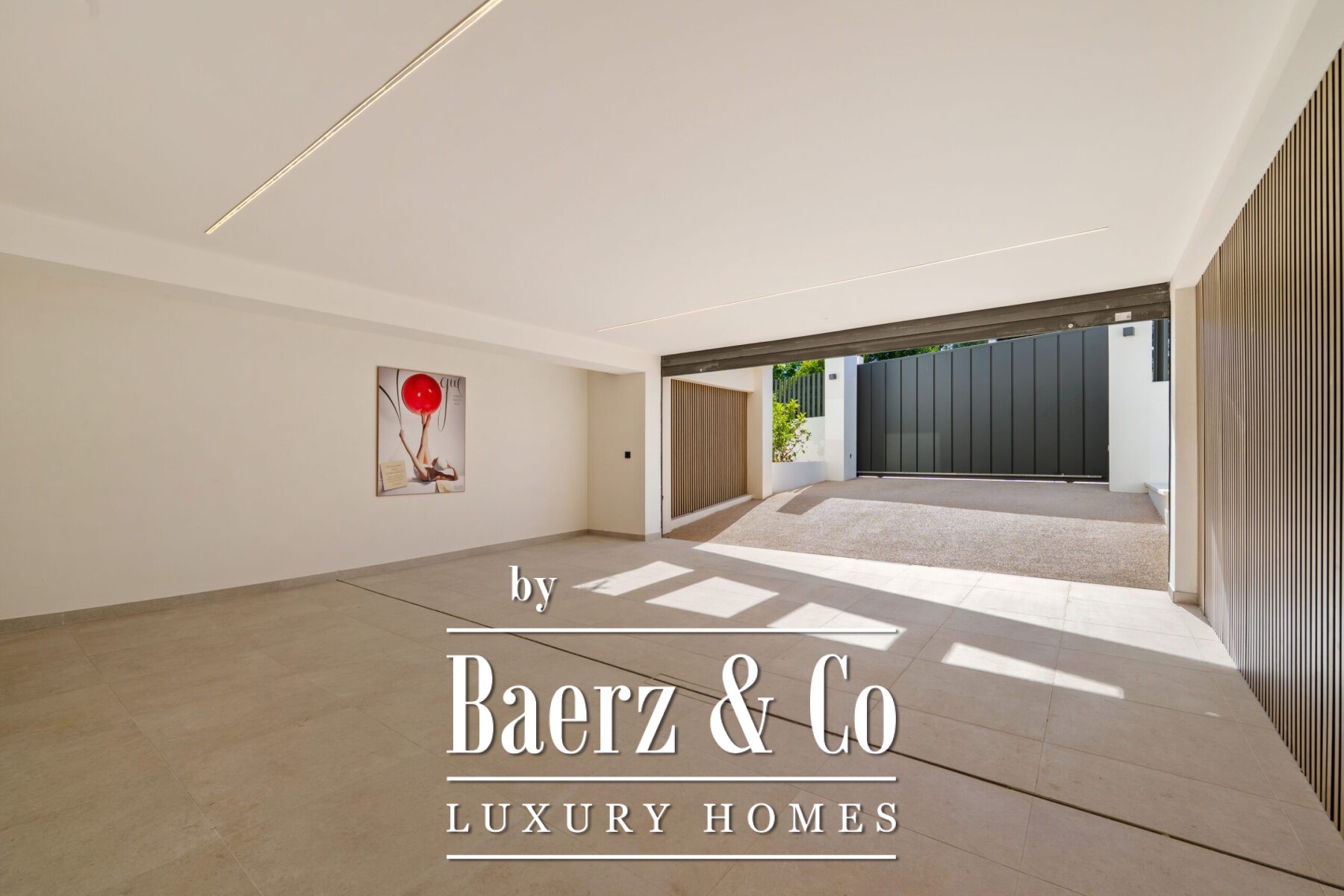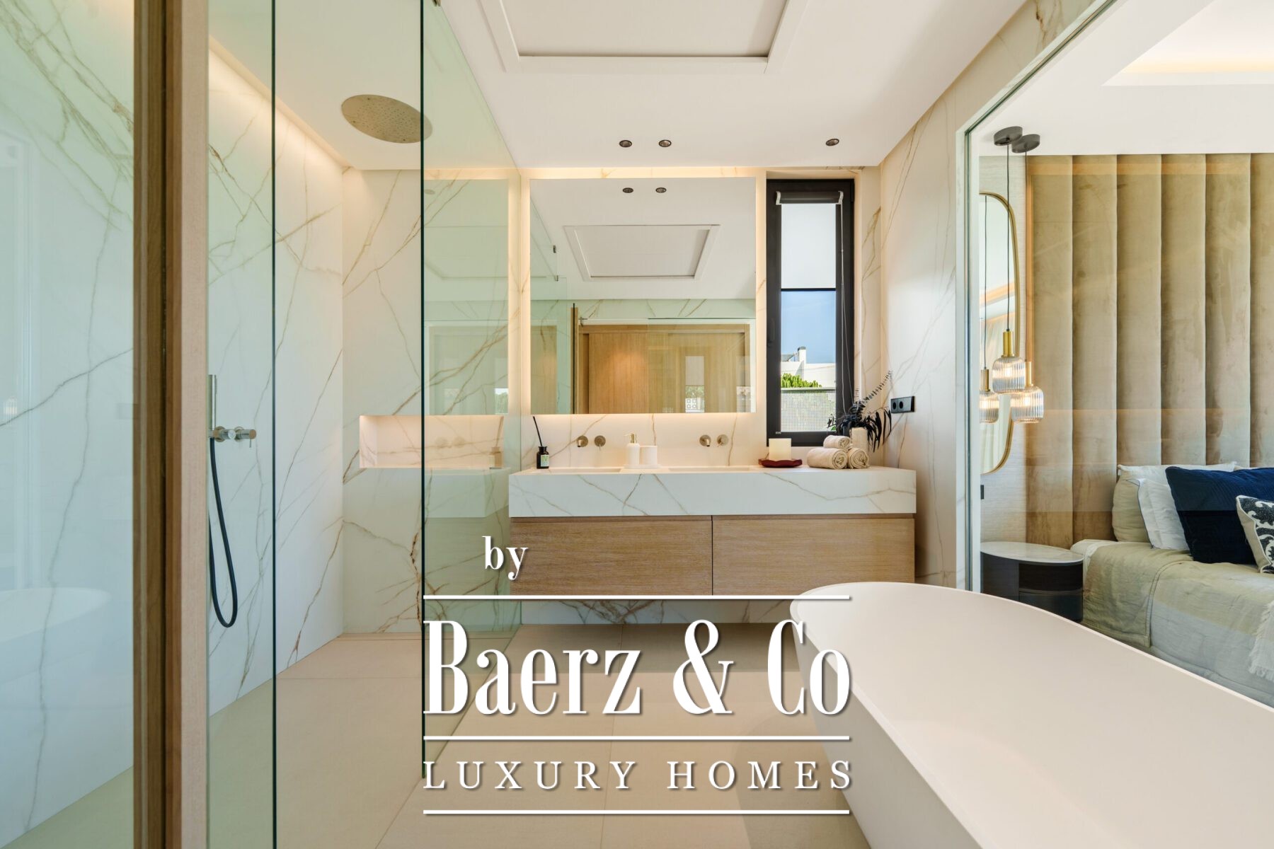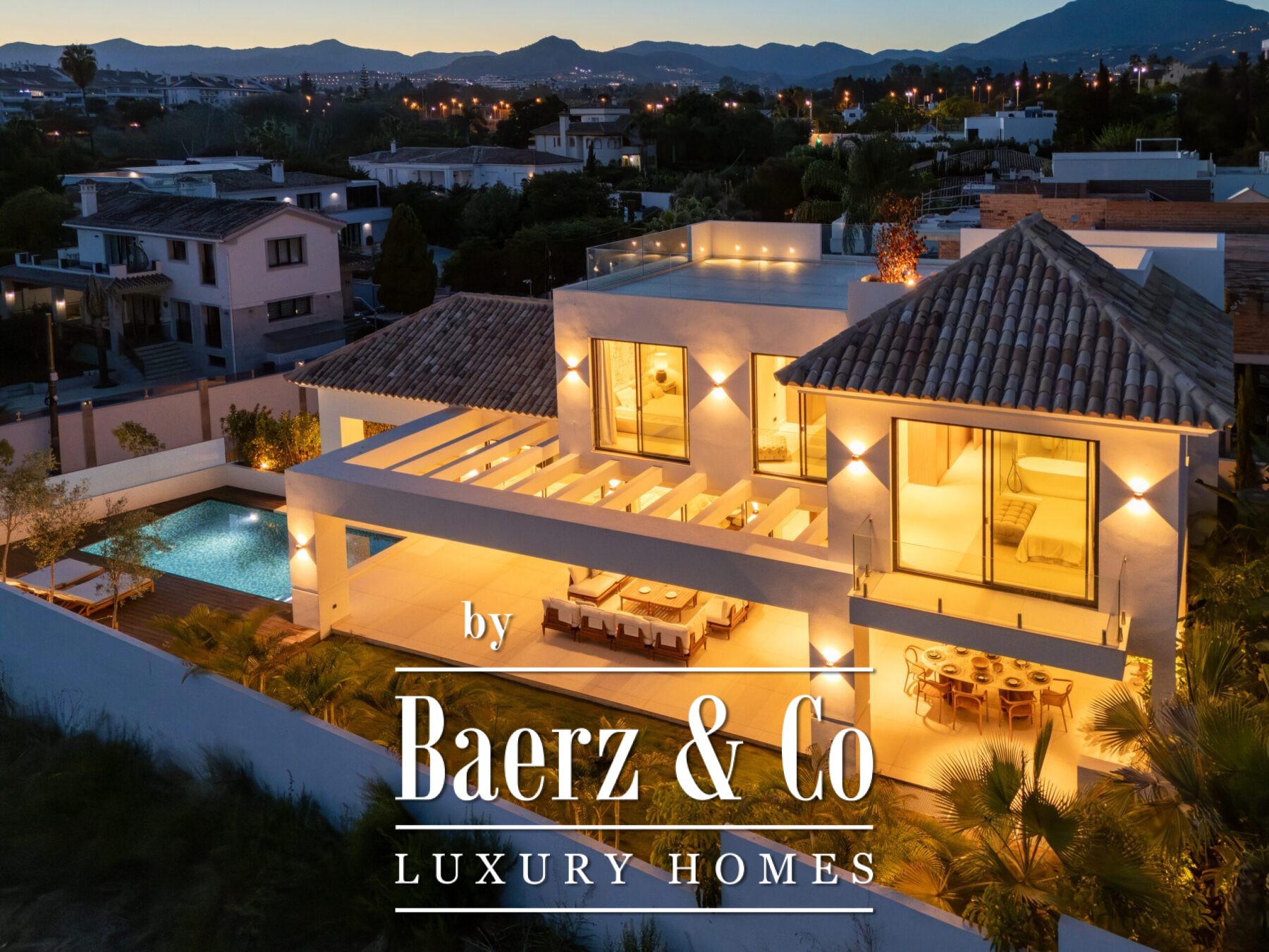 Fünf ruhige Schlafzimmer bieten direkten Zugang zu den Terrassen und verfügen jeweils über en-suite Bäder mit Marmorausstattung, wandhängenden Waschtischen und freistehenden Badewannen. Die Master-Suite besticht durch ihre Großzügigkeit und den sonnenverwöhnten Privatbalkon, der einen friedlichen Rückzugsort schafft. Im Untergeschoss bieten ein voll ausgestattetes Fitnessstudio, eine verglaste Sauna und ein Dampfbad einen persönlichen Wellnessbereich. Eine sichere Garage, ein eleganter Eingangsbereich und der Blick auf die umliegenden Berge vervollständigen dieses 612 m² große Grundstück. Alle modernen Annehmlichkeiten liegen in unmittelbarer Nähe zu Marbellas Golfplätzen, Stränden und lokalen Angeboten. Diese exklusive Villa zum Verkauf in Marbella steht für modernen mediterranen Lebensstil auf höchstem Niveau.