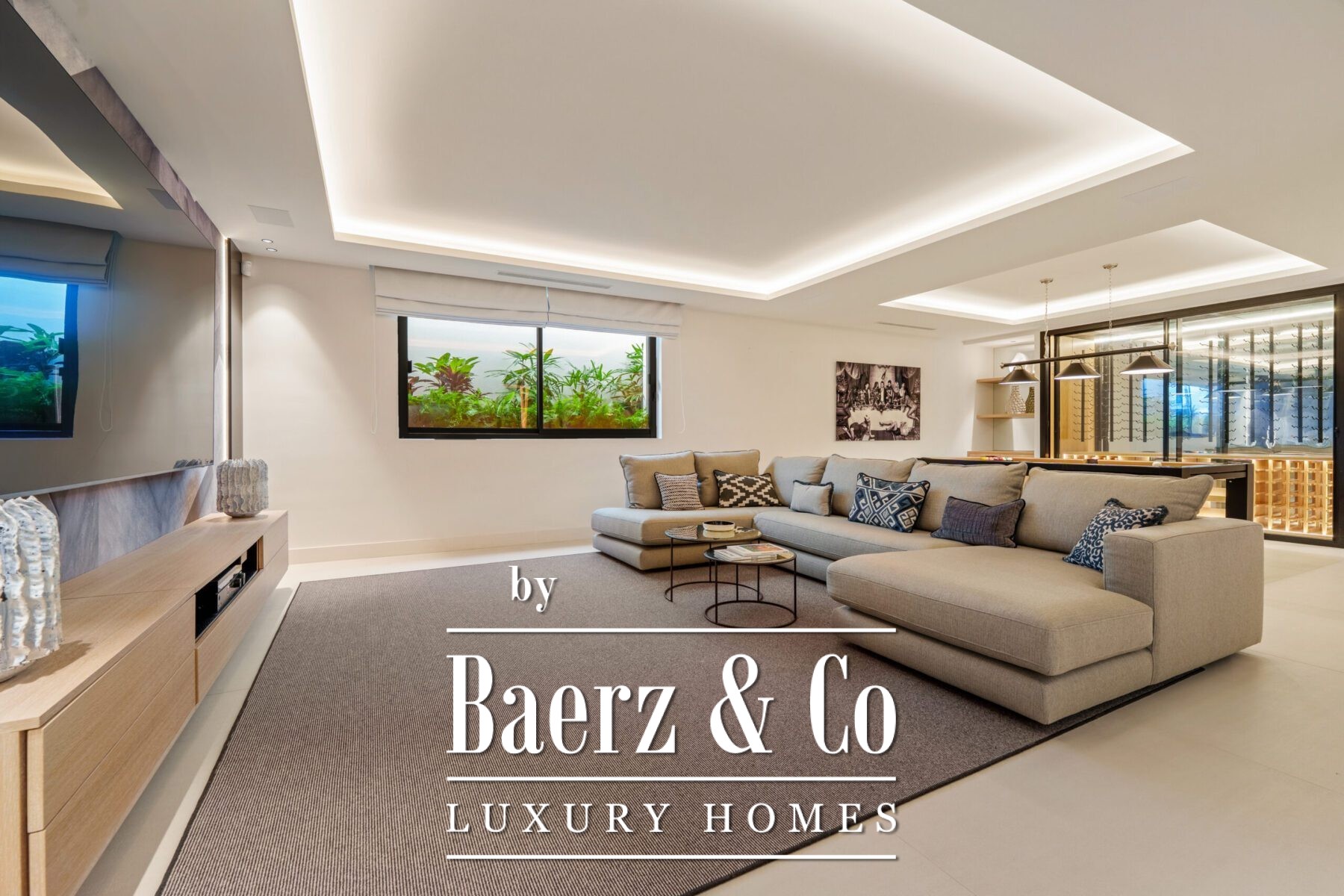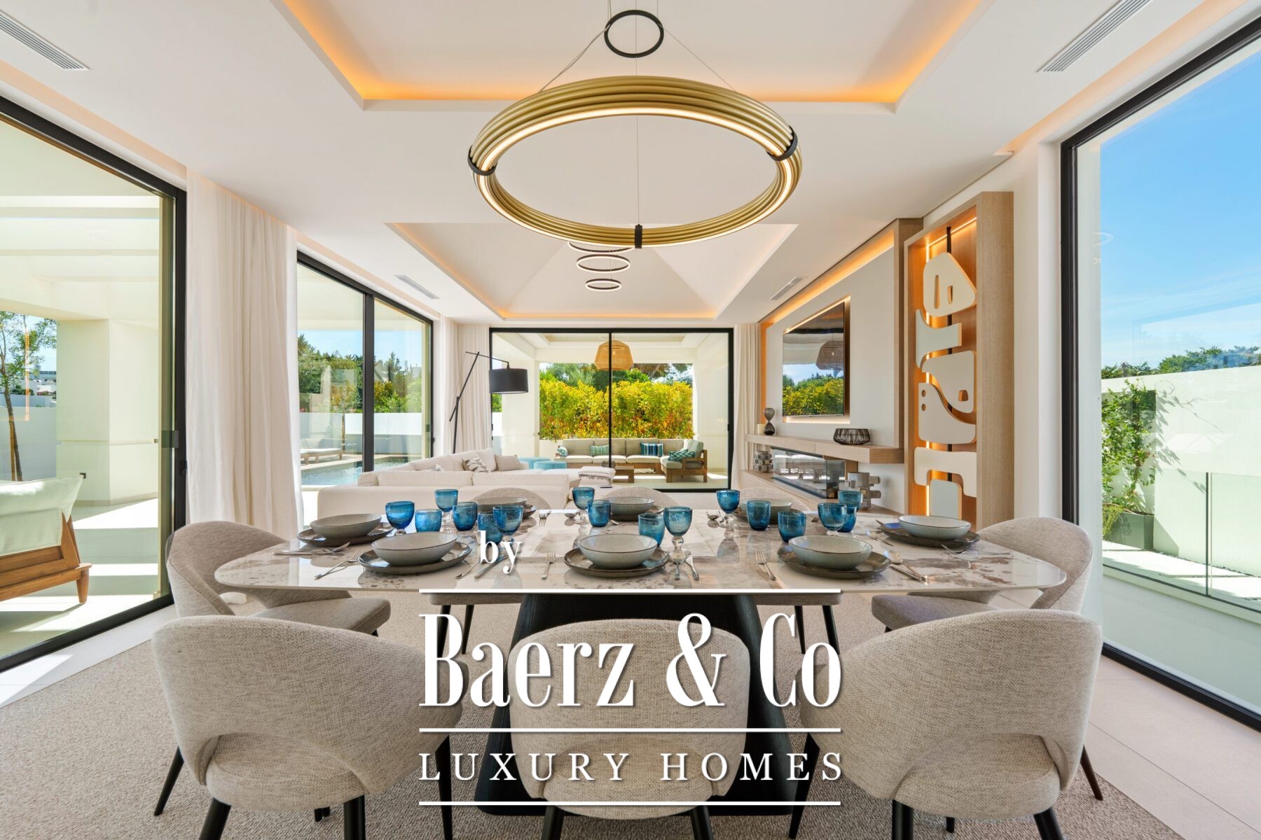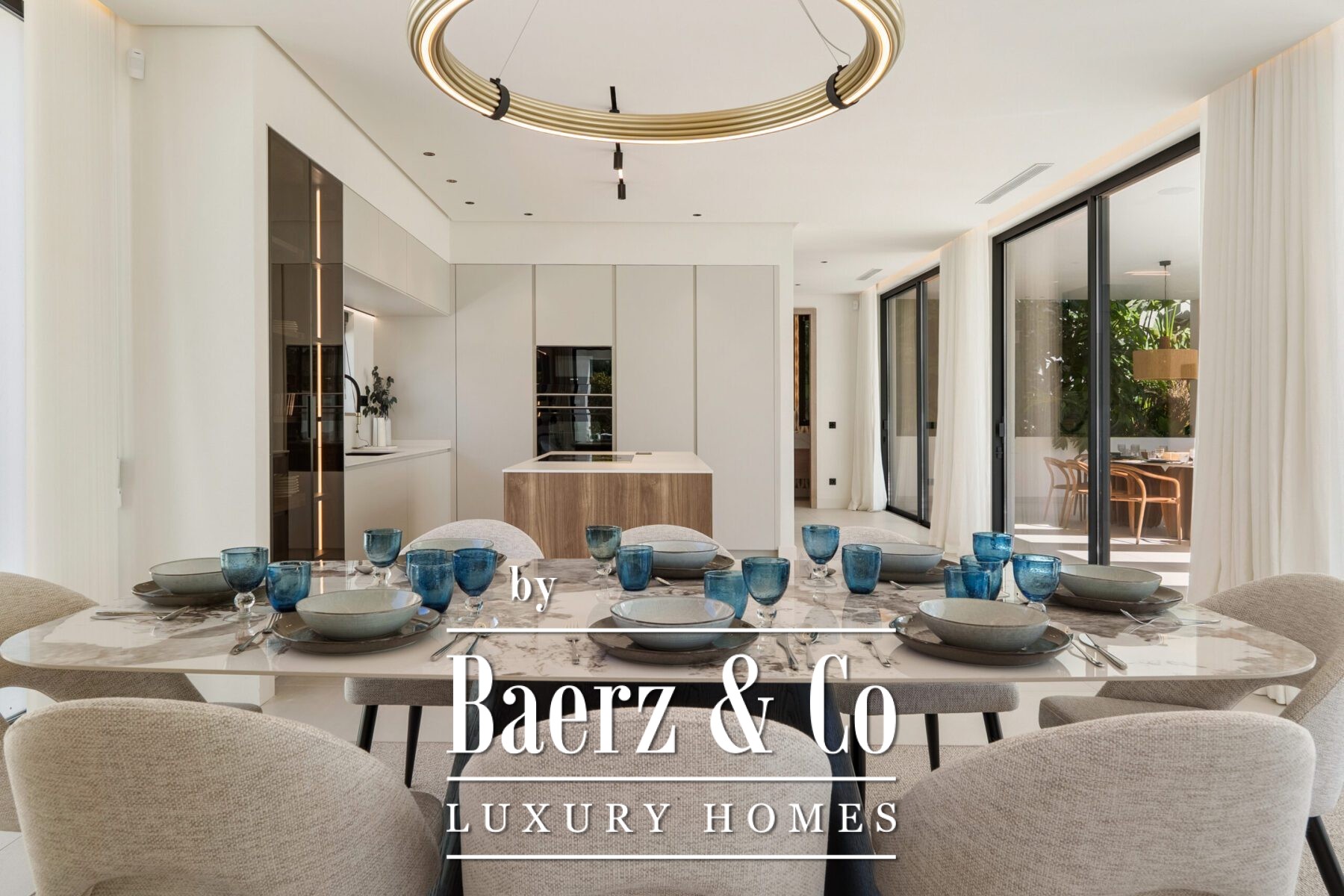 Das Ambiente im Inneren ist lichtdurchflutet und harmonisch, geprägt von sanften, neutralen Farbtönen, integrierter Beleuchtung und bodentiefen Fenstern, die das andalusische Licht hereinlassen. Der offene Wohn- und Essbereich, akzentuiert durch eine maßgefertigte Medienwand und moderne Beleuchtungselemente, geht nahtlos in die luxuriöse Küche über, wo eine Holzinsel und hochwertige Einbaugeräte auf elegante Schränke treffen. Das offene Raumkonzept setzt sich im Essbereich fort, der für unvergessliche Begegnungen geschaffen ist.