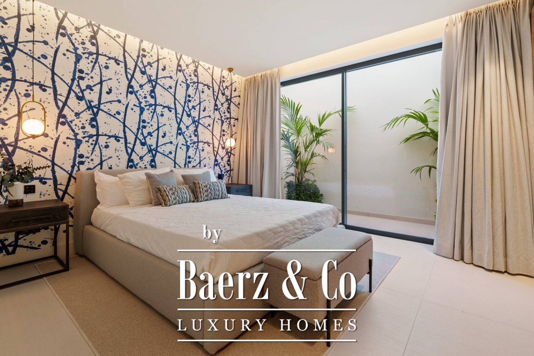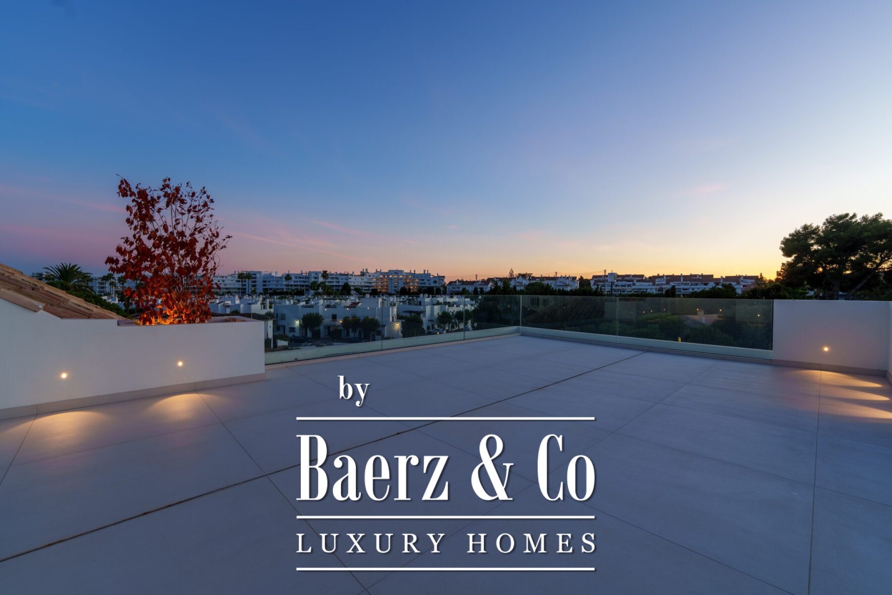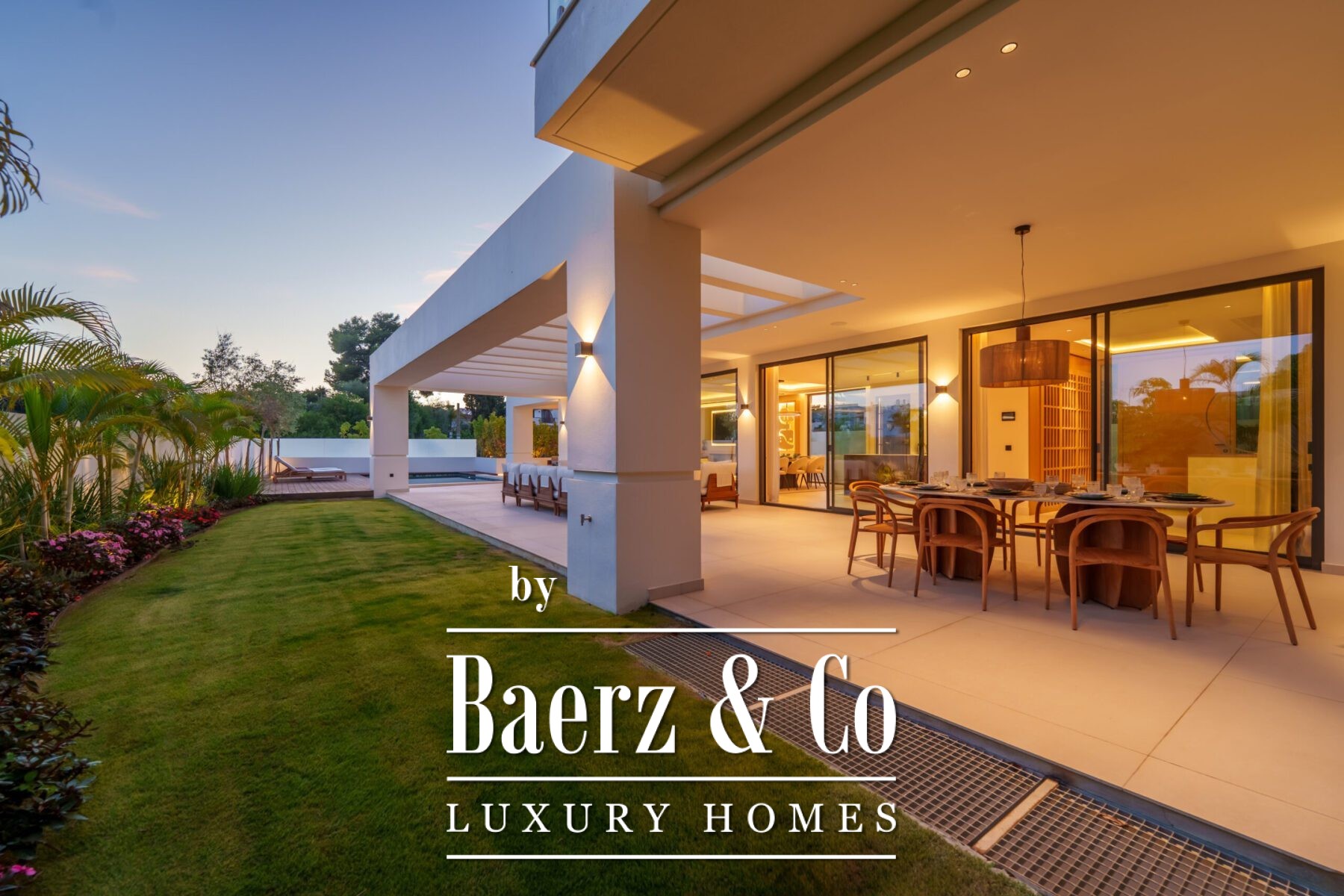 Das Ambiente im Inneren ist lichtdurchflutet und harmonisch, geprägt von sanften, neutralen Farbtönen, integrierter Beleuchtung und bodentiefen Fenstern, die das andalusische Licht hereinlassen. Der offene Wohn- und Essbereich, akzentuiert durch eine maßgefertigte Medienwand und moderne Beleuchtungselemente, geht nahtlos in die luxuriöse Küche über, wo eine Holzinsel und hochwertige Einbaugeräte auf elegante Schränke treffen. Das offene Raumkonzept setzt sich im Essbereich fort, der für unvergessliche Begegnungen geschaffen ist.