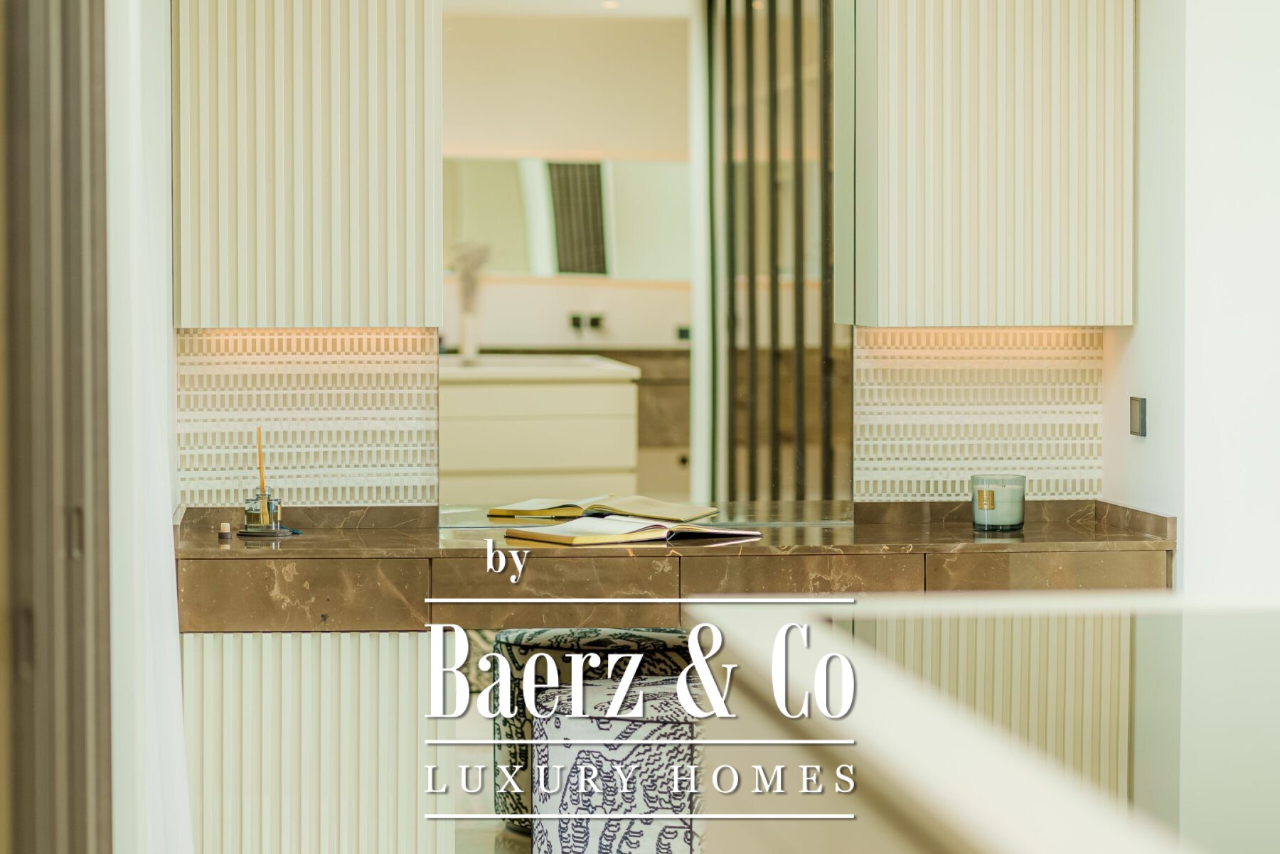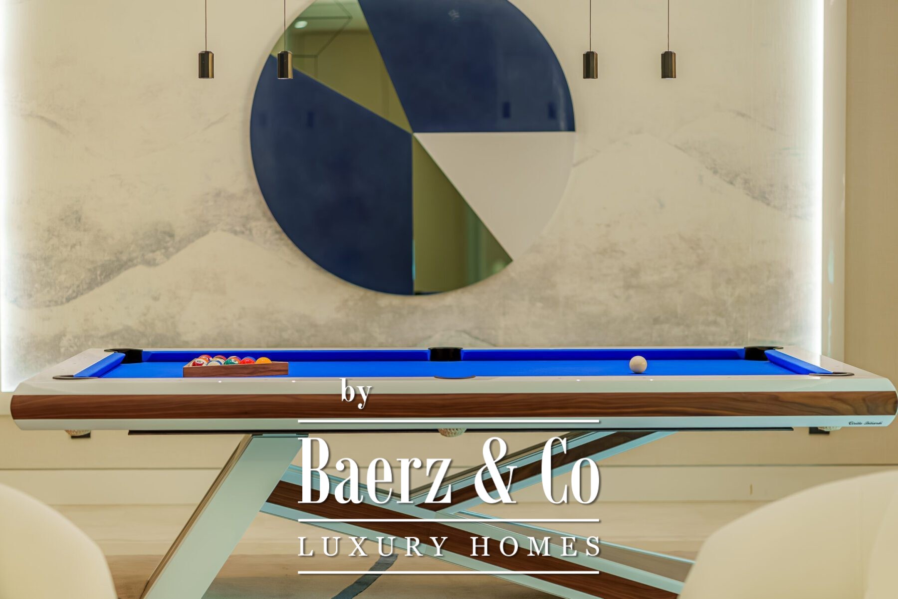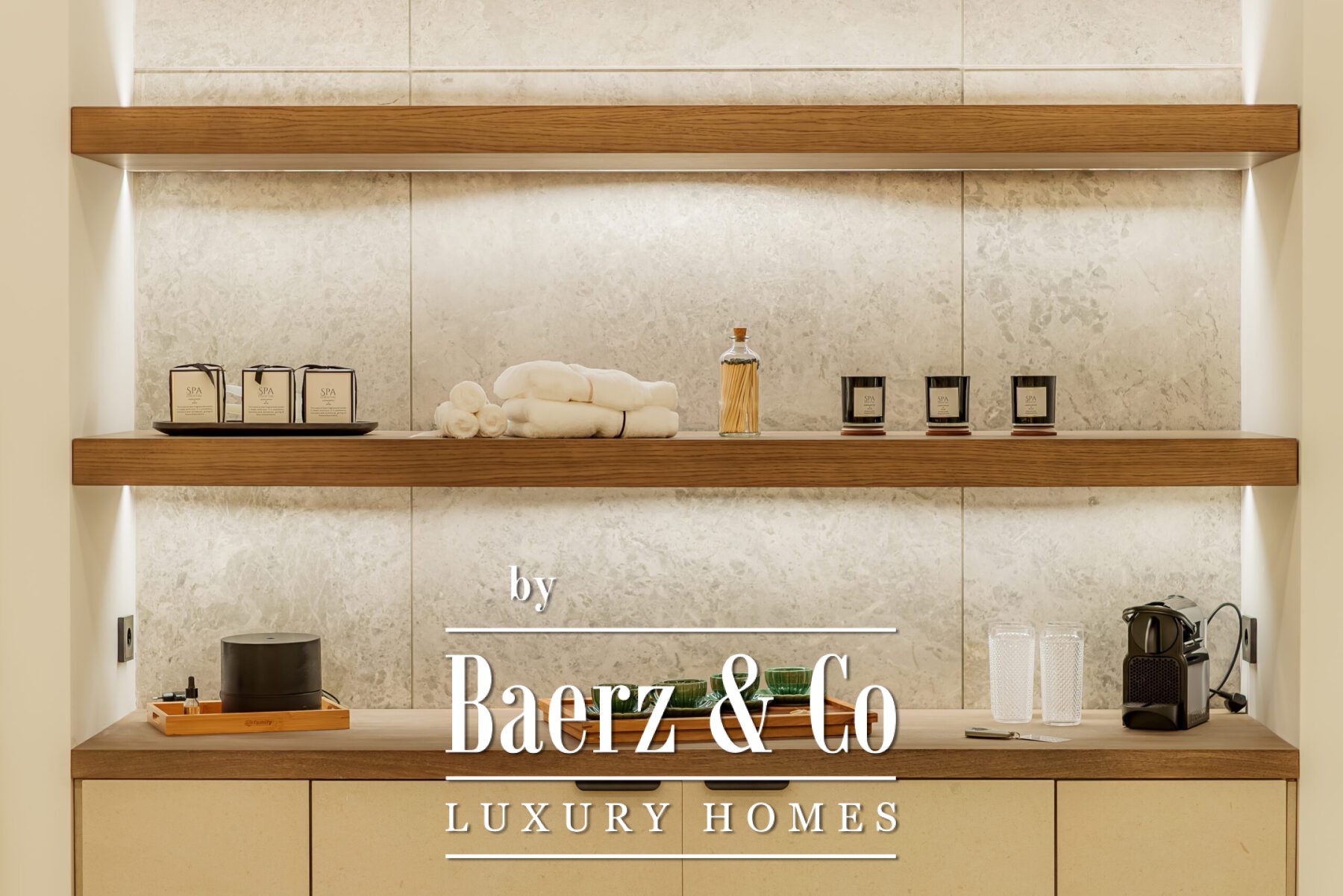 Der zentrale Wohnbereich besticht durch beeindruckend hohe Decken und raumhohe Glas-Schiebetüren, die vollständig in den Wänden verschwinden und so viel Tageslicht hereinlassen. Sie verbinden das Innere mit großzügigen Terrassen, einem angelegten Garten und dem Infinity-Pool. Der offene Grundriss schafft Raum für Ruhe und Geselligkeit gleichermaßen und spiegelt einen anspruchsvollen Rhythmus des Alltags wider.