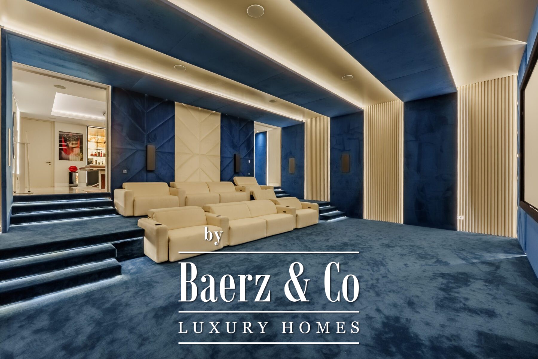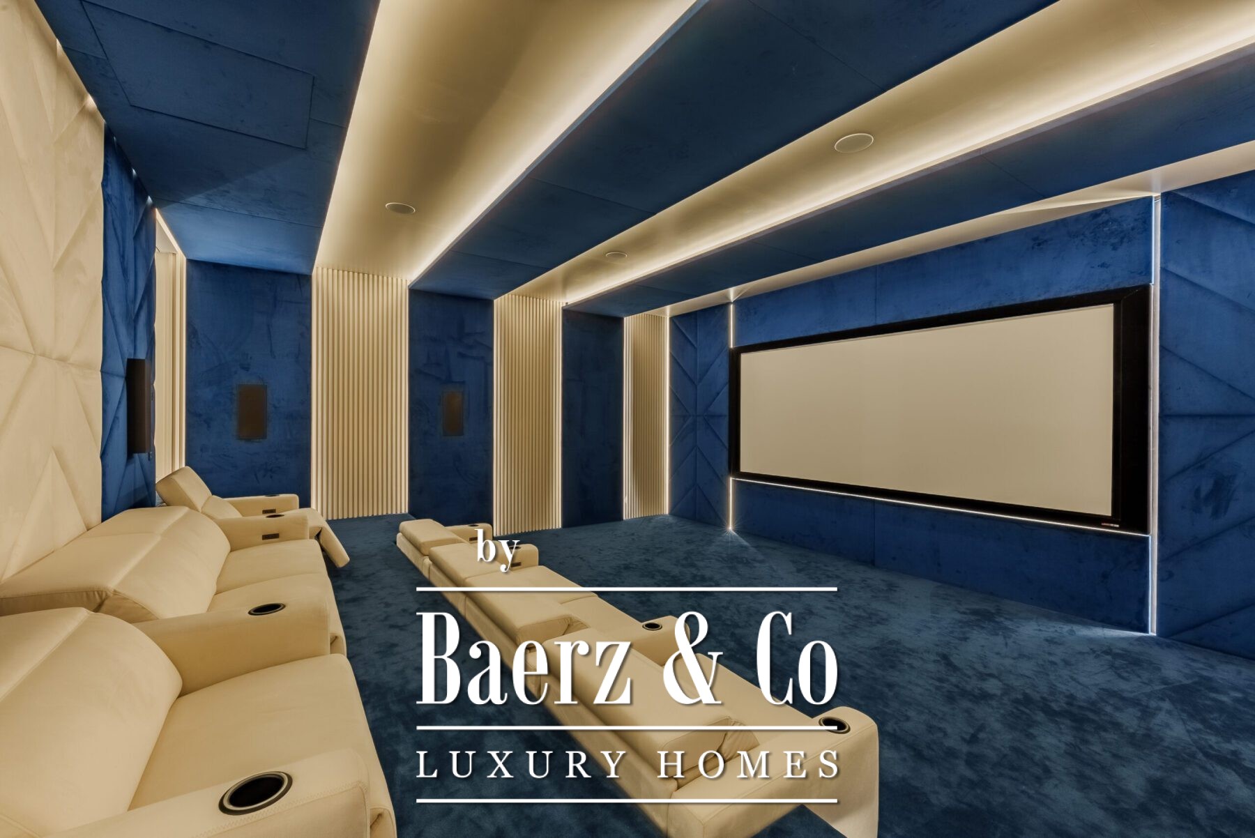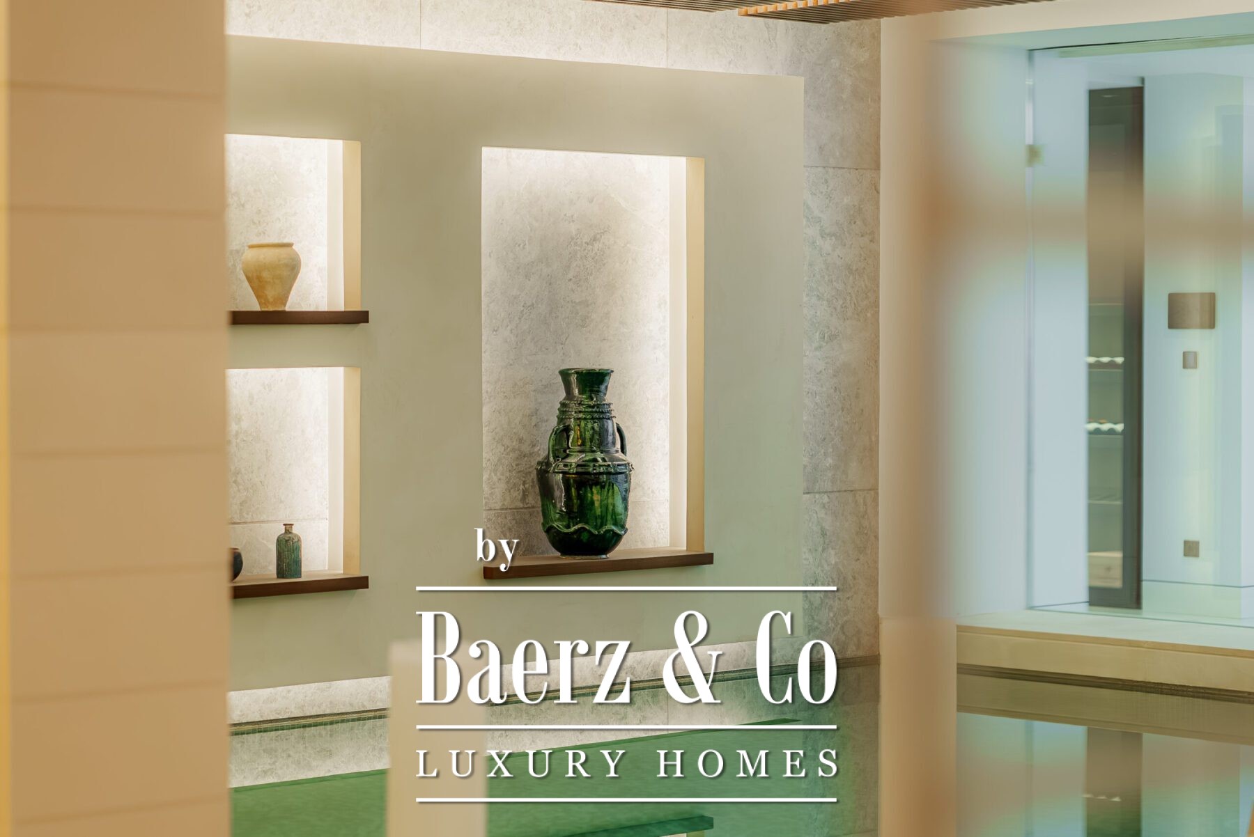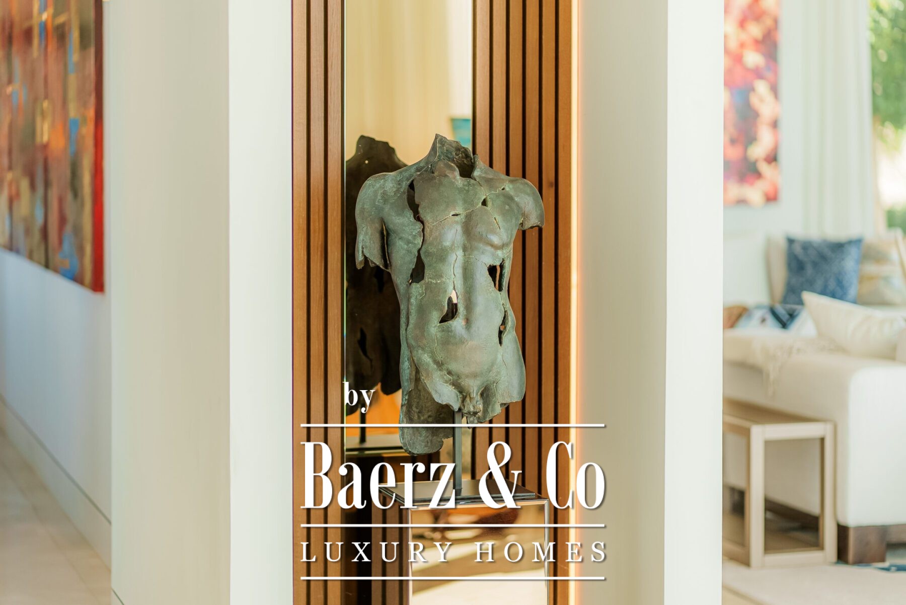 Der zentrale Wohnbereich besticht durch beeindruckend hohe Decken und raumhohe Glas-Schiebetüren, die vollständig in den Wänden verschwinden und so viel Tageslicht hereinlassen. Sie verbinden das Innere mit großzügigen Terrassen, einem angelegten Garten und dem Infinity-Pool. Der offene Grundriss schafft Raum für Ruhe und Geselligkeit gleichermaßen und spiegelt einen anspruchsvollen Rhythmus des Alltags wider.
