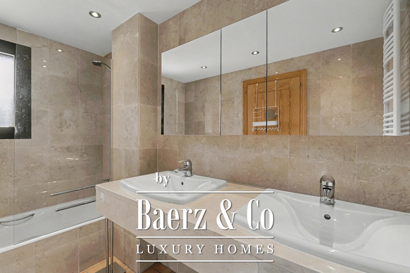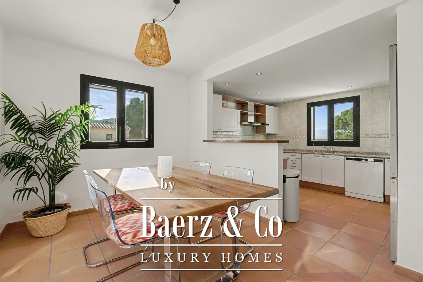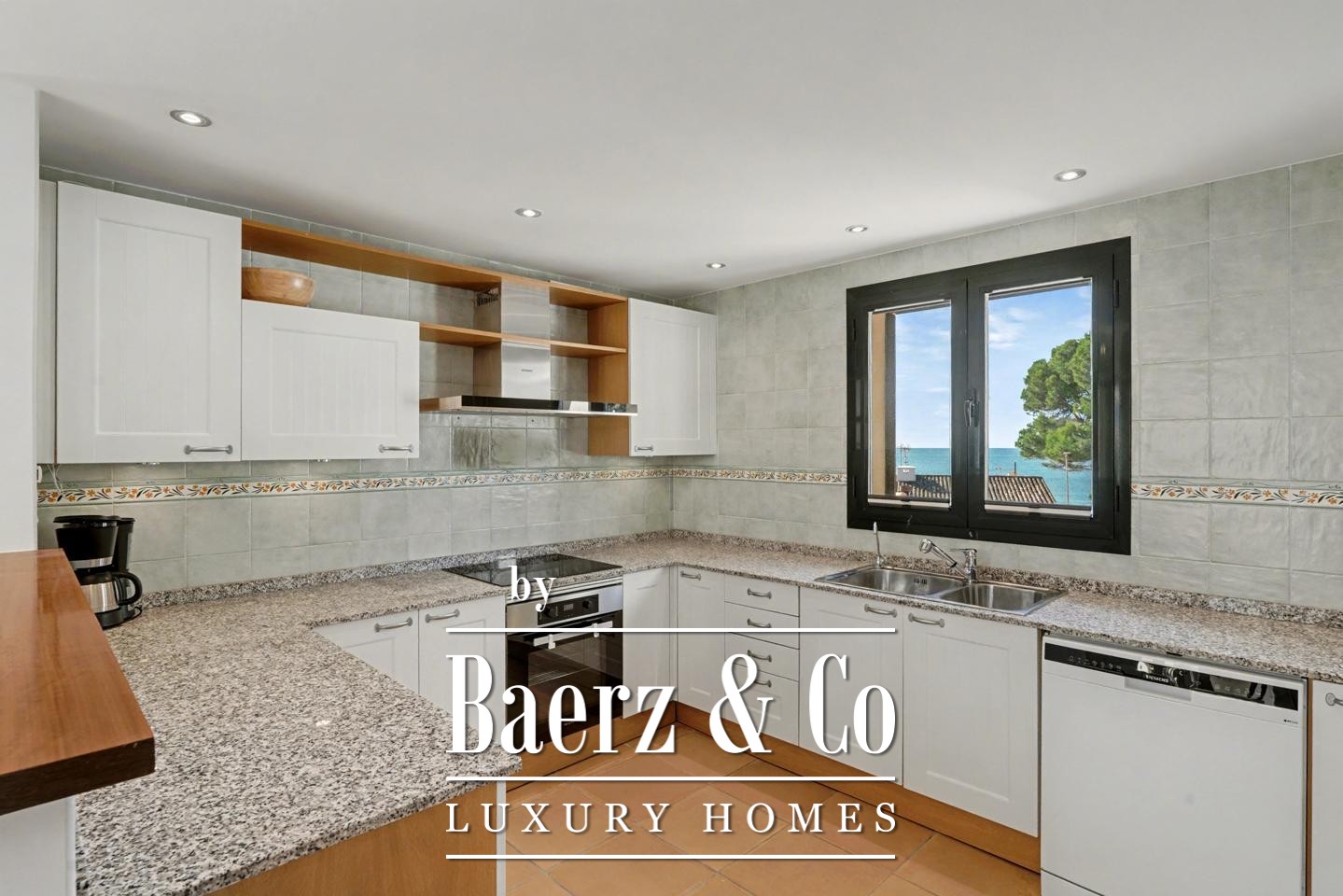 Das Hauptschlafzimmer verfügt über ein eigenes Bad, während das Gästezimmer und das separate Bad Komfort und Gelassenheit gewährleisten. Über die Turmtreppe gelangen Sie zur privaten Dachterrasse, die ganztägig Sonne und einen beeindruckenden Blick über die Bucht bietet. Klimaanlage, Alarmsystem und gemeinschaftlicher Parkplatz unterstreichen Komfort und Sicherheit.