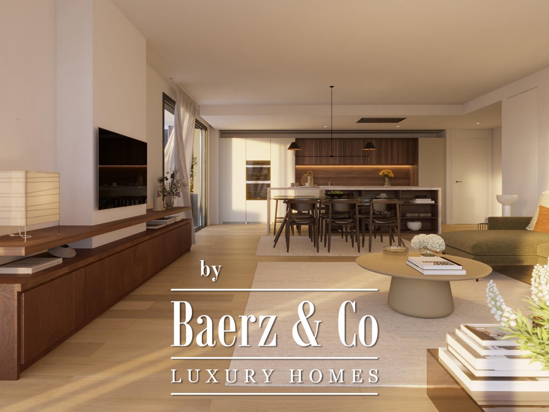 Drei Schlafzimmer, jeweils mit Einbauschränken, schaffen Rückzugsorte und Ordnung. Die Master-Suite verfügt über ein eigenes Bad; ein zweites, voll ausgestattetes Badezimmer steht Familie oder Gästen zur Verfügung. Ein Hauswirtschaftsbereich sowie durchdachte Stauräume bieten praktische Funktionalität, während Details wie eine gepanzerte Eingangstür und eine Video-Gegensprechanlage Privatsphäre und Komfort verstärken. Die BREEAM-Zertifizierung der Wohnung unterstreicht den zukunftsorientierten Ansatz im Bereich Nachhaltigkeit.