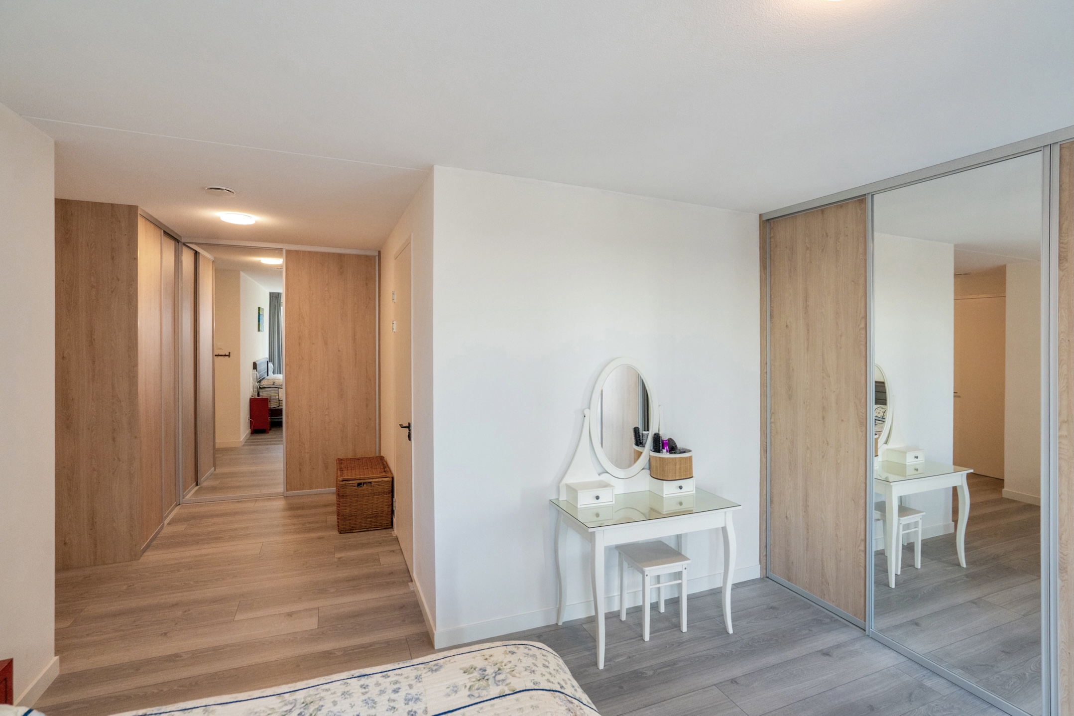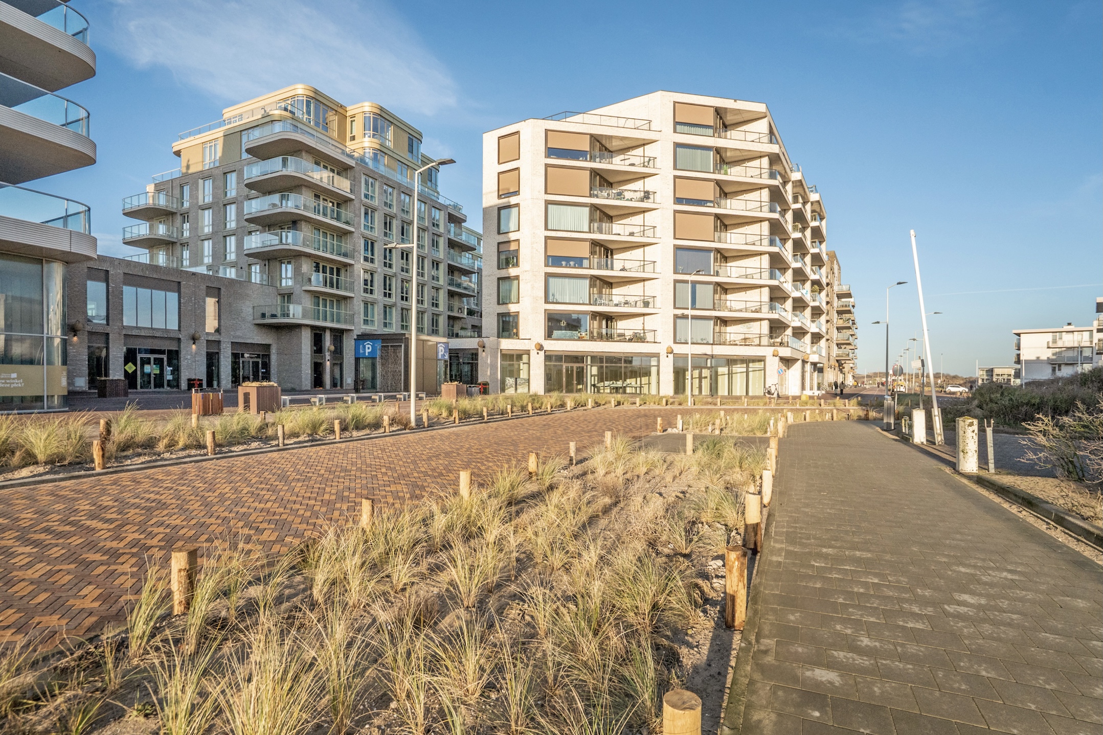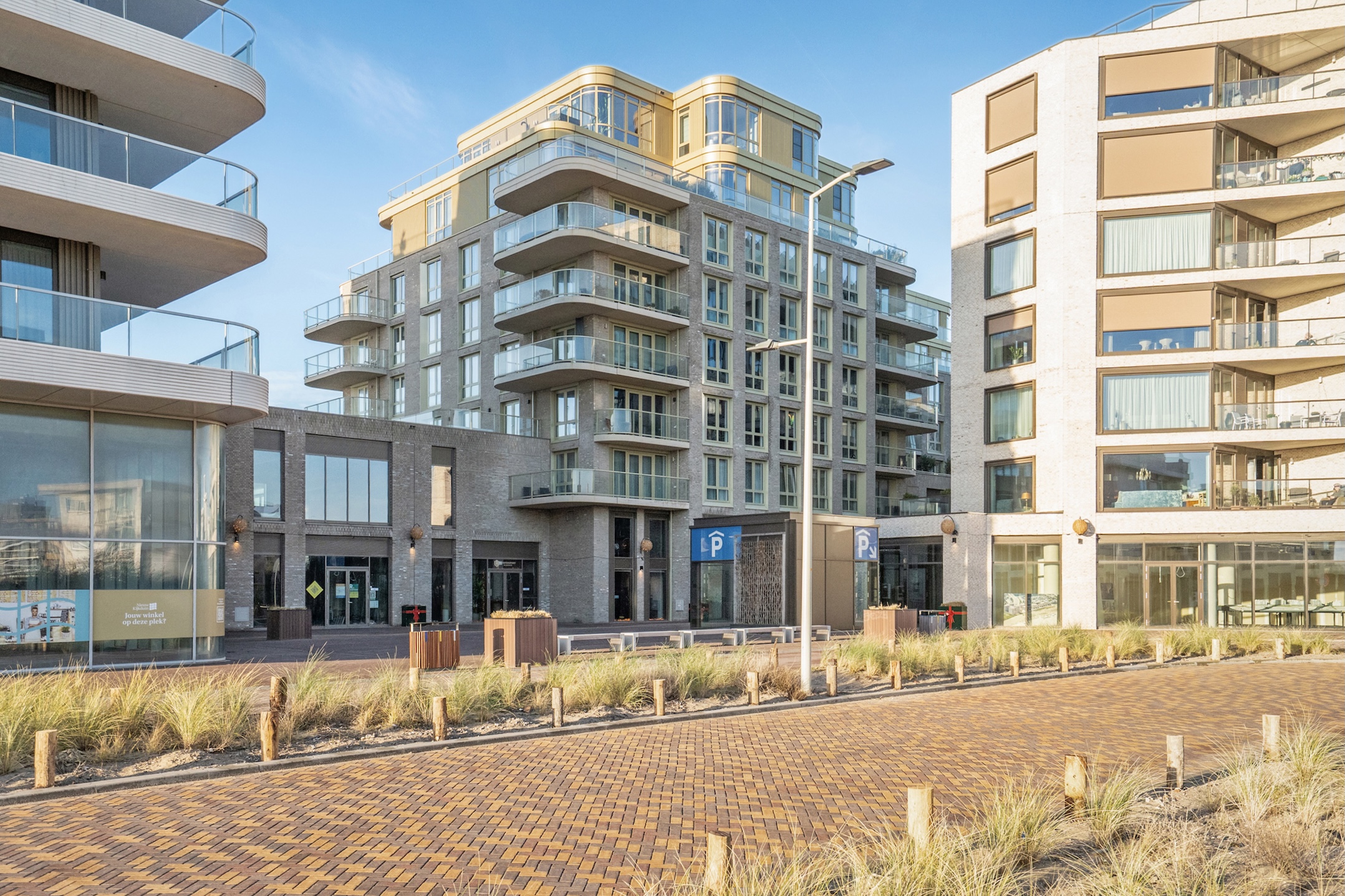 Behind the front door, you enter a spacious entrance hall with a wide closet wall for coats and shoes. There is also access to a separate deep toilet. Through a closed door, you enter the impressive living room with large floor-to-ceiling windows and the open kitchen, together creating a pleasant living space. A neat kitchen arranged along the width, equipped with all necessary built-in appliances such as a refrigerator, freezer, induction cooktop, combination microwave, and dishwasher. From the living room and kitchen, you always have a diagonal view of the sea.