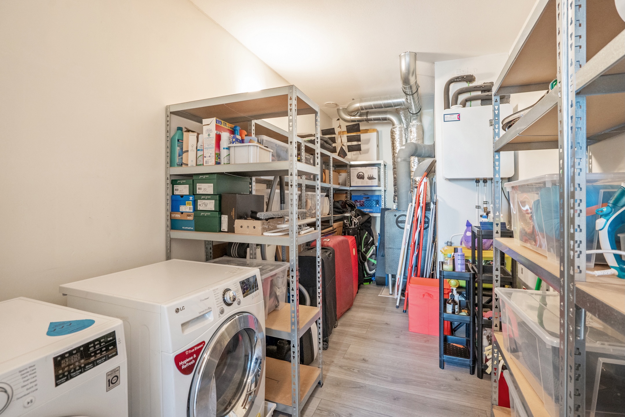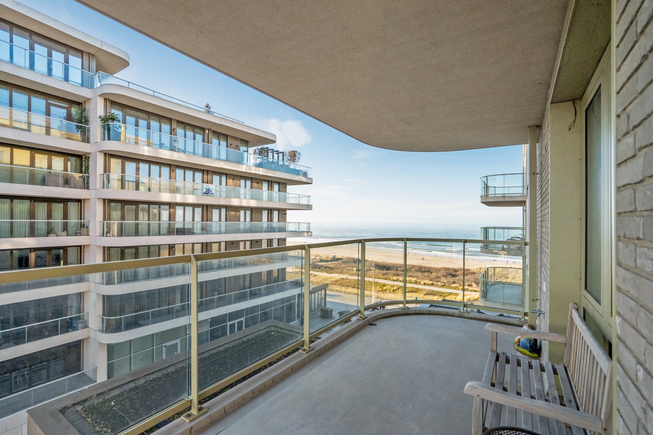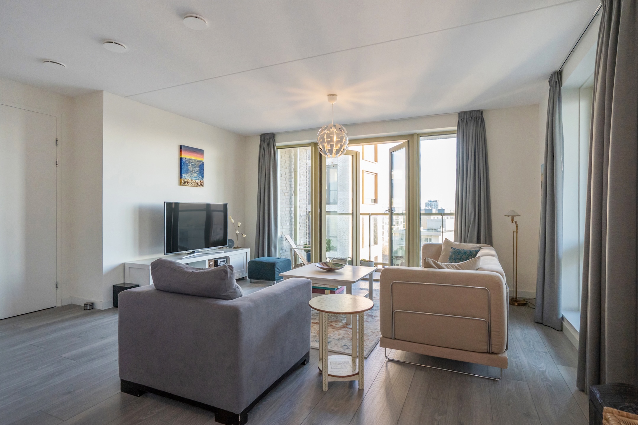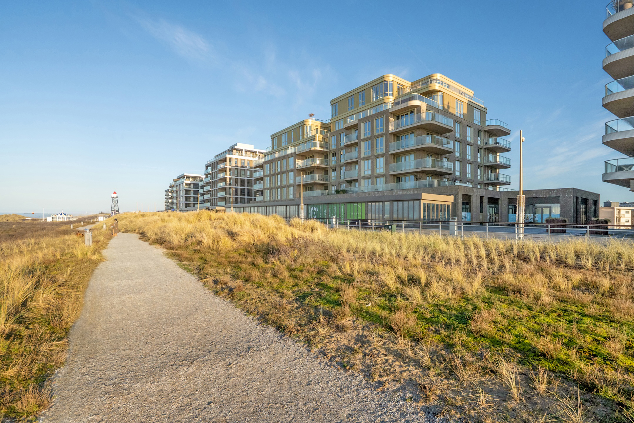Behind the front door, you enter a spacious entrance hall with a wide closet wall for coats and shoes. There is also access to a separate deep toilet. Through a closed door, you enter the impressive living room with large floor-to-ceiling windows and the open kitchen, together creating a pleasant living space. A neat kitchen arranged along the width, equipped with all necessary built-in appliances such as a refrigerator, freezer, induction cooktop, combination microwave, and dishwasher. From the living room and kitchen, you always have a diagonal view of the sea.