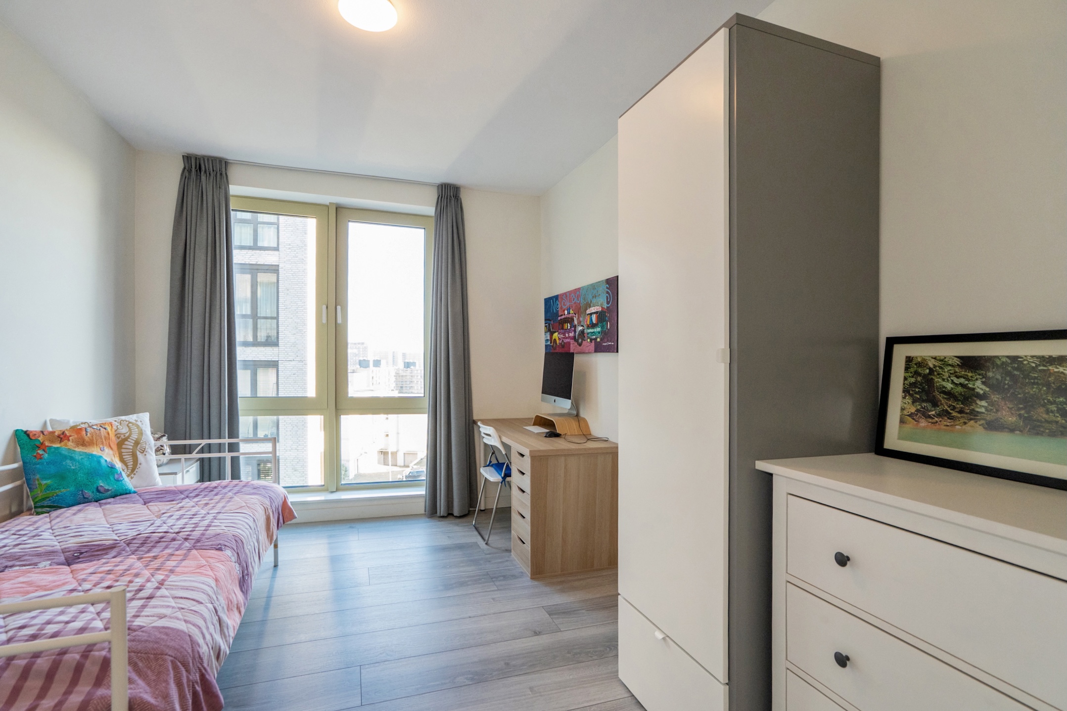 This property has 3 full-sized bedrooms. Immediately on the right side of the hallway, you will find the first 2 bright bedrooms. The described hallway leads to a spacious hall with double wardrobes arranged in a corner setup, access to a bathroom, and a generous master bedroom, which also has a large wardrobe wall and 2 large windows. Then there is the spacious bathroom, featuring a dark gray tiled floor, towel radiator, wide vanity unit with double sinks and faucets, a bathtub, a deep walk-in shower, and the 3rd wall-mounted toilet.