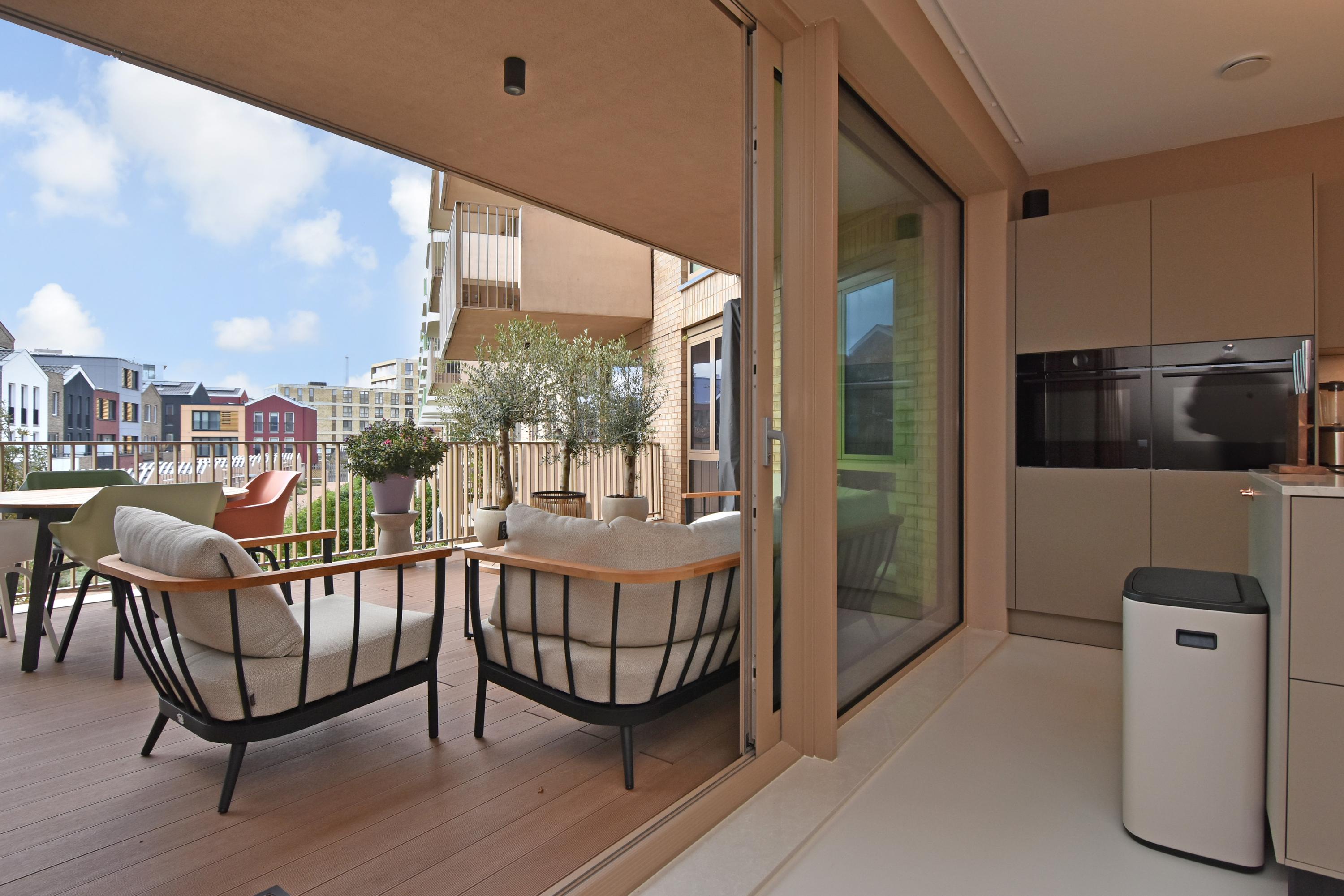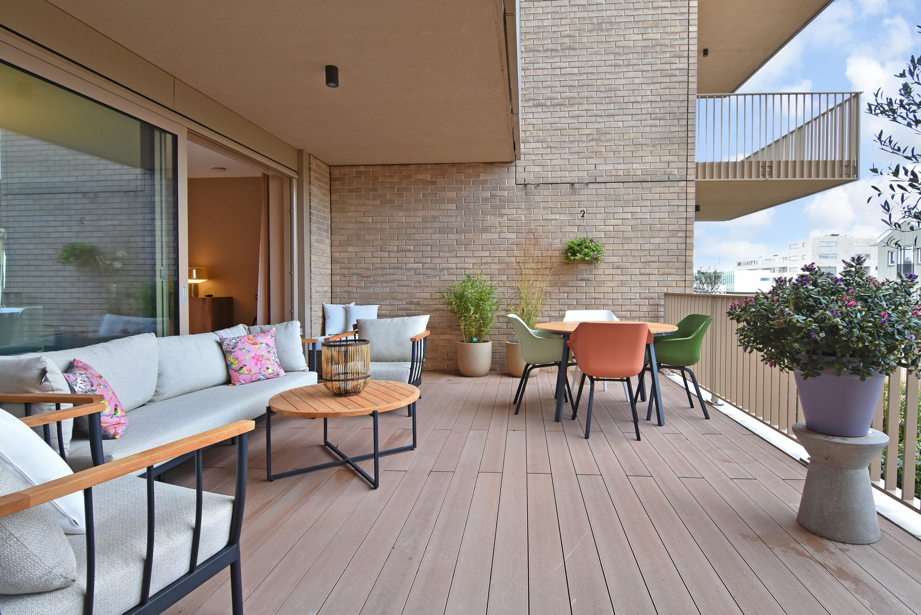 At the front is the seating area with a stylish custom-made wall unit featuring a closable workspace. At the rear you’ll find the designer kitchen with cooking island and every imaginable luxury built-in appliance, including an induction hob with integrated extractor, Quooker, dishwasher, combi-oven, spacious refrigerator, and separate freezer. From the kitchen, the large sliding doors open onto the generous balcony, where you can peacefully enjoy the afternoon and evening sun.