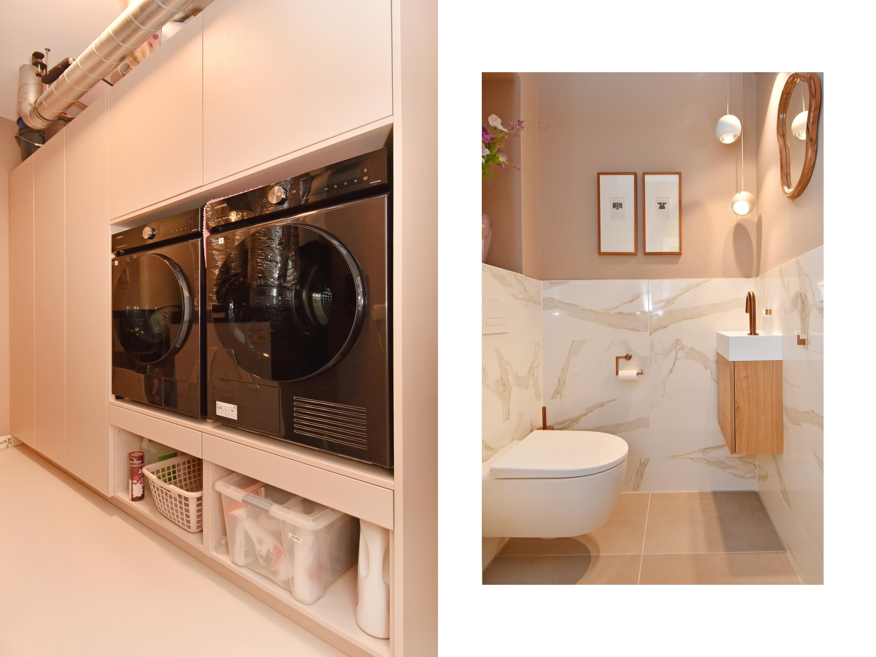 The contemporary bathroom is designed according to the latest trends and equipped with a walk-in shower, elegant washbasin unit, and bathtub. There is also a separate toilet and a practical storage room with custom-made cabinetry for the washing machine and dryer. This is also where the heat recovery unit (WTW) and heat pump are located.
