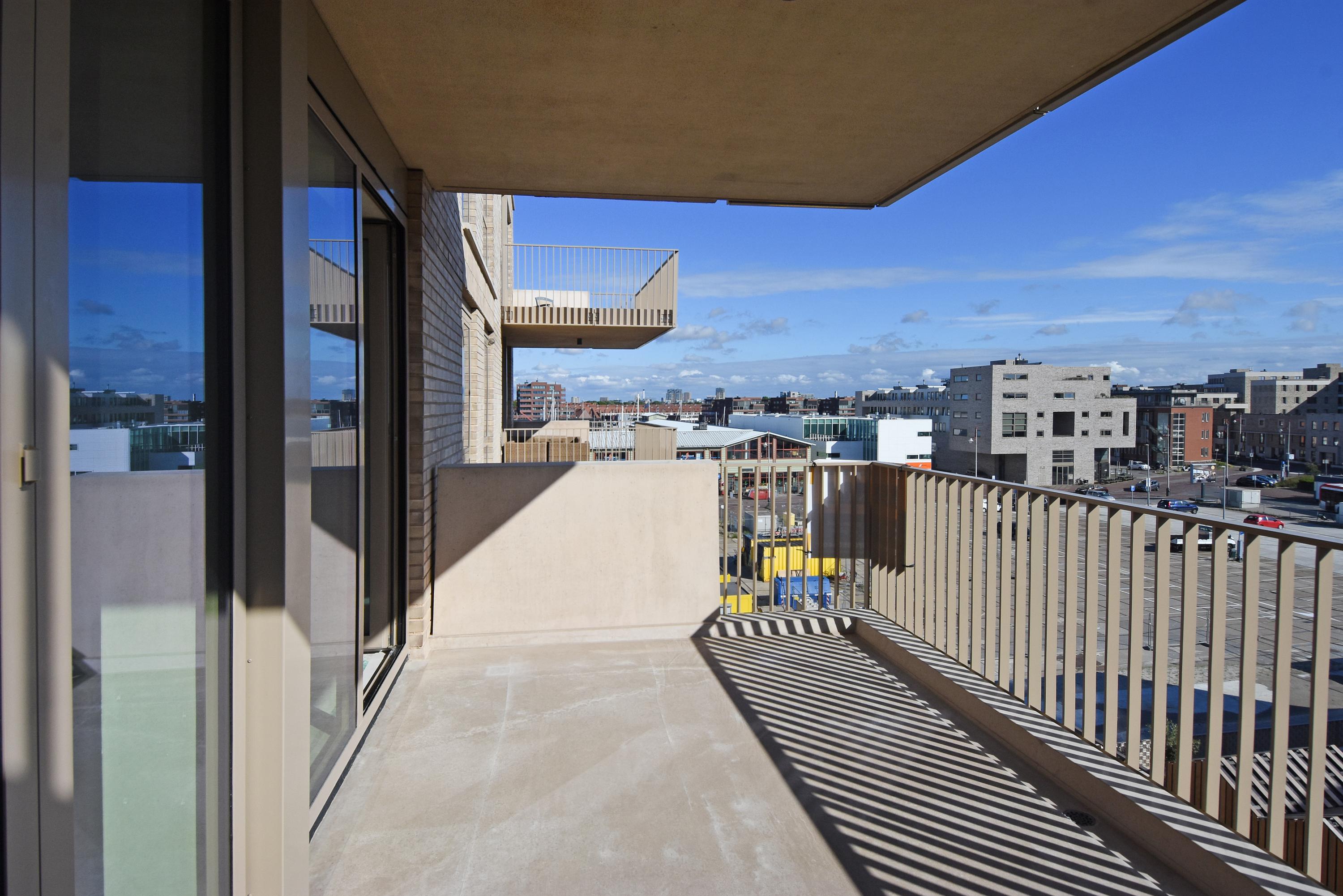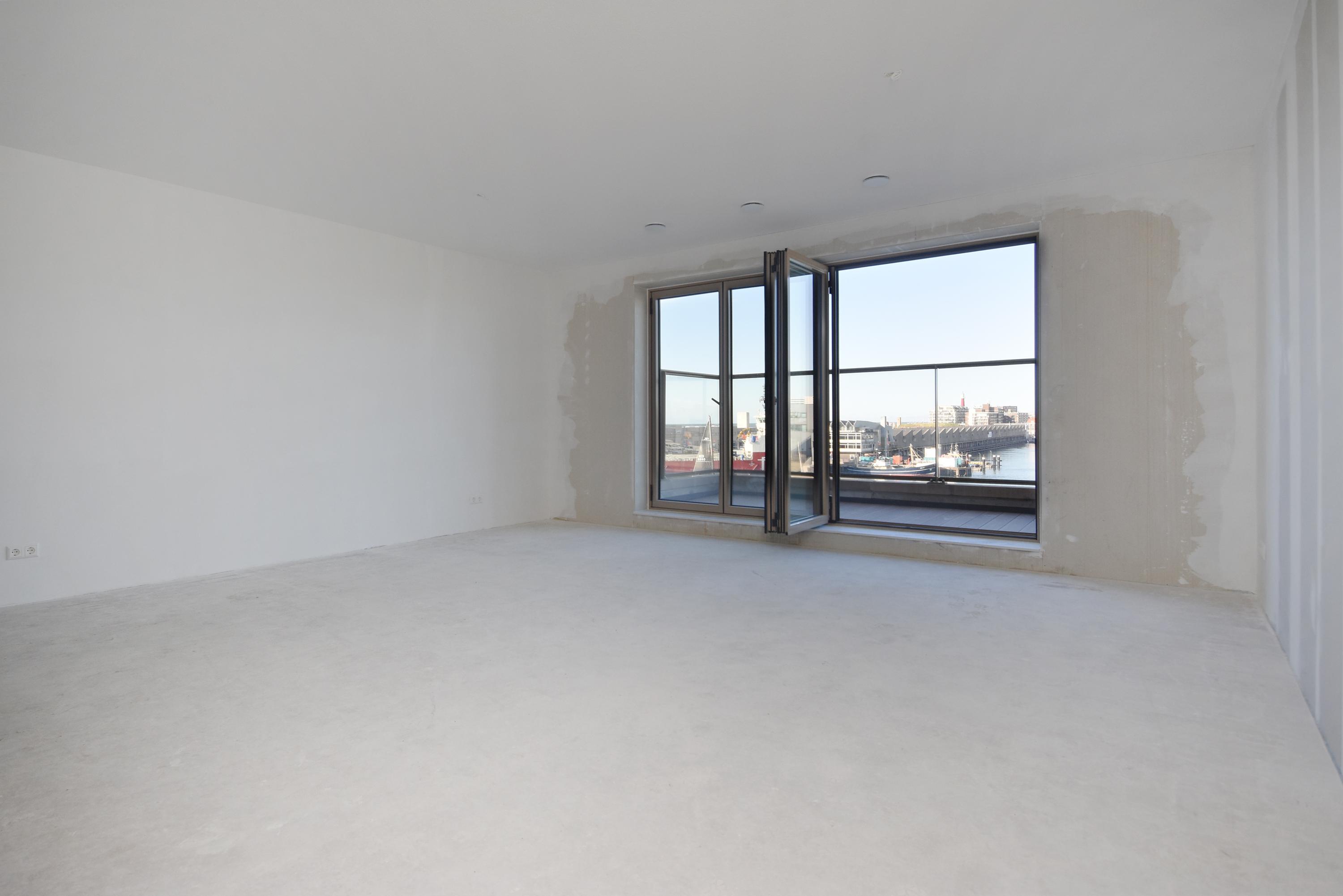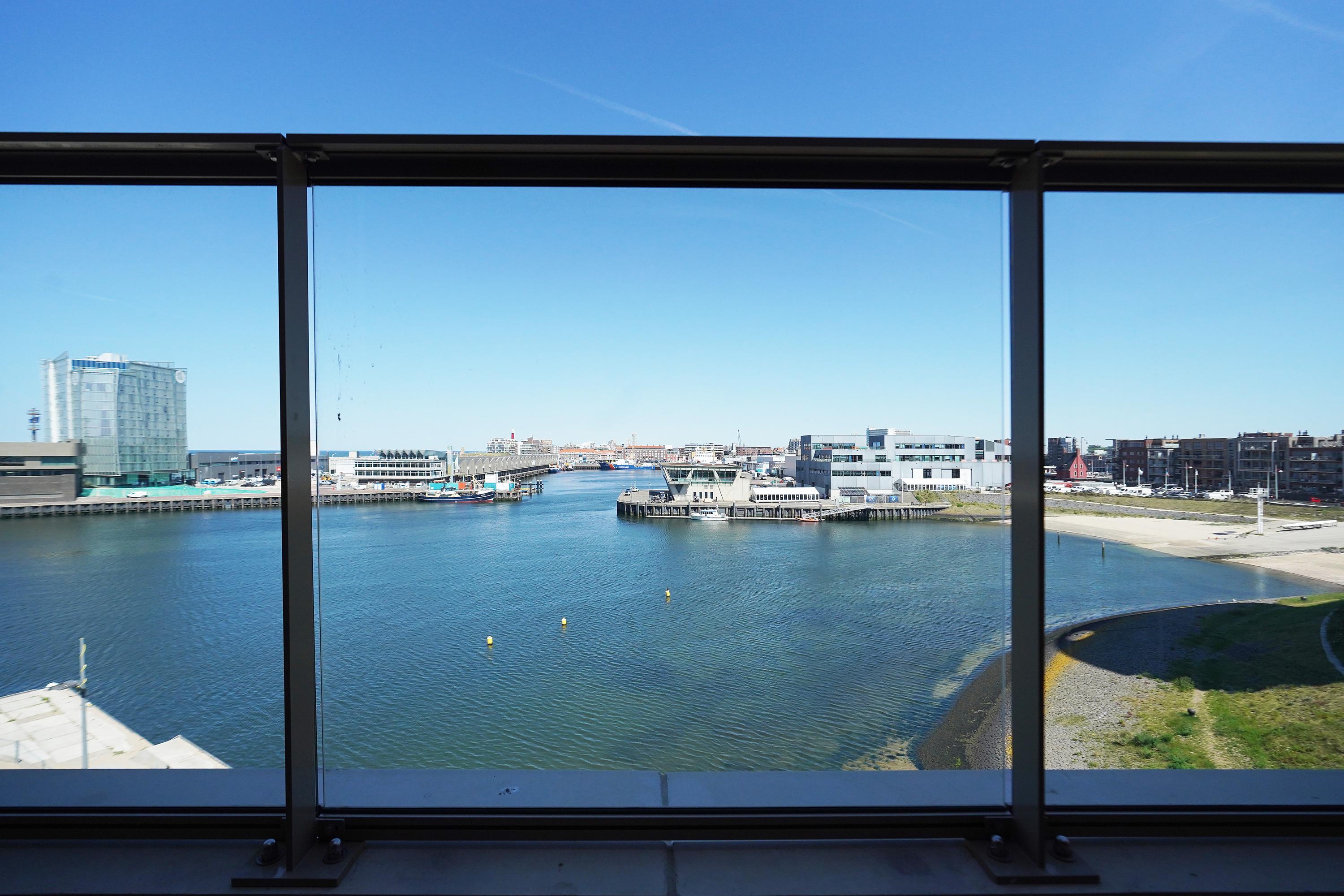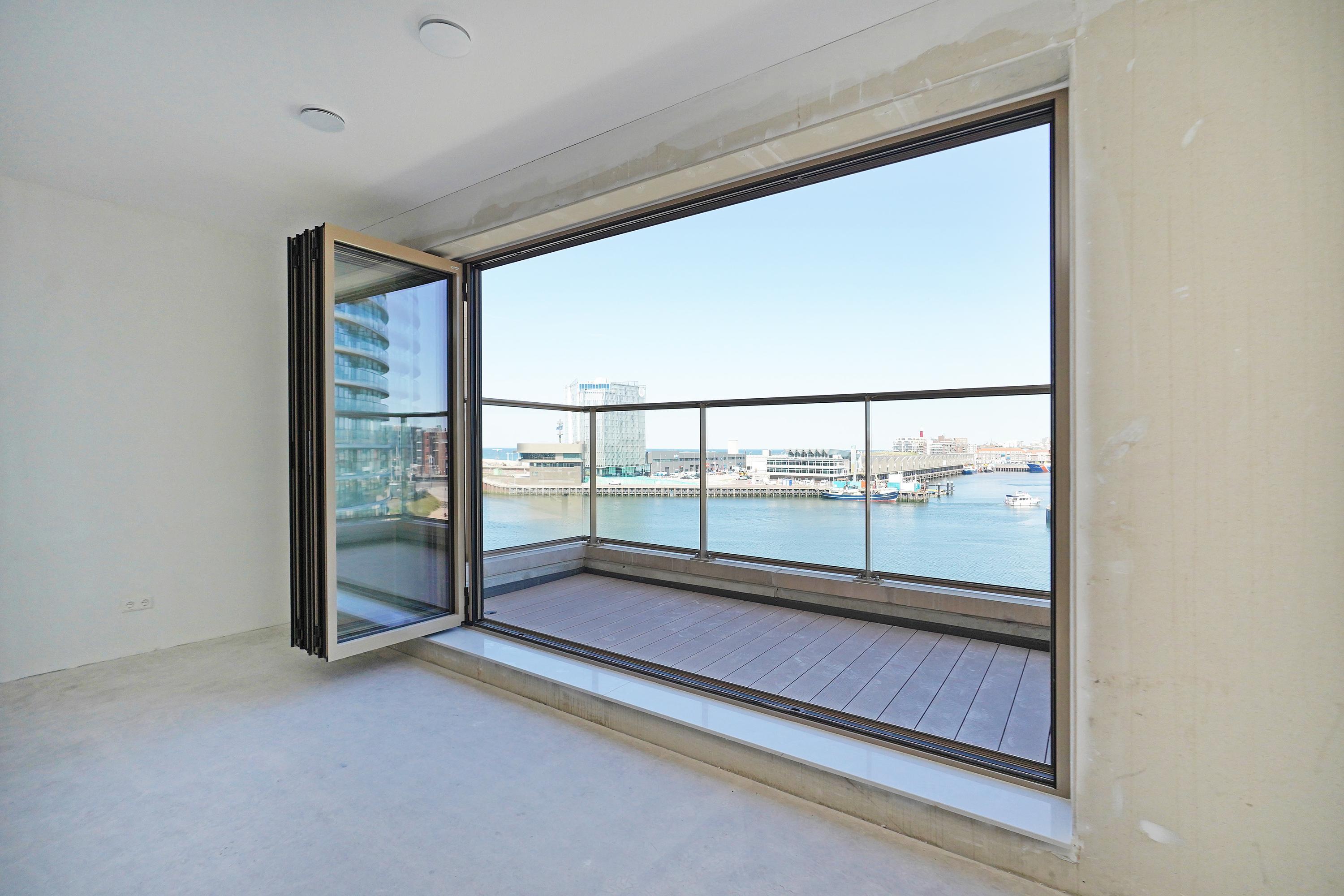 Entrance, hall, modern toilet, modern bathroom with a walk-in shower, washbasin with vanity unit, and towel radiator (Duravit sanitary ware), integrated technical room/storage with a heat pump, ventilation system, and washer/dryer connections. The spacious living room on the harbor side offers a phenomenal view thanks to large windows and the folding/sliding door to the balcony. From the living room and balcony, you have views of the Scheveningen harbor and the sea, a lively view that never gets boring with the arriving and departing fishing boats, pleasure yachts, and numerous water sports enthusiasts.
