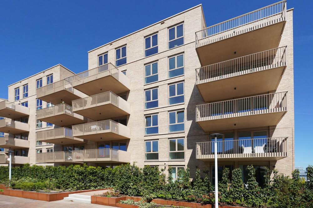 The open NEXT-125 kitchen, with a corner setup, is equipped with a composite countertop and built-in appliances: induction cooktop with integrated ventilation, dishwasher, fridge/freezer combination, Quooker, and combi oven. At the rear of the apartment, there are 2 bedrooms, both of which provide access to the spacious sun-drenched balcony on the south, overlooking the shared courtyard.