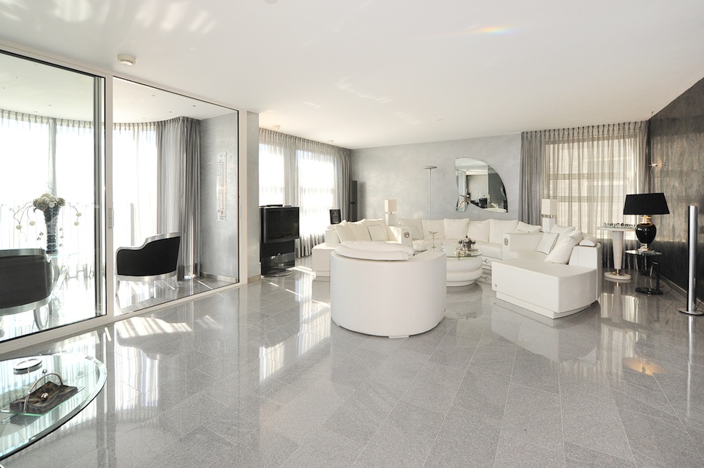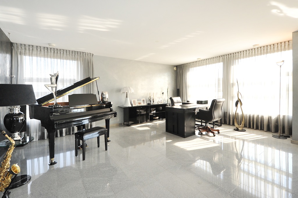 10th floor: private entrance, spacious hall with a coat area, two separate restrooms, generous bedroom (originally two bedrooms) connecting to the private bathroom with a bathtub, shower and toilet, separate kitchen with corner units and a range of appliances, extremely large living room with stunning Chinese travertine flooring, the adjacent corridor opens to a separate dressing room, a second bathroom with a bathtub, shower and vanity, storage room with the central heating unit and laundry station, a separate sauna and large second bedroom.