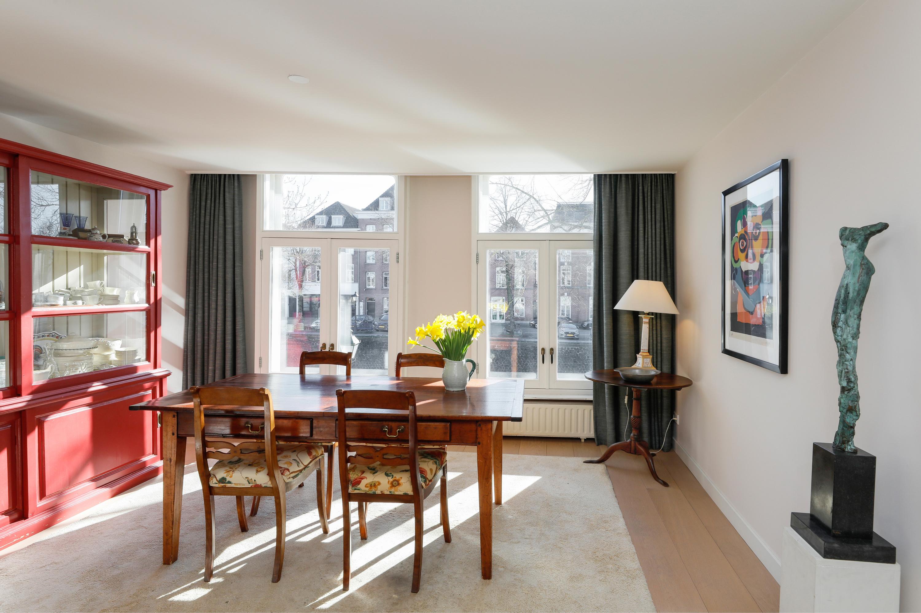 Live in one of the most beautiful locations in Den Bosch's city center, with water at both the front and back. This charming townhouse, dating from around 1670, features two living rooms, two roof terraces, a private garage, an elevator, and a beautiful view of the Brede Haven.