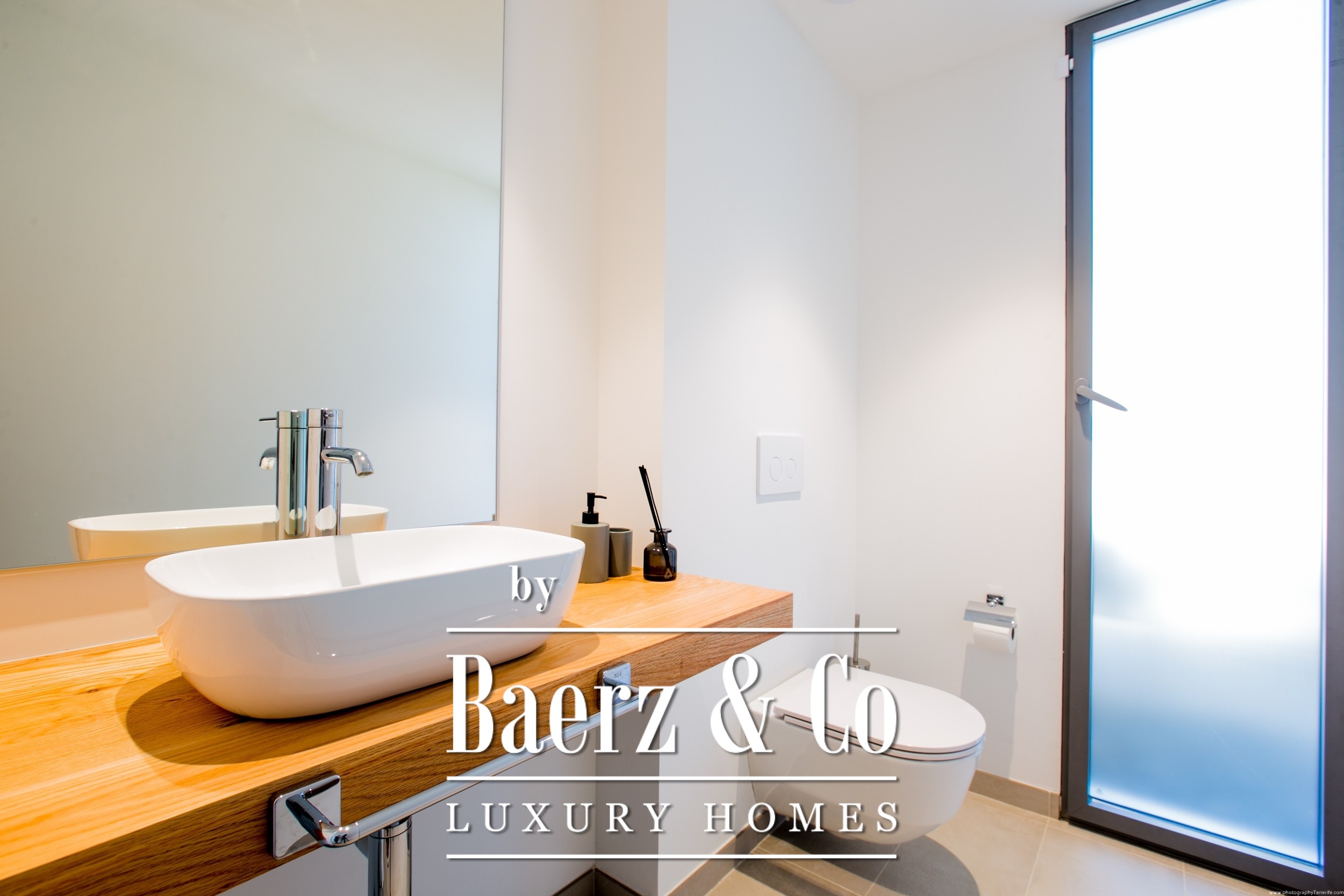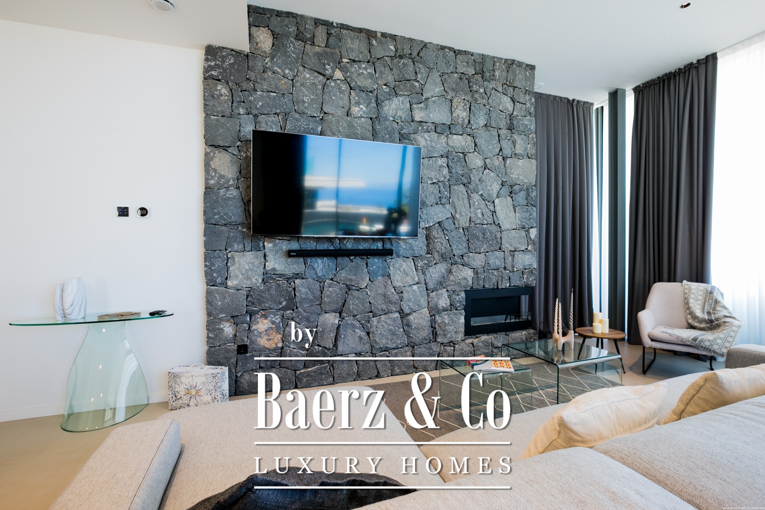 The first floor houses the master suite, where refined finishes, a generous bathroom, and a dressing room align with uninterrupted views, emphasizing privacy and comfort. Below, a private garage for two cars and a dedicated technical room provide convenience and security. Fitted wardrobes, air conditioning, a laundry room, and an alarm system attest to the thoughtful detailing throughout.