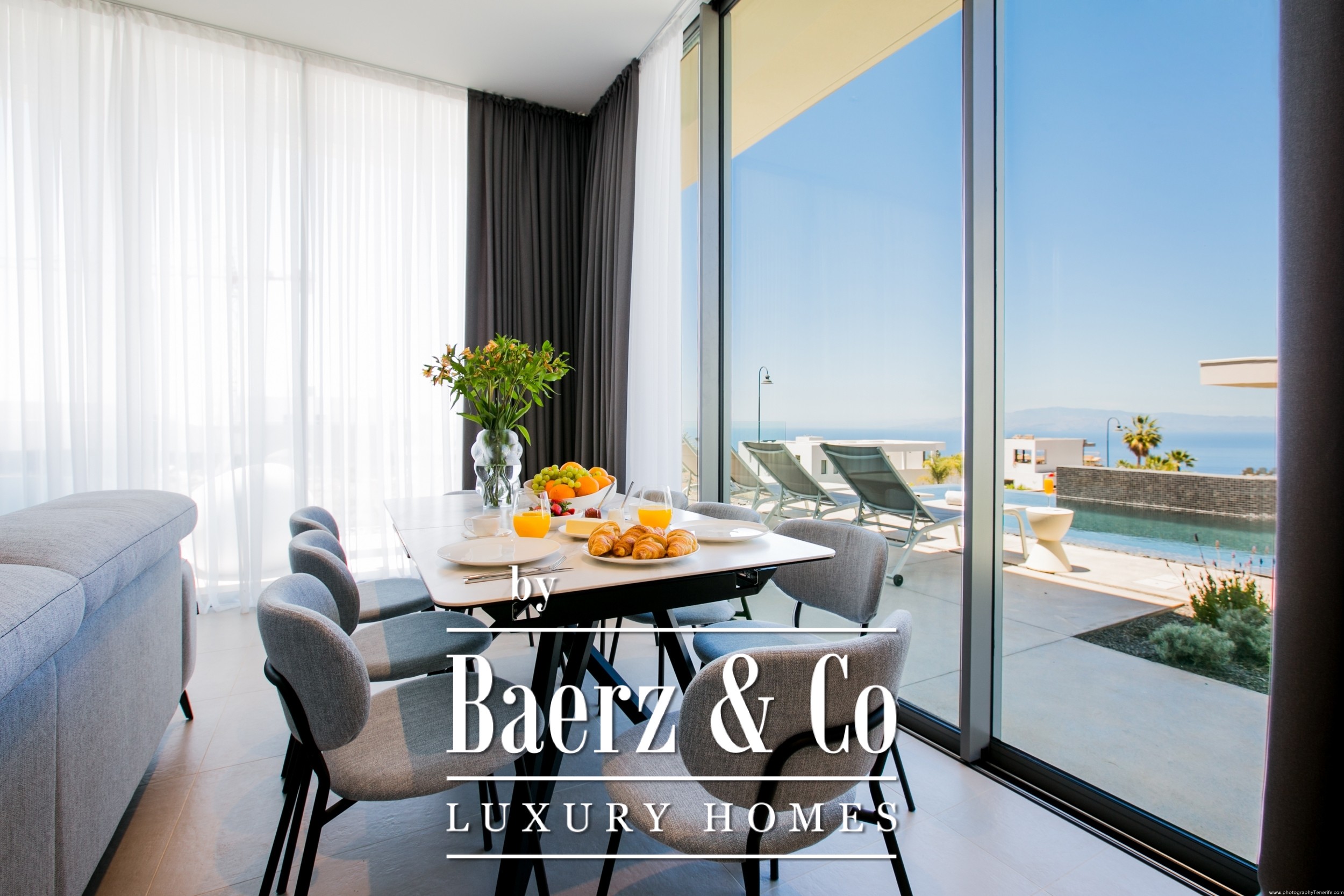 The main level welcomes with an airy living and dining area framed by panoramic seascapes, creating a serene backdrop to daily life. The kitchen features a central island, inviting both culinary inspiration and connection, while two bedrooms each grant en-suite privacy. Expansive terraces flow outside, surrounding a heated private swimming pool that extends leisure beneath the open sky as the ocean forms a constant horizon.