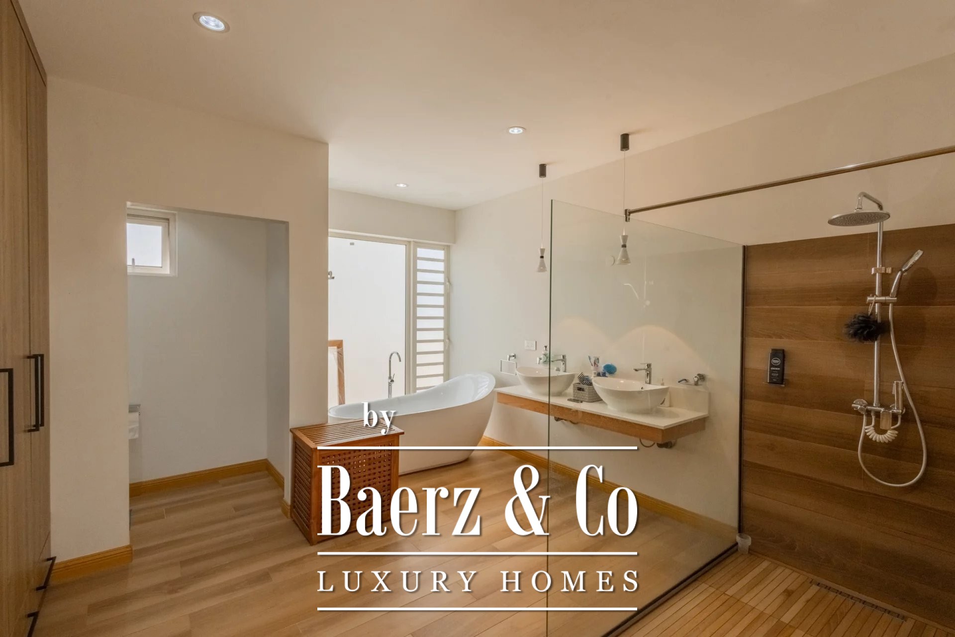 The villa’s layout features four bedrooms and four bathrooms, all infused with natural light and garden views, creating a sense of openness and calm. The double-height living room flows seamlessly into a fully equipped open-plan kitchen, encouraging both relaxation and convivial gatherings. Impeccable finishes and carefully selected furnishings anchor each space with a quiet sense of refinement.