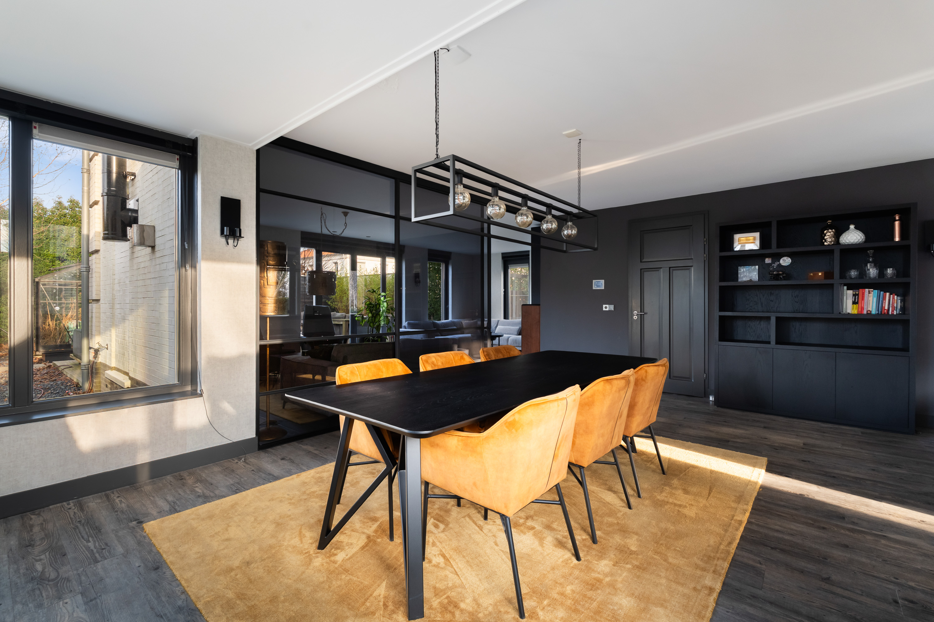 The living room is spacious and wonderfully bright. A true eye-catcher is the glass sliding wall with smoked glass, which stylishly separates the living room from the TV and reading room. This feature provides additional privacy without compromising the open character of the living space.