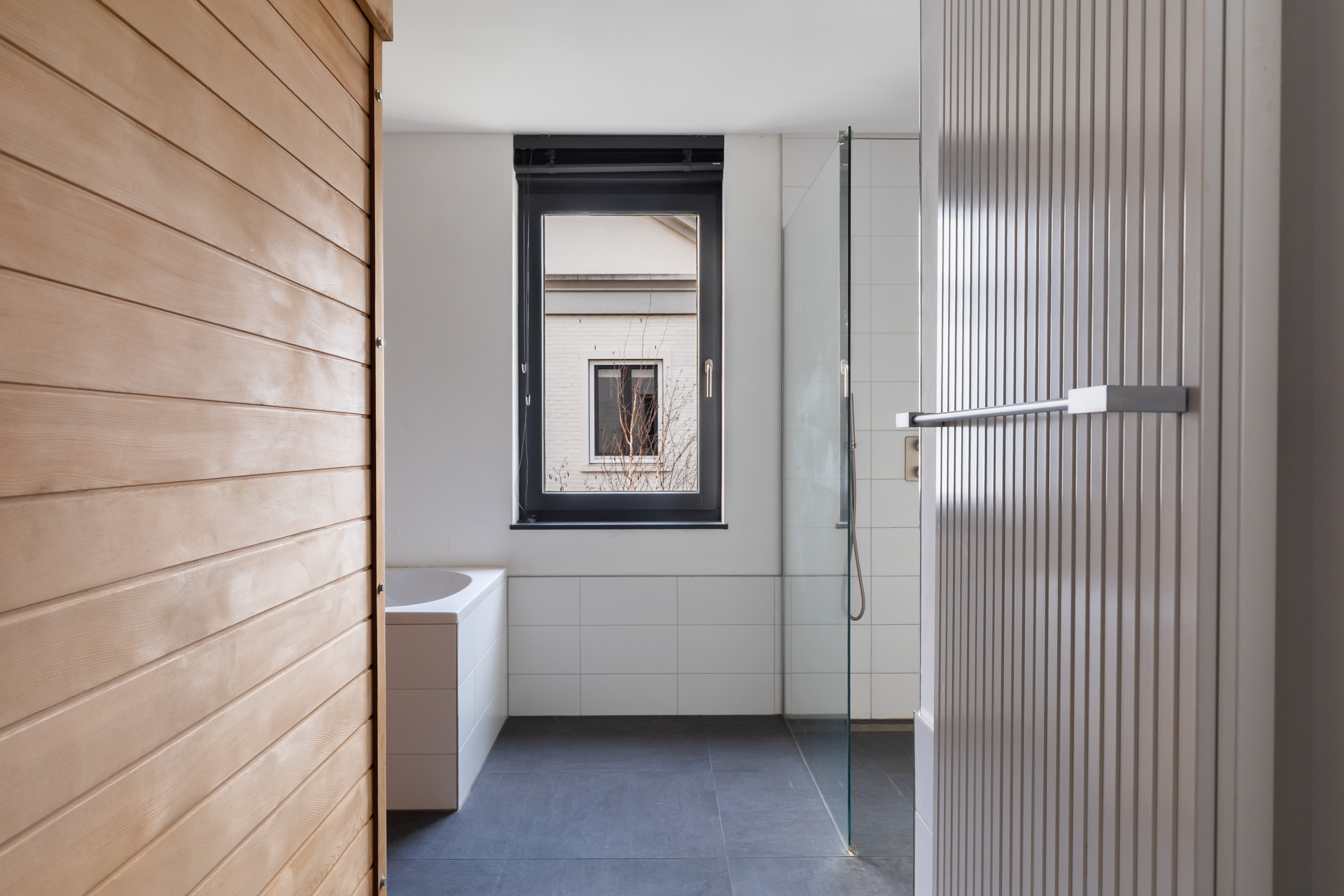 Glass sliding wall with smoked glass between living and reading room