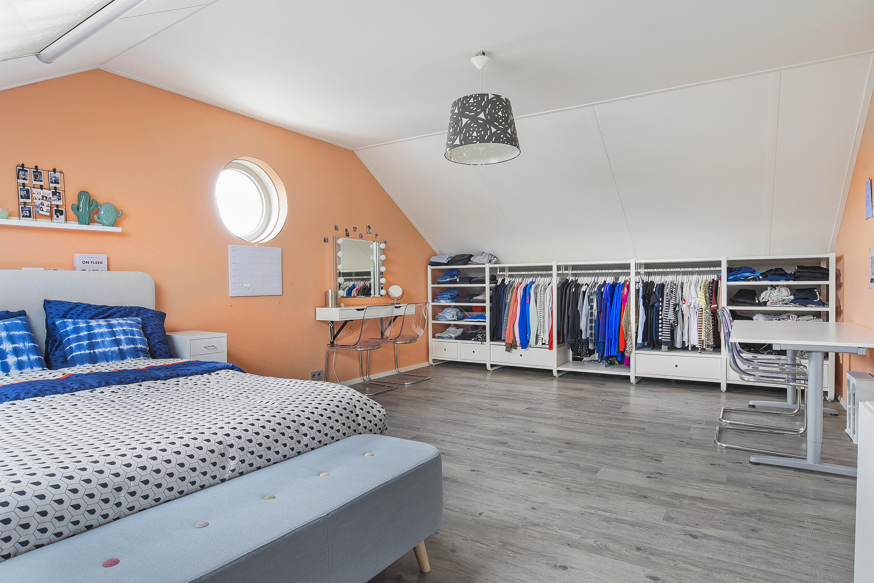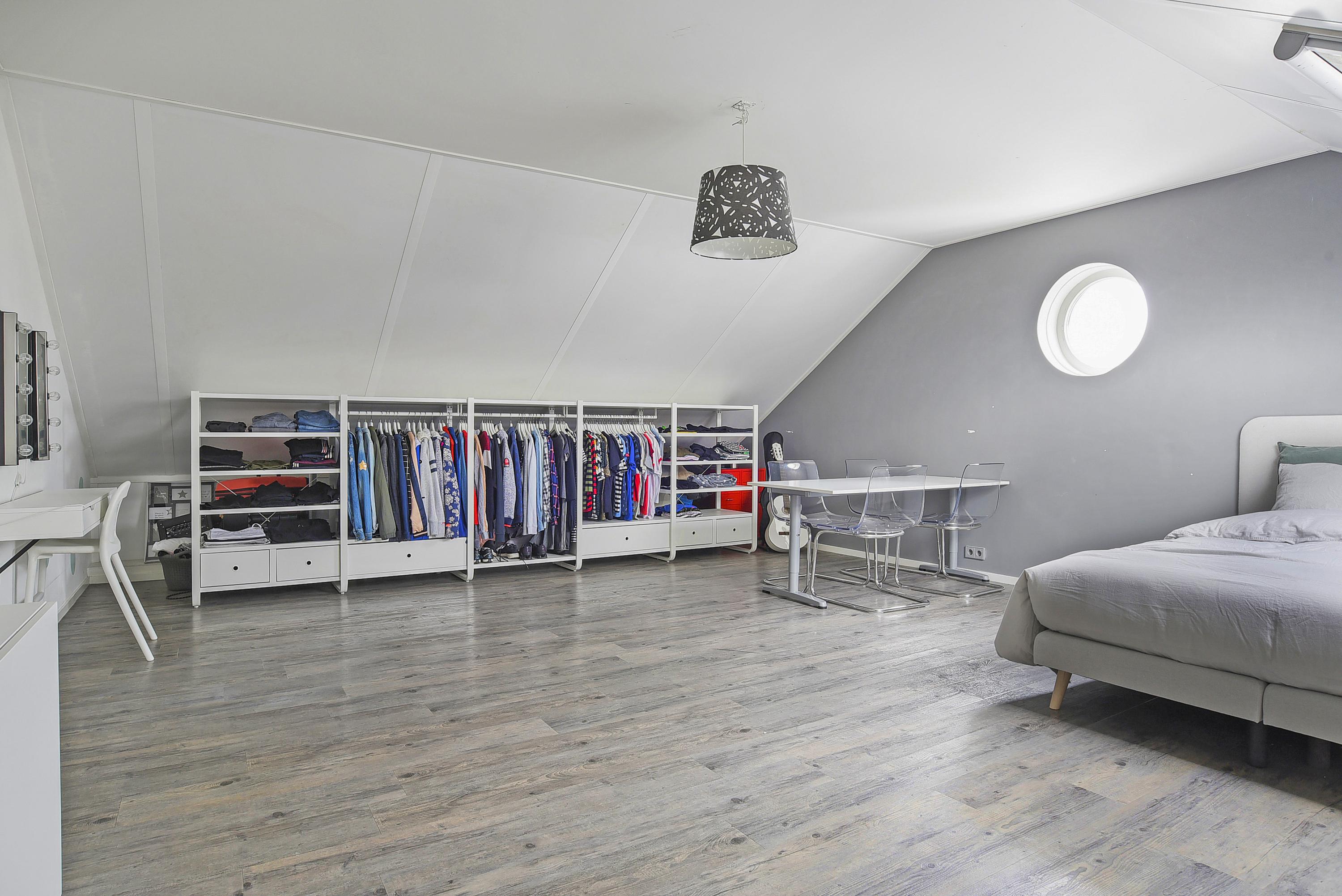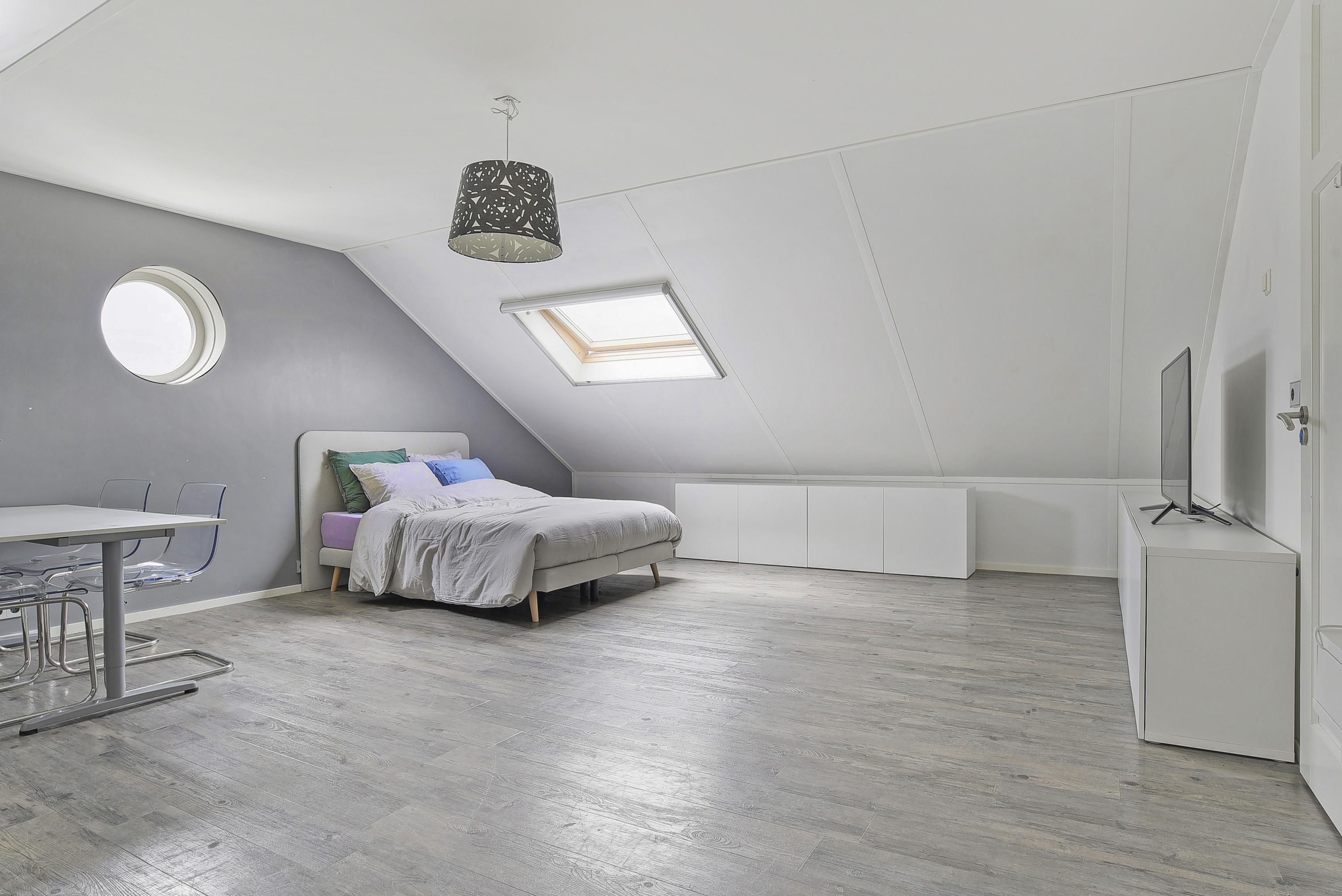 The second floor is surprisingly spacious and offers two large bedrooms with additional storage behind the knee walls and playful round windows. This floor is ideal for guests, older children or working from home, and even offers enough space to create a third bedroom.