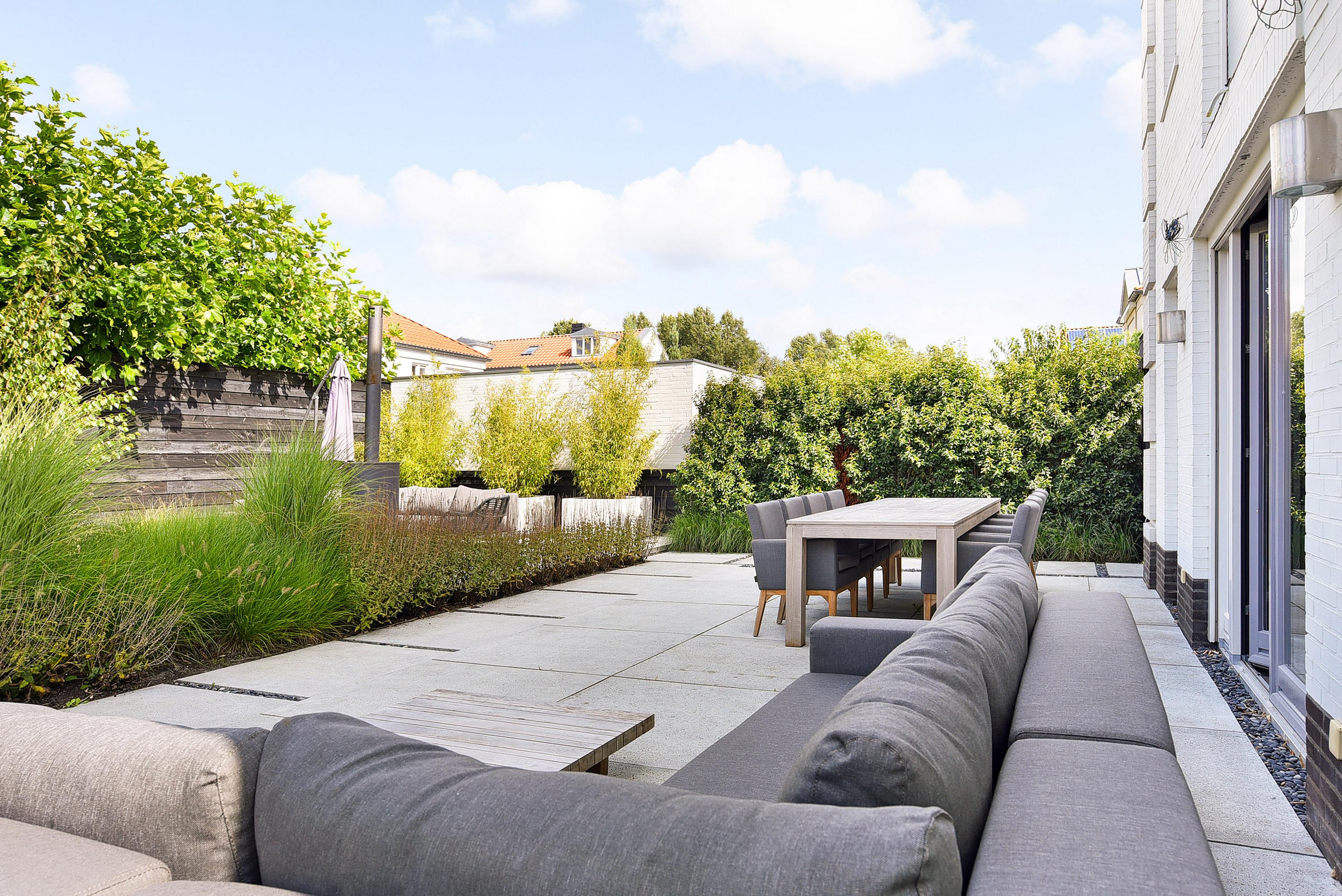 French doors provide access to the beautifully landscaped garden that surrounds the property. Multiple terraces, partly covered, allow you to choose sun or shade at any time of day. Mature greenery ensures optimal privacy.