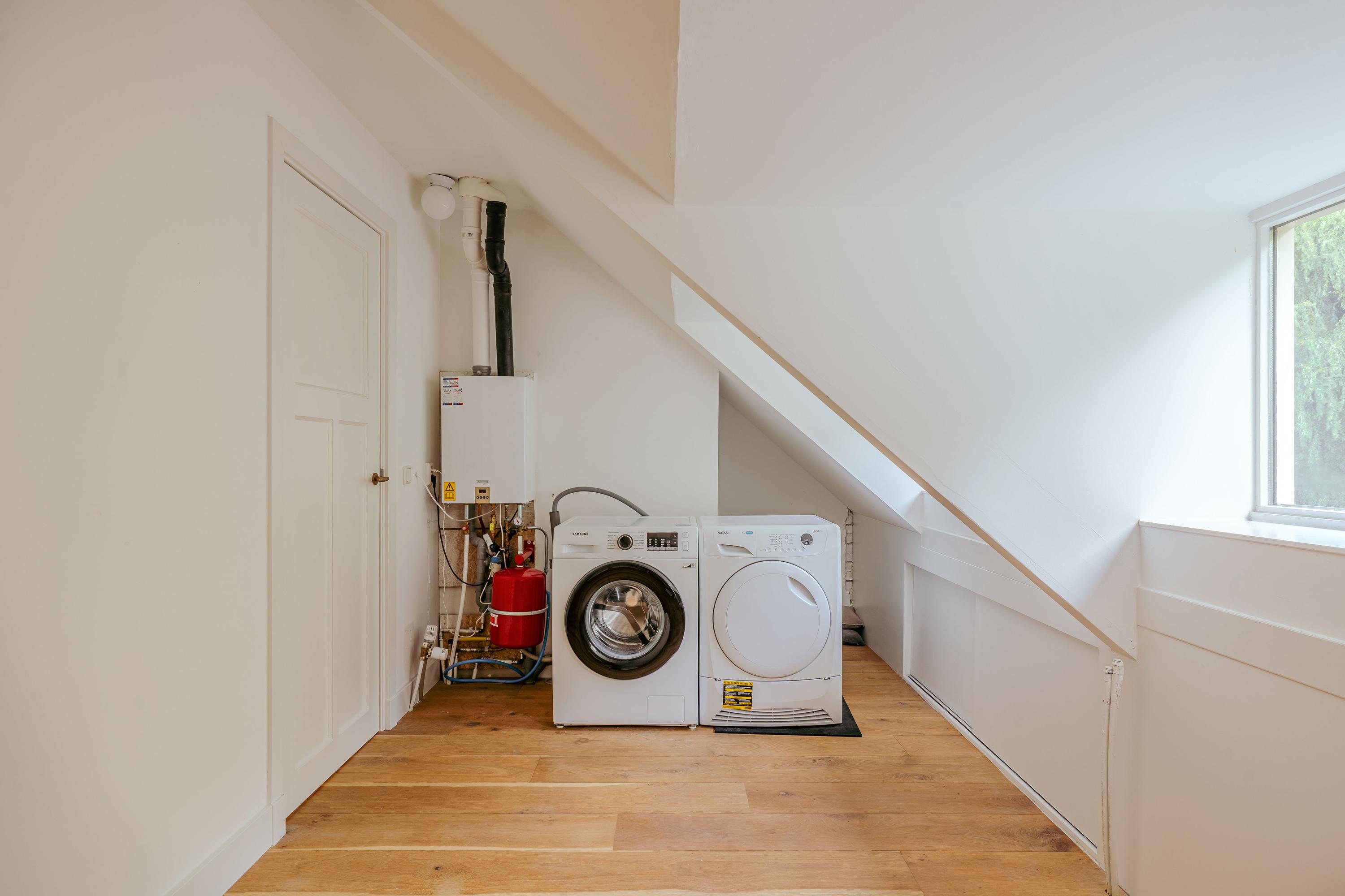 The second floor offers a spacious bedroom (which can be divided into two rooms if desired) with a new dormer window (2021) featuring triple glazing and electric sun blinds. In addition, there is a second room, ideal as a guest room or study, with connections for a washing machine and dryer. This floor also includes a second bathroom with walk-in shower, washbasin with cabinet, and underfloor heating.