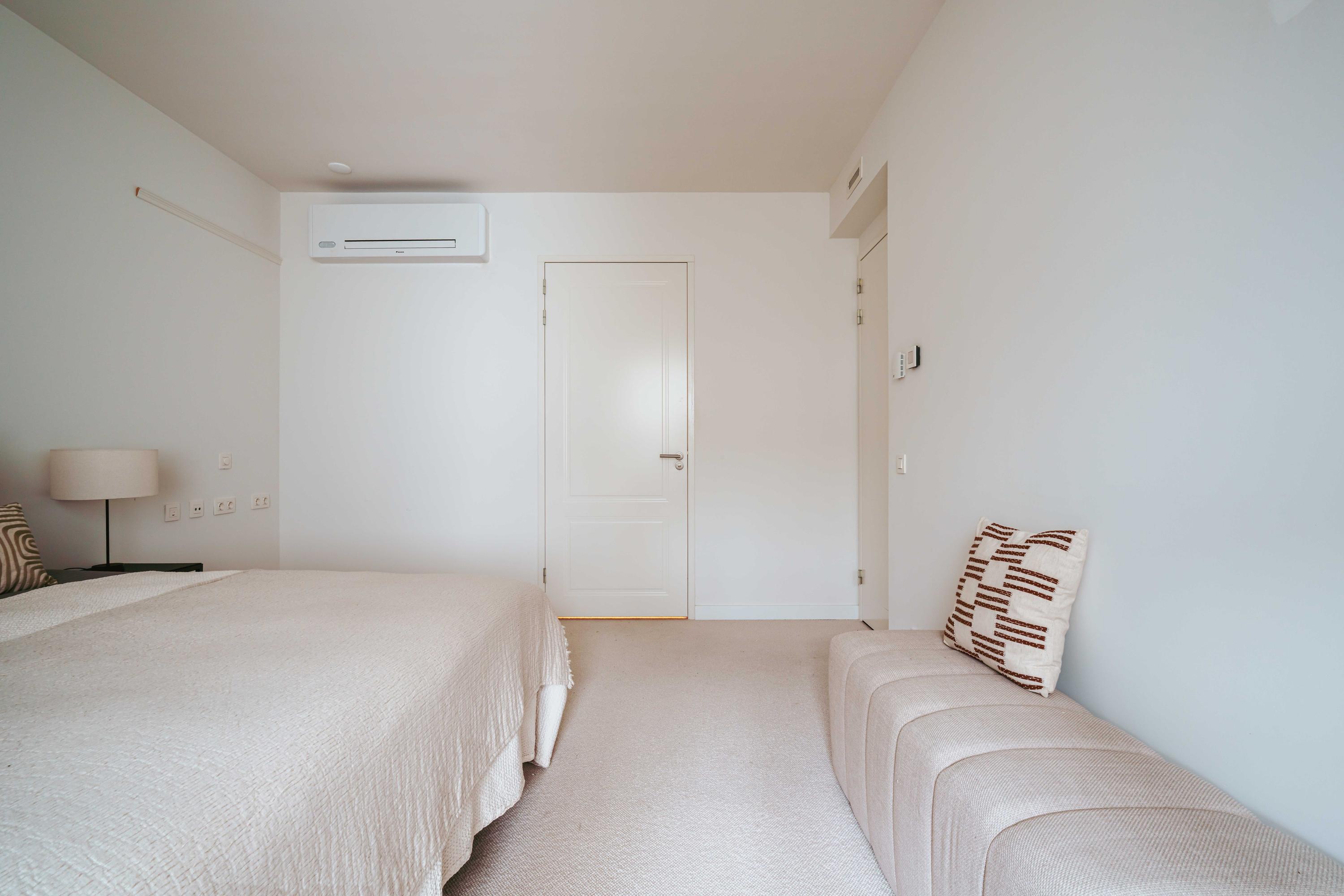 The apartment is equipped with modern technologies such as a Heat Recovery Ventilation (HRV) and Heat Pump system. Enjoy the comfort of underfloor heating and cooling throughout the property. Furthermore, the living room also features an air conditioning unit.