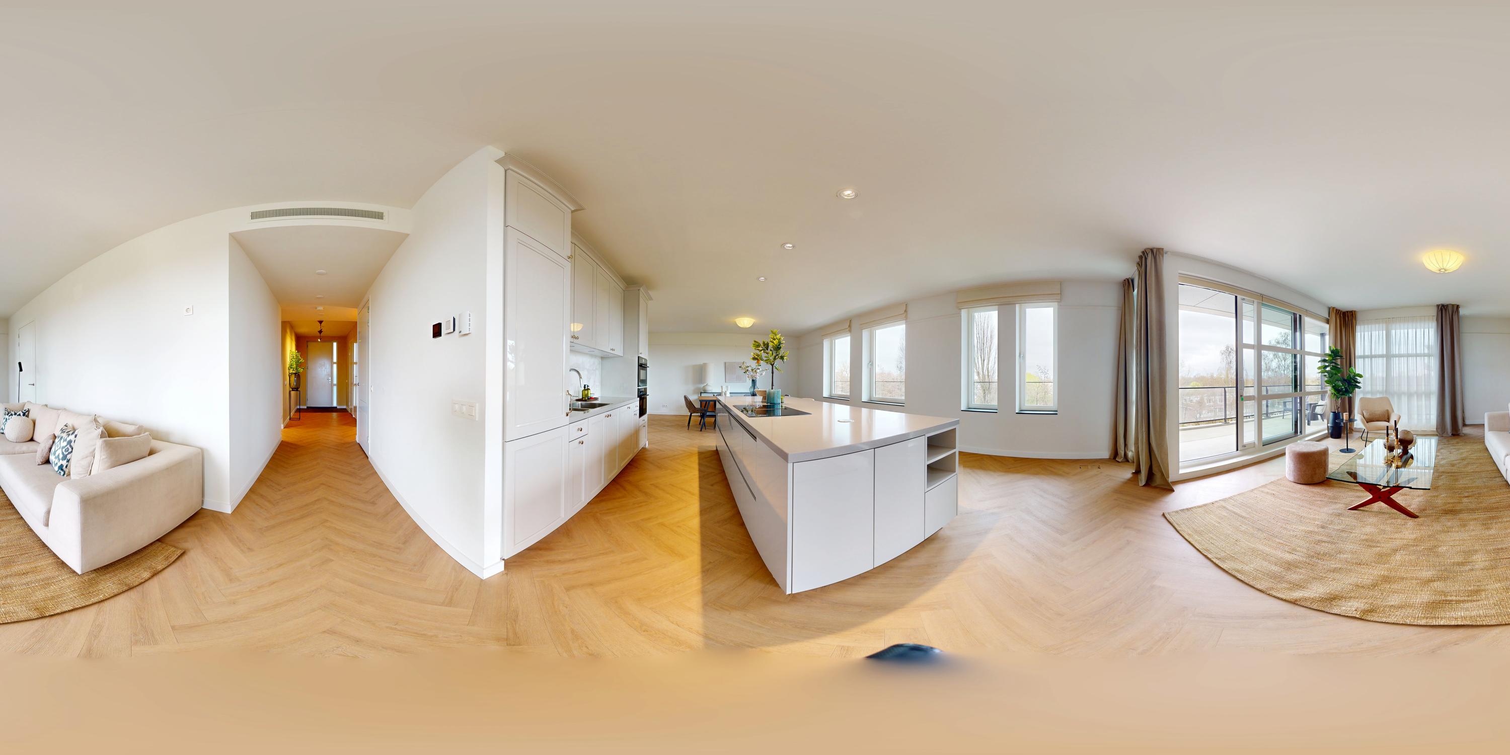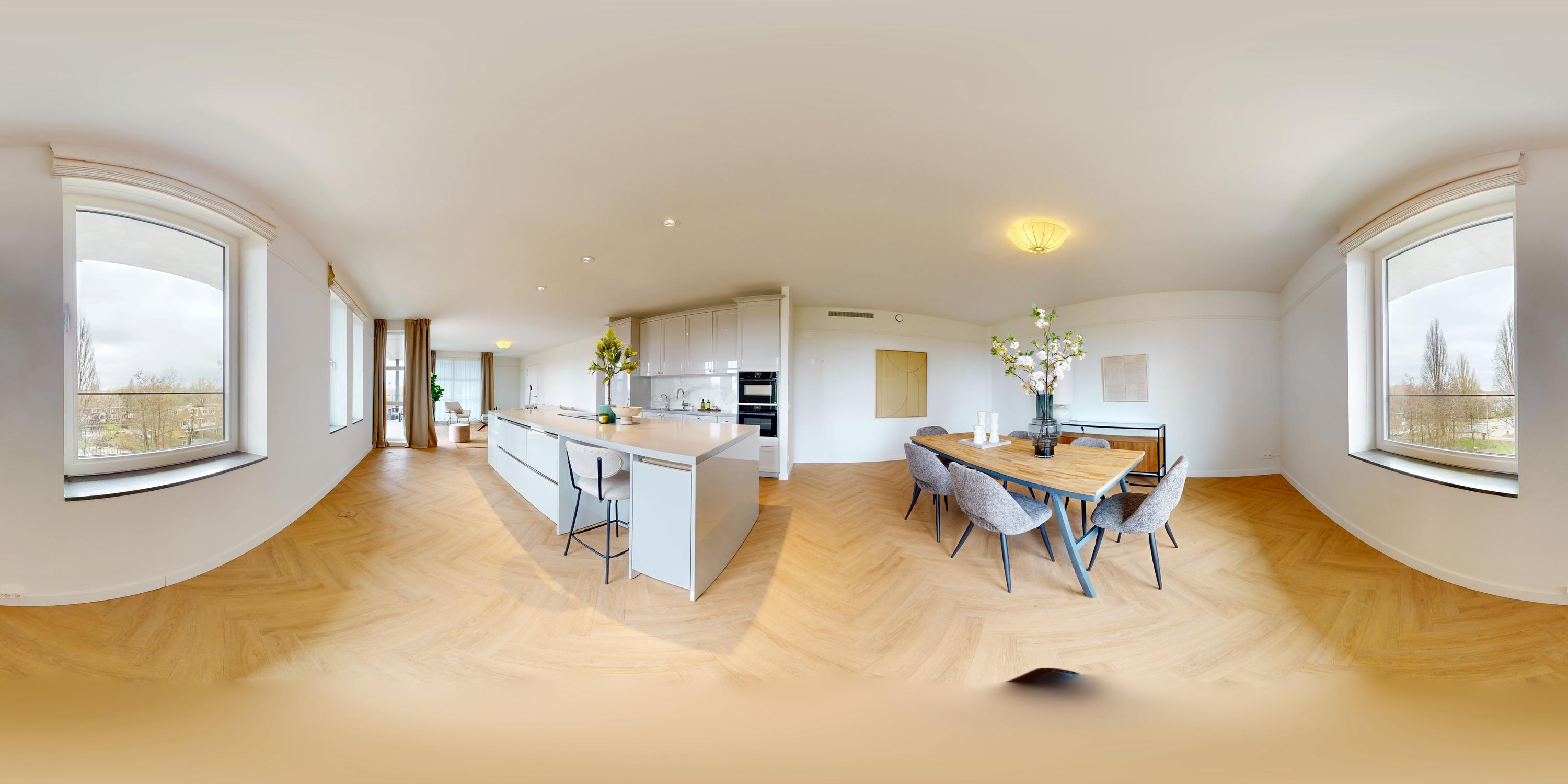 The beautiful, large living room receives abundant natural light through its many windows. The Siematic kitchen island is a true centerpiece, equipped with various built-in appliances including an induction hob with integrated extraction, oven, combination oven-microwave, Quooker, and a large refrigerator. There is also a separate pantry with space for a wine climate cabinet and freezer. The sunny balcony faces southwest, providing a delightful spot to relax and enjoy unobstructed views.