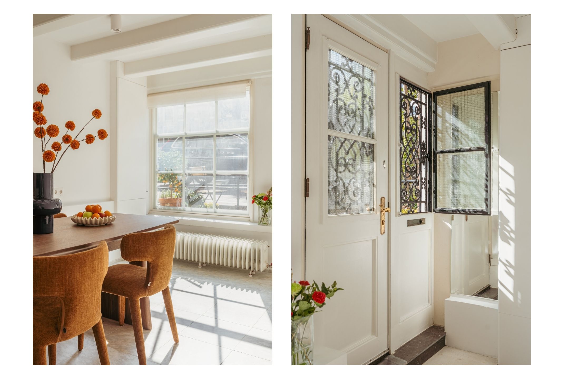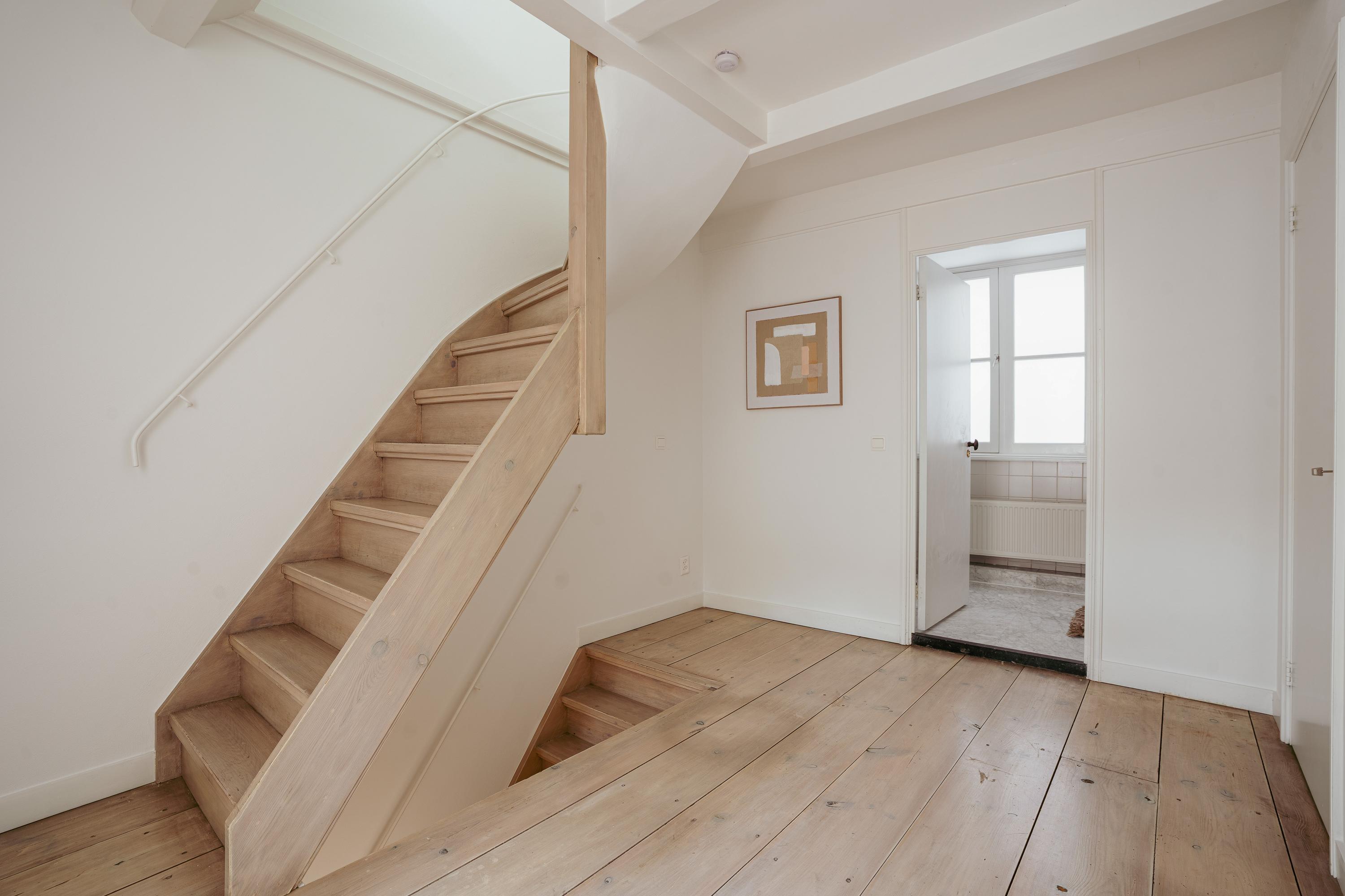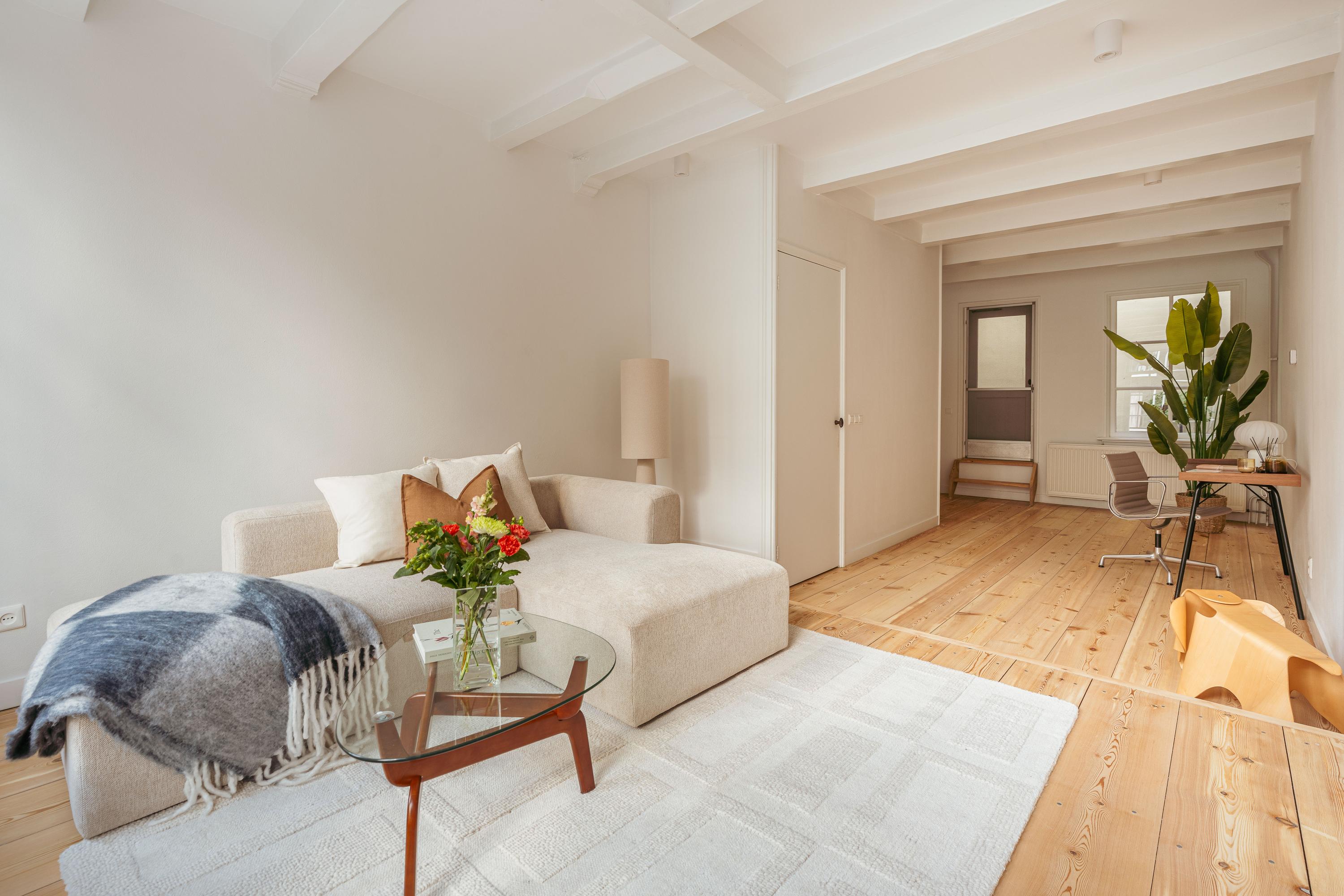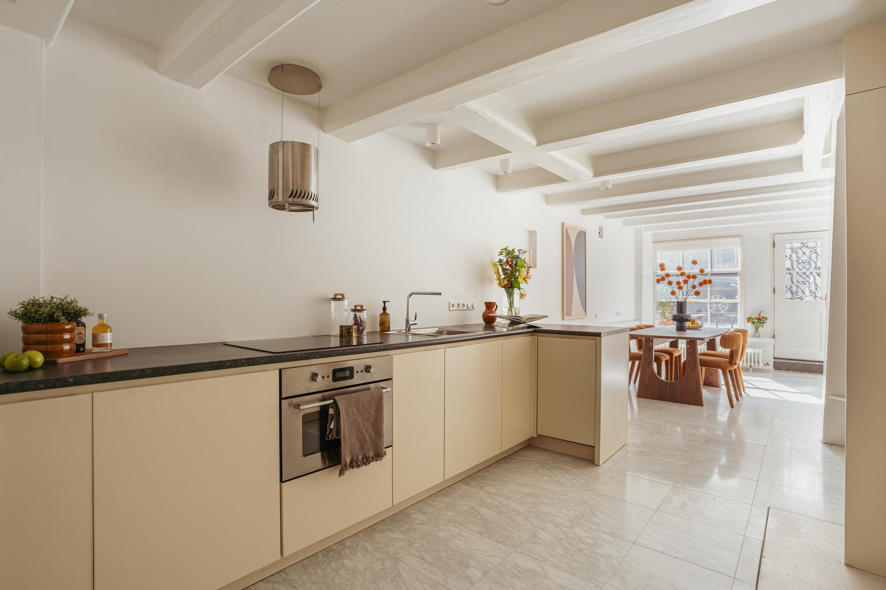 Through your private front door, you enter the inviting kitchen-diner on the ground floor. This level is both practical and atmospheric, with a spacious sitting area at the front and the kitchen at the rear. The kitchen is equipped with various built-in appliances and offers plenty of cupboard space on both sides. At the back, there is a guest toilet. In front of the house, a charming seating area has been created, where you can enjoy the sun and lively canal views throughout the day.